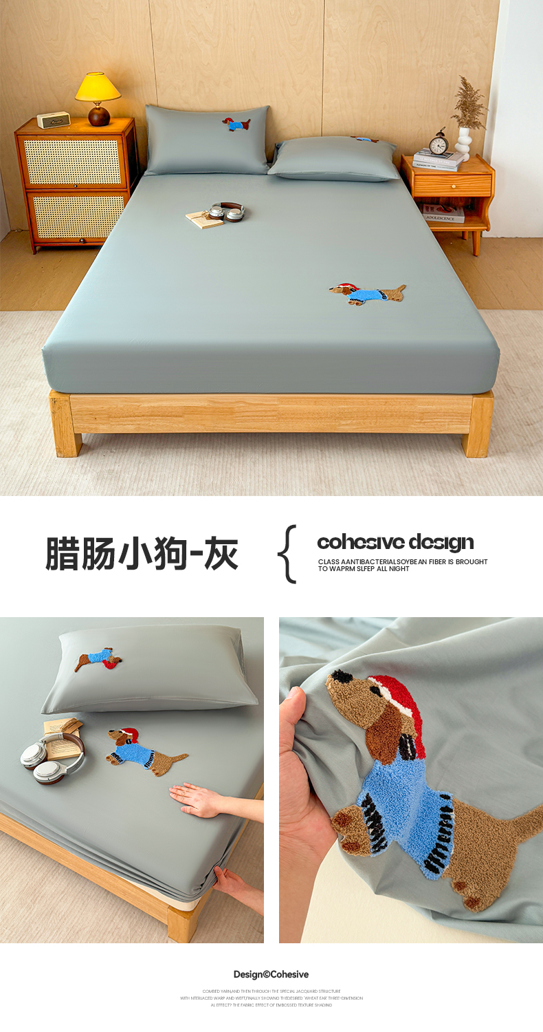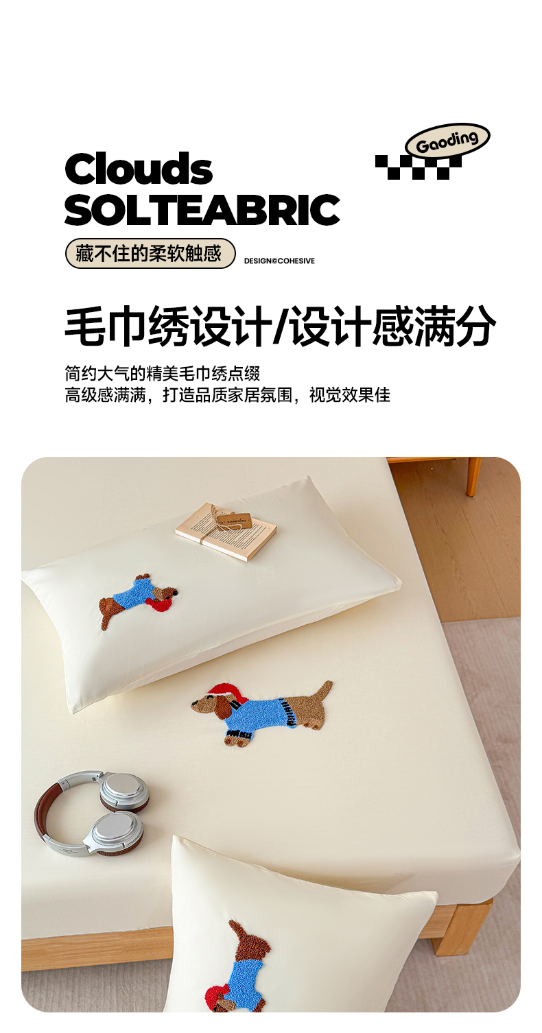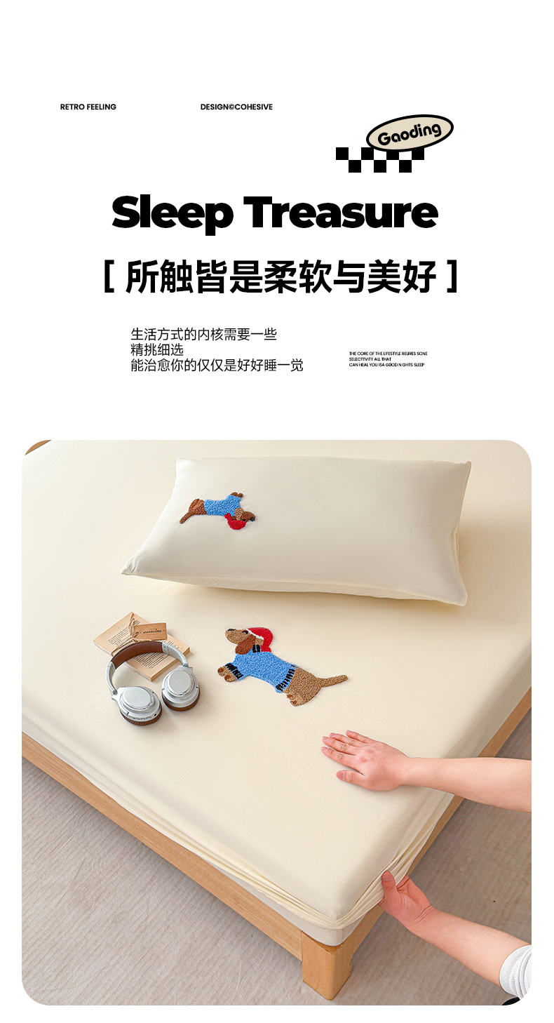 • 91家纺网 家纺一手货源 找家纺 澳梵家居 2025新款A类全棉毛巾绣床笠 腊肠小狗-白