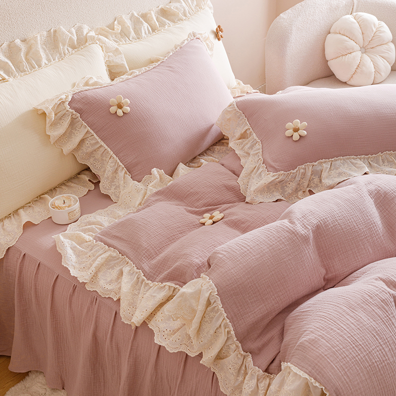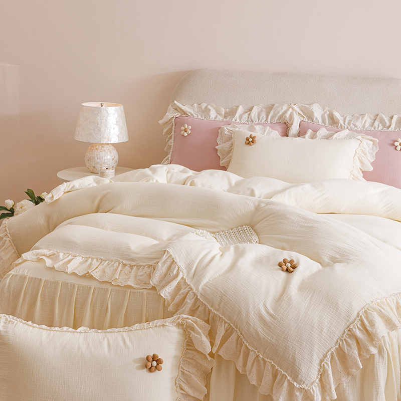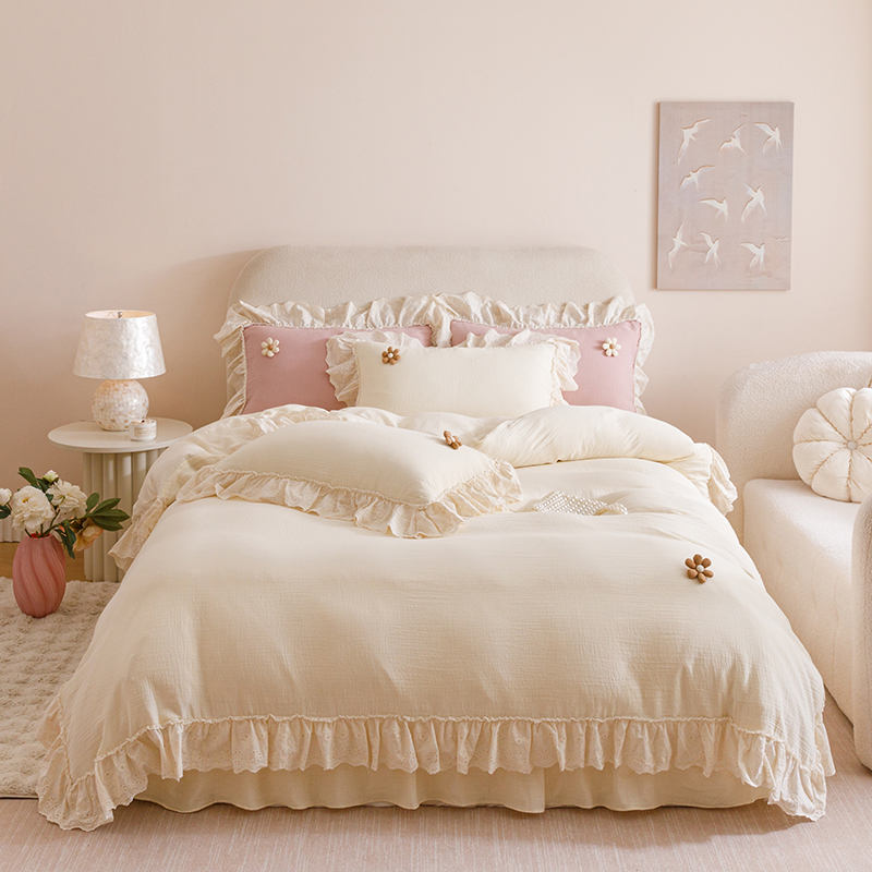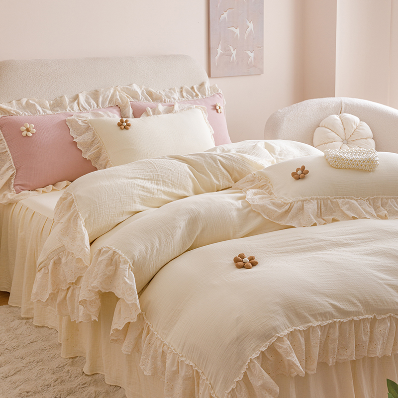 总北纬27度 2022法式双层花边全棉夹棉床裙四件套直播爆款,高级白,公主粉,海洋蓝,可爱黄