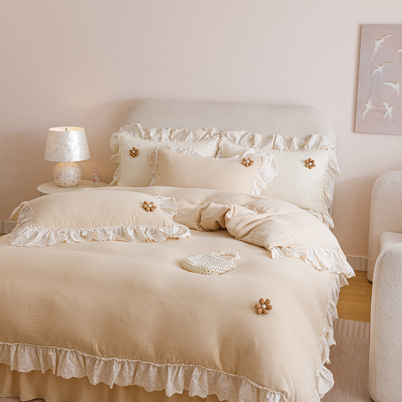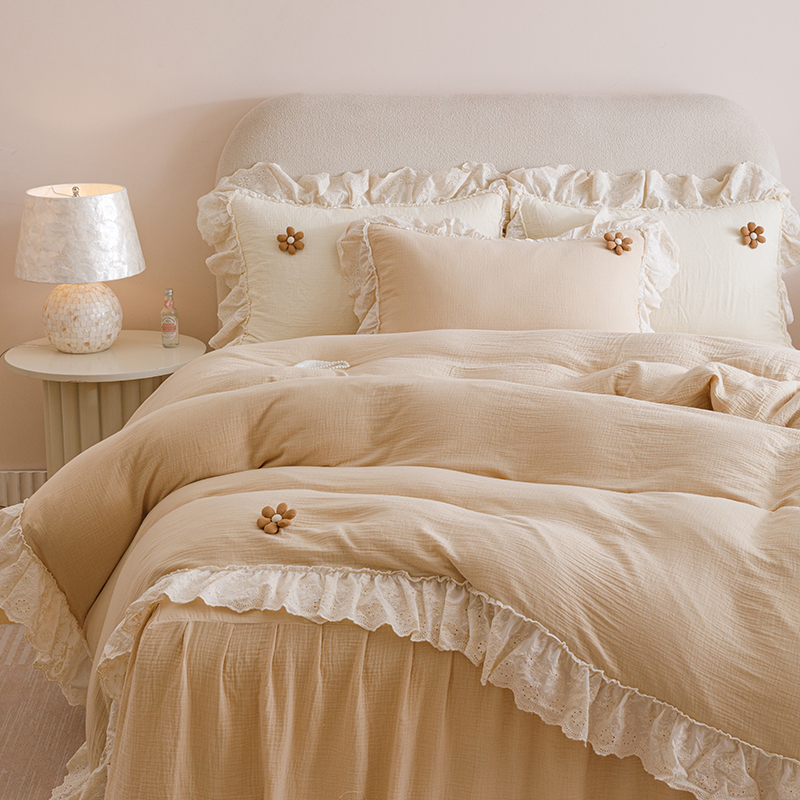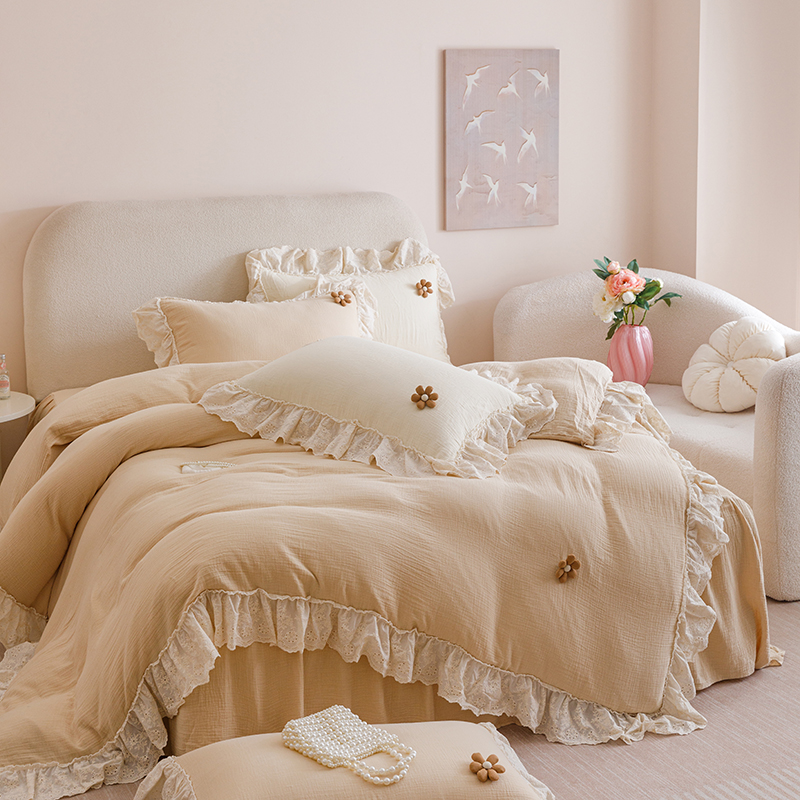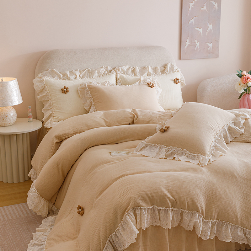 北纬27度 2025新款法式全棉刺绣花边双层绉绉纱四件套-芳华满庭 芳华满庭-浅咖