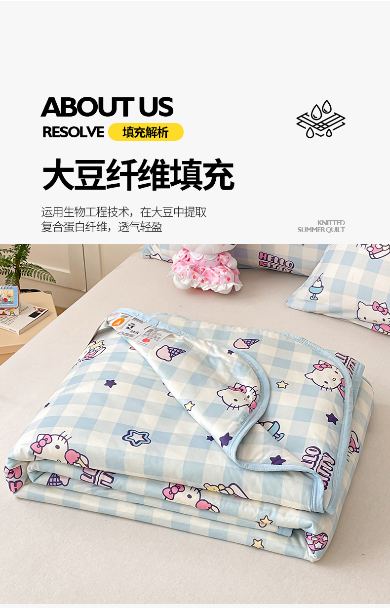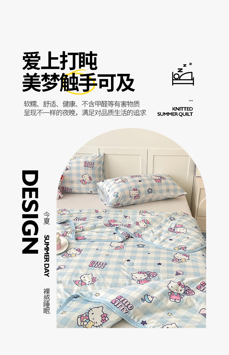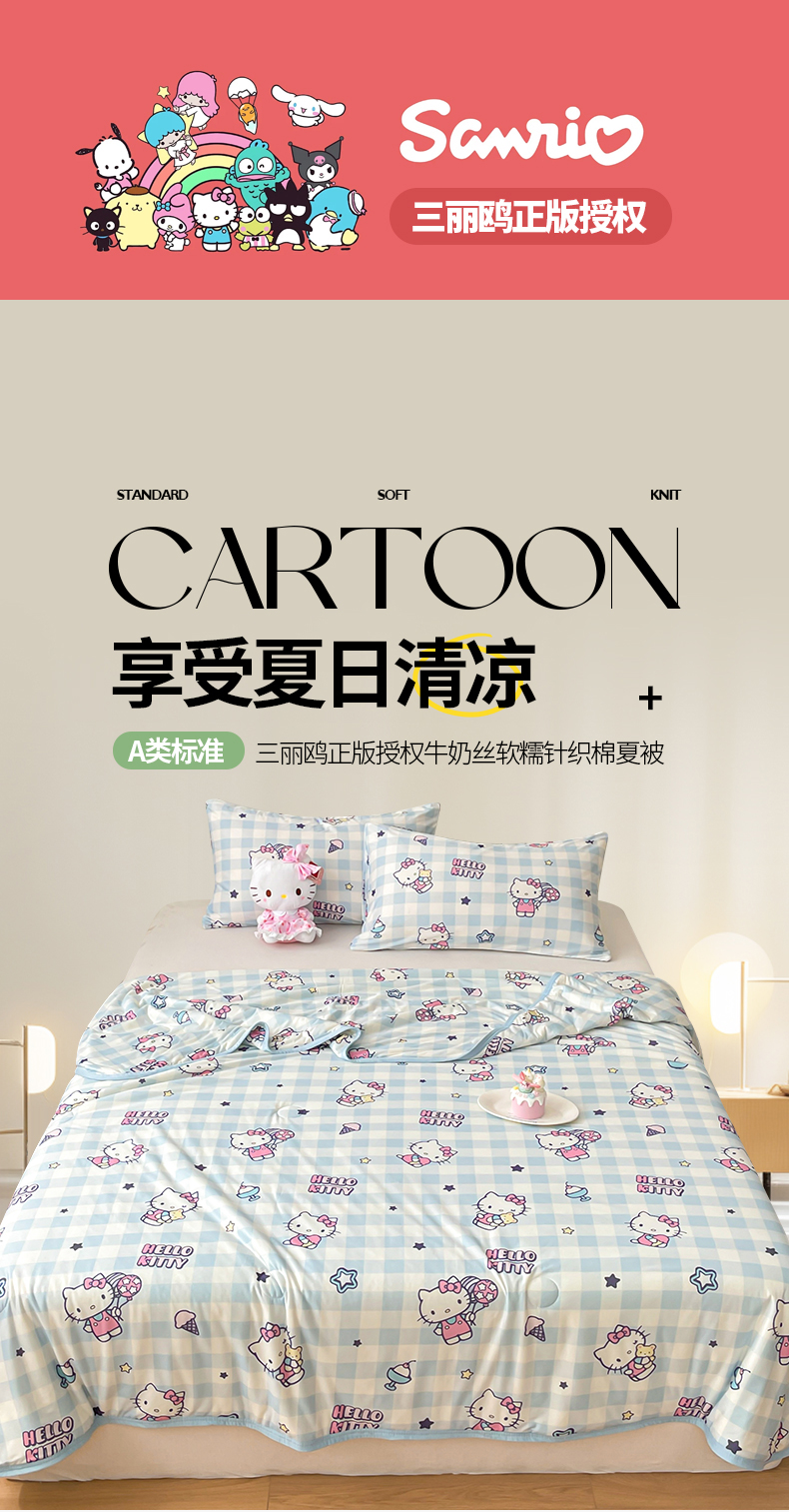 • 91家纺网 家纺一手货源 找家纺 桃子家居 2025新款A类三丽鸥正版授权高品质牛奶丝软糯针织棉大豆夏被系列 针织棉三丽鸥-蓝格kitty