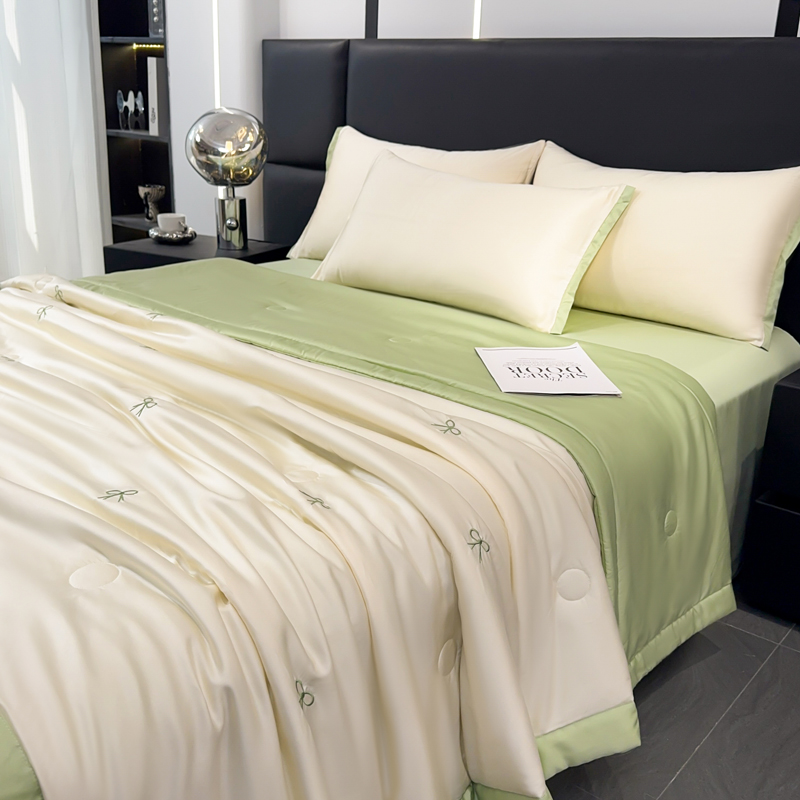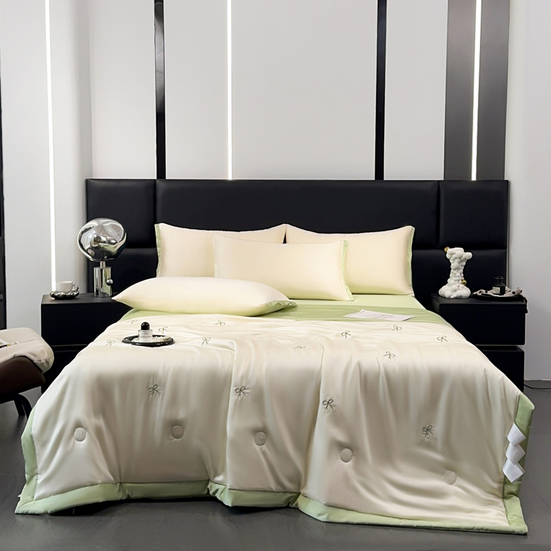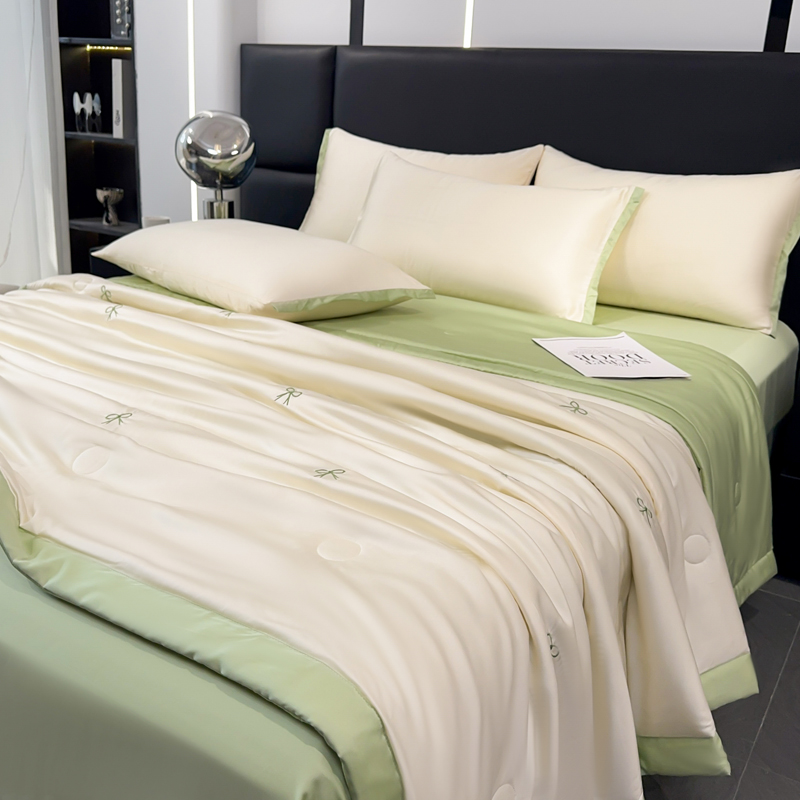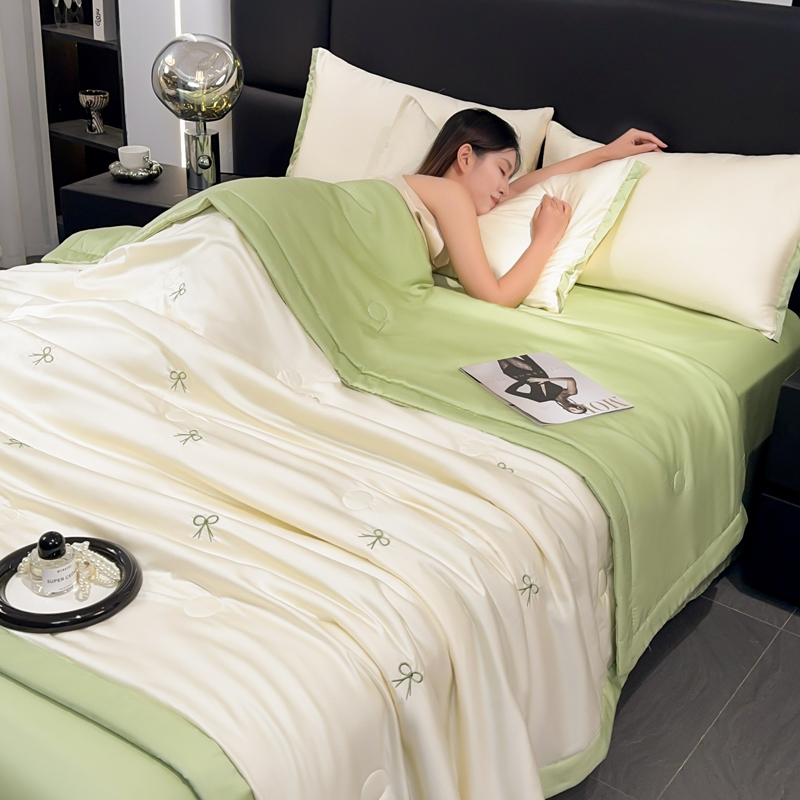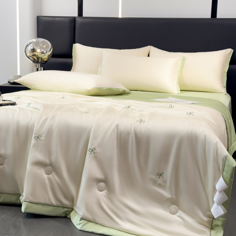 2025新款清凉舒适水洗冰丝刺绣夏被四件套 蝴蝶结-奶白绿