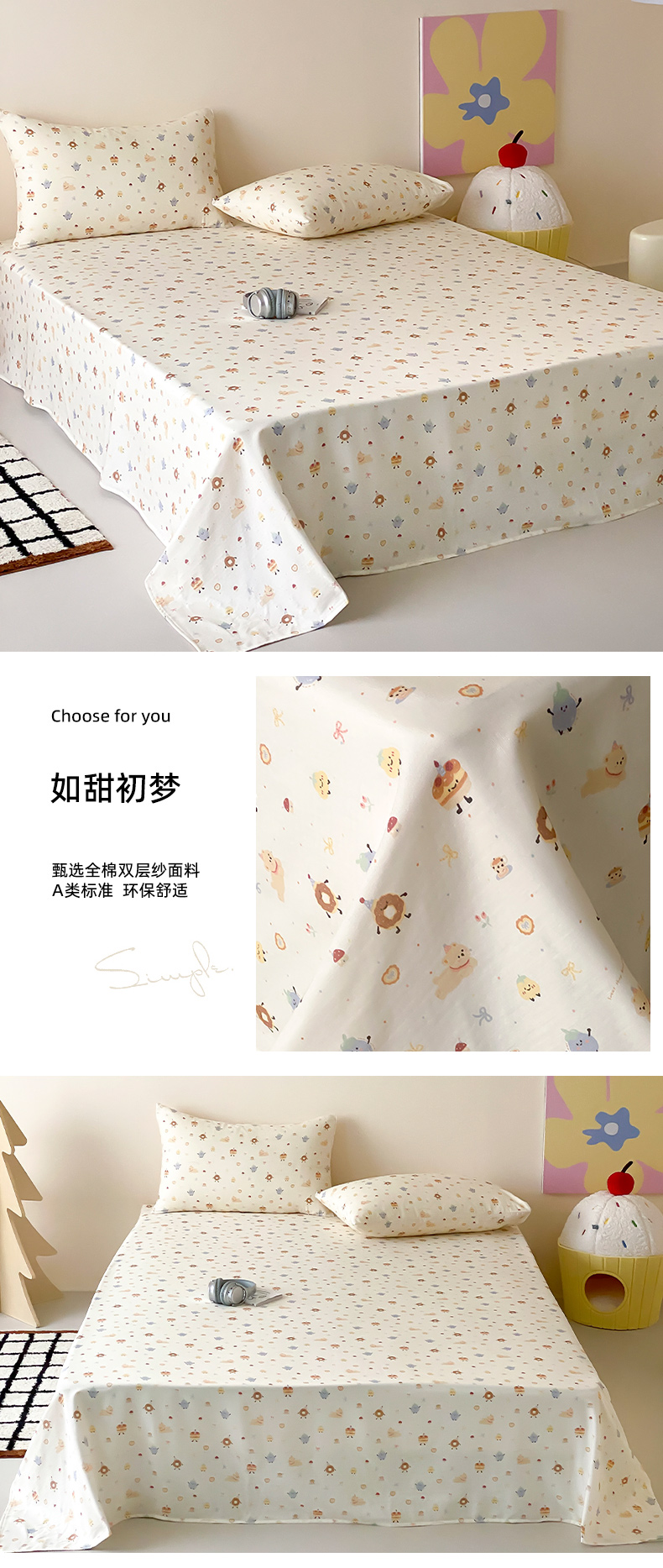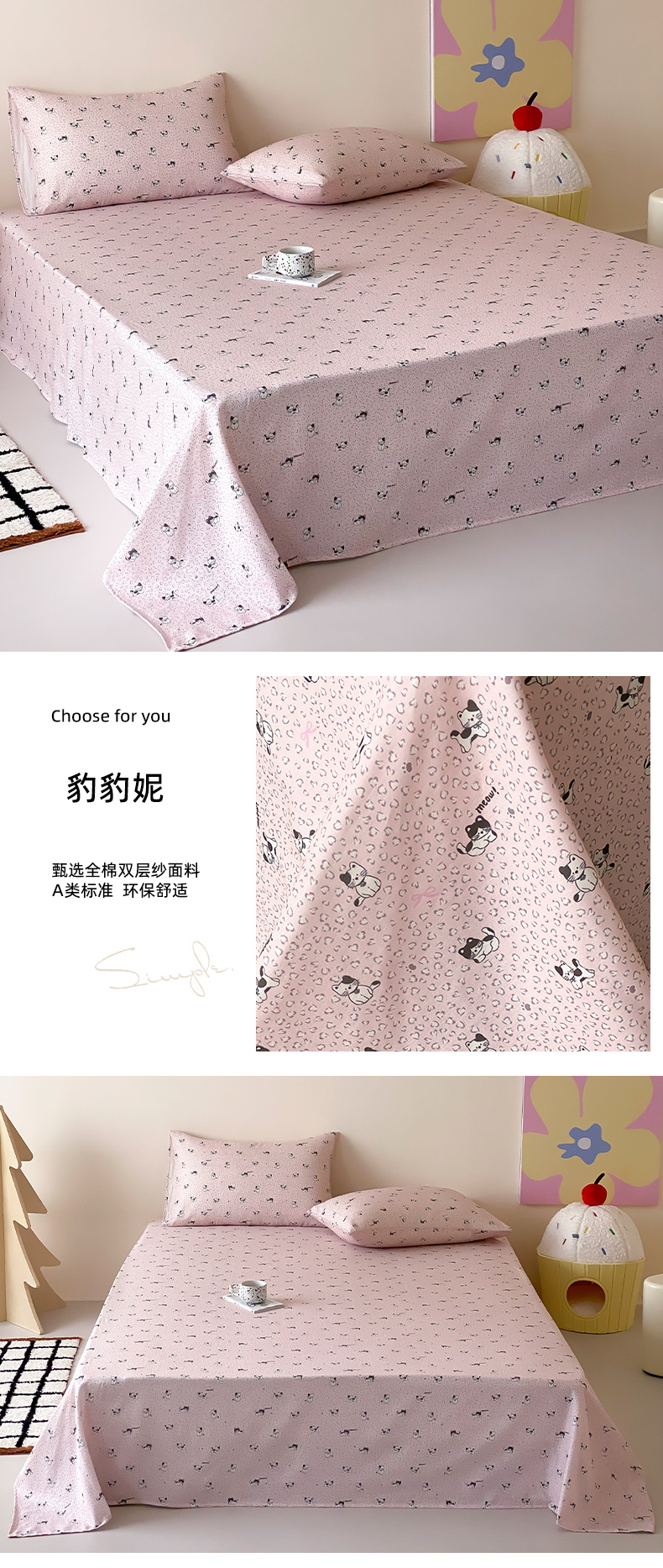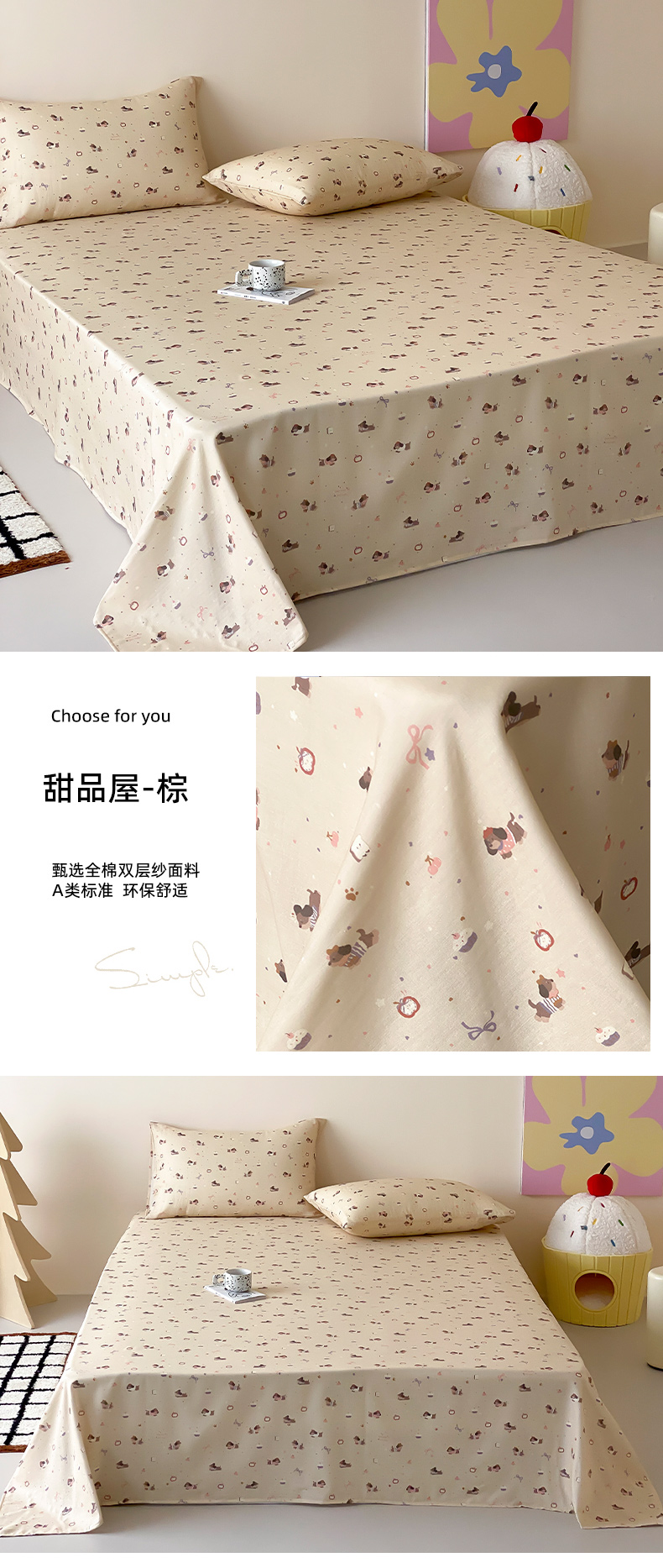 (总)时光里 2025新款双层纱系列卡通风床单,豹豹妮,啵啵乐园,布丁,可艾,萌宠宝宝-绿,如甜初梦,甜品屋-棕,小兔乖乖,竹汐恋,卡通风集合图