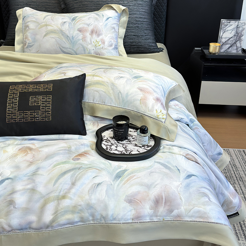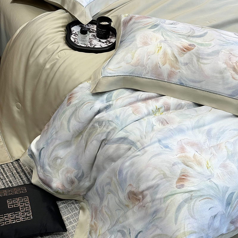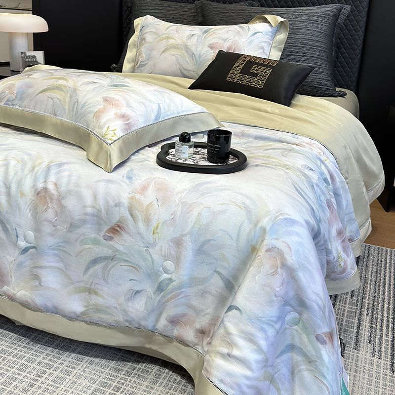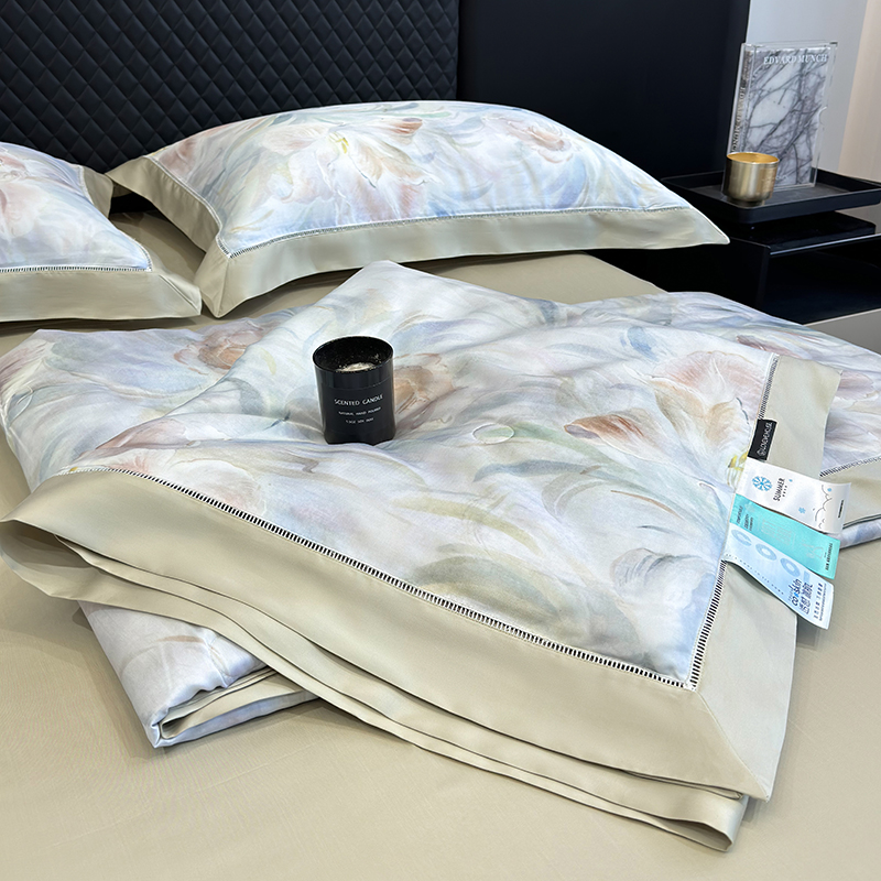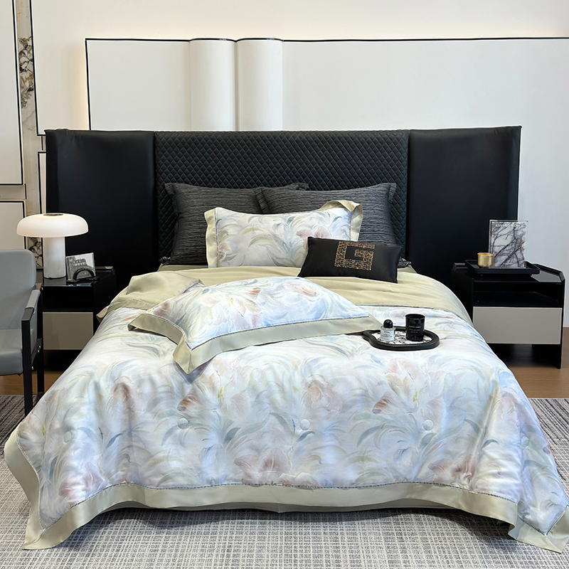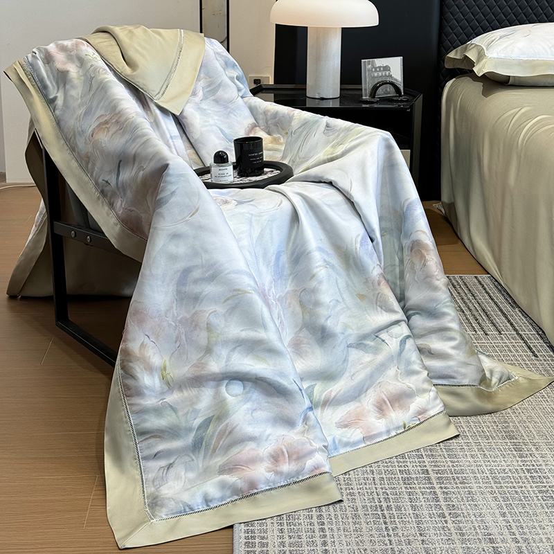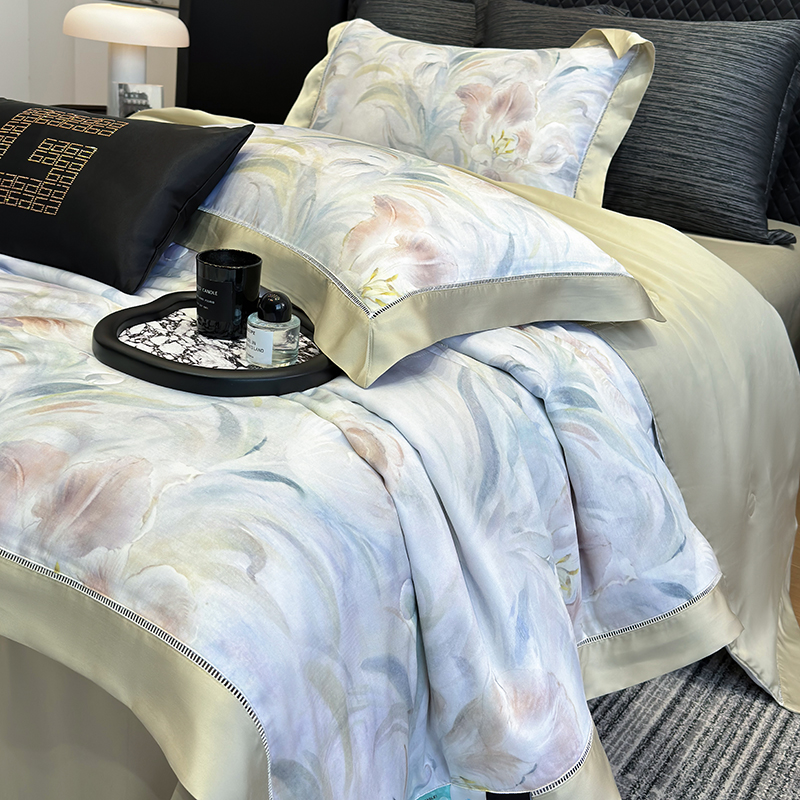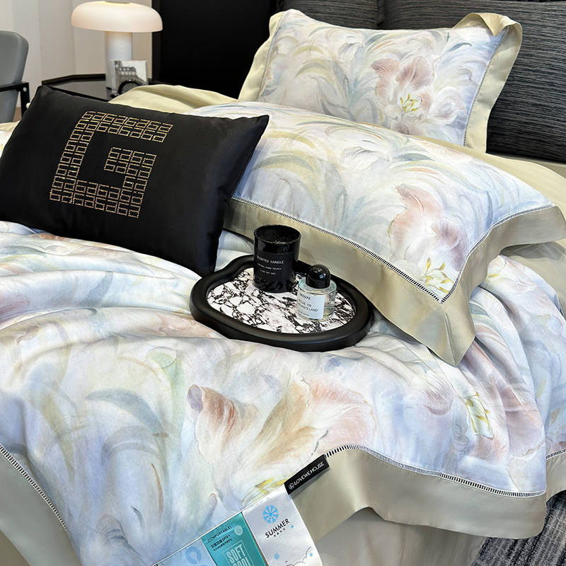 • 91家纺网 家纺一手货源 找家纺 若未家居 LOVEWE HOUSE 2025新款兰精天丝印花夏被及夏被四件套 粉墨华羽(床单款+床盖款)