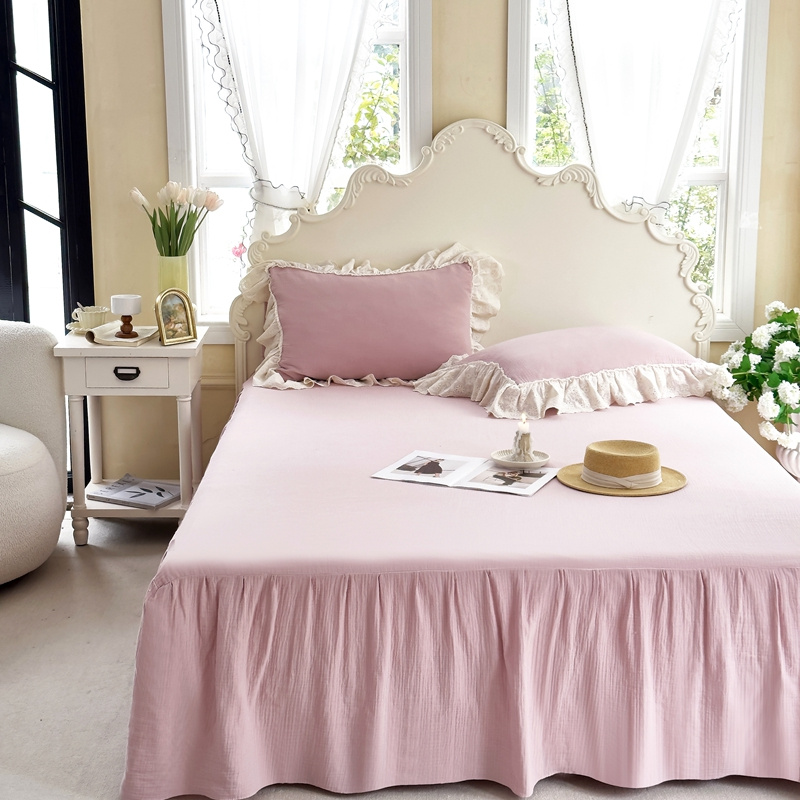 总北纬27度 2022法式双层花边全棉夹棉床裙四件套直播爆款,高级白,公主粉,海洋蓝,可爱黄