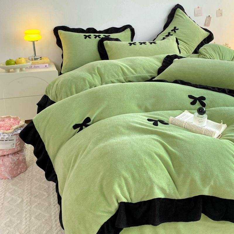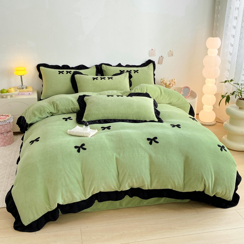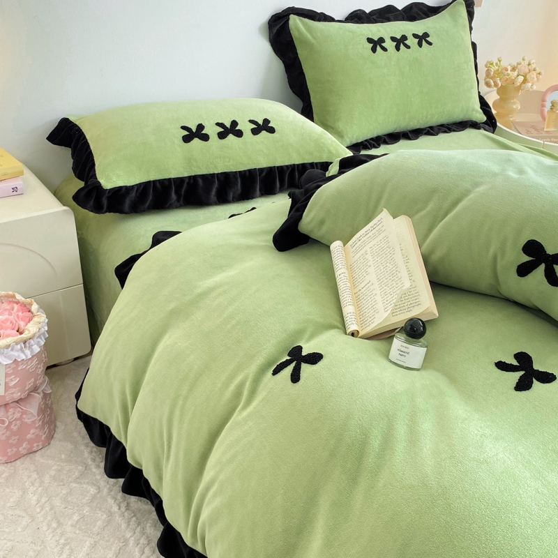 梦莱斯2025新款黑边绣花牛奶绒四件套 蝴蝶结-绿