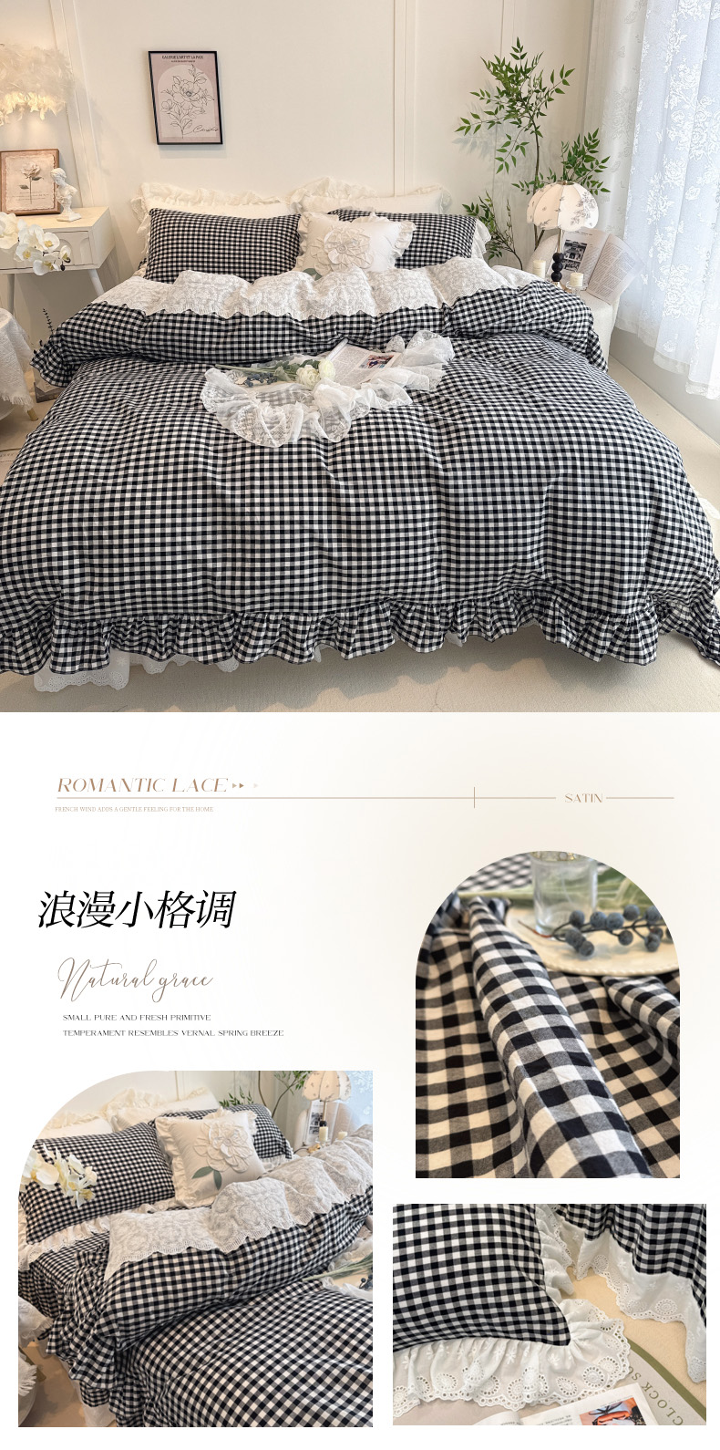 商品名称:胜权家纺 2025春夏新品全棉法式复古色织水洗棉床裙四件套系列 小黑格