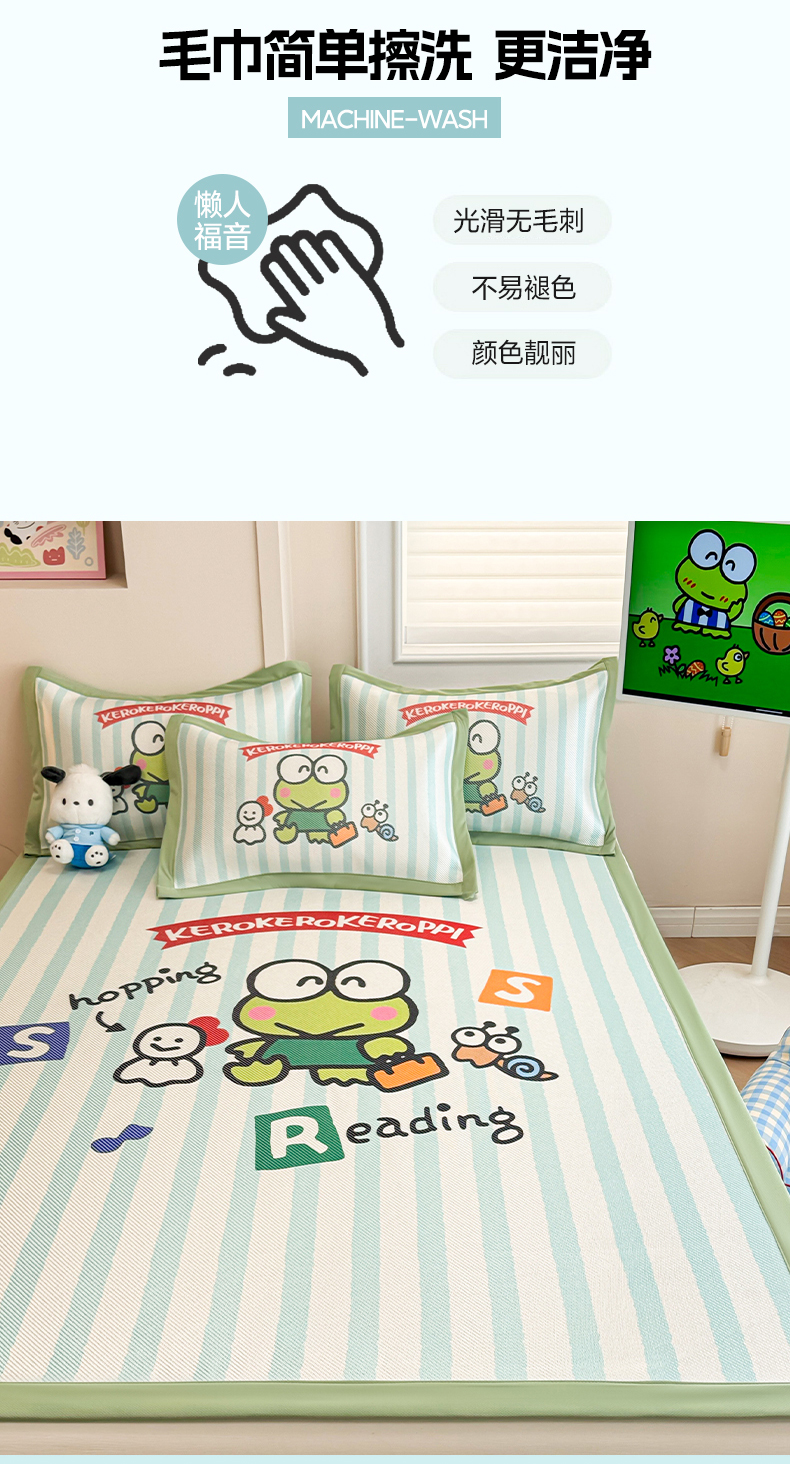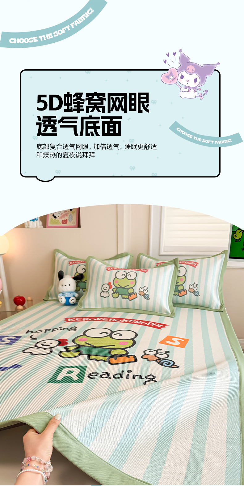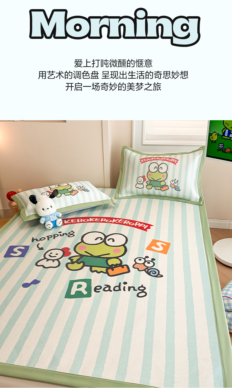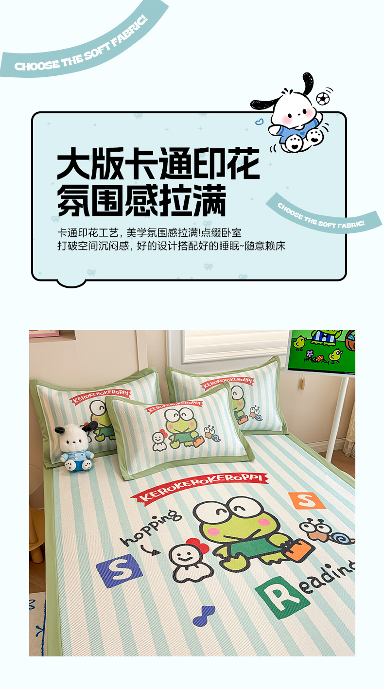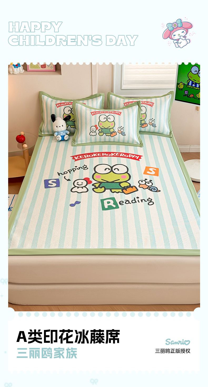 商品名称:蓝邻 2025春夏新款正版三丽鸥600D冰藤大版数码印花凉席-场景一 三眼蛙