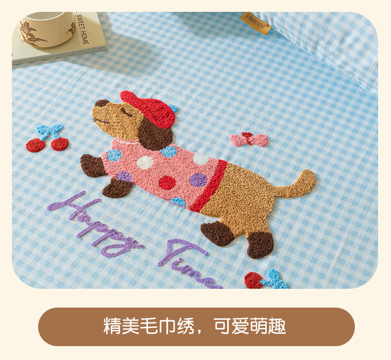 (总)居眠 2025新款全棉纯棉云感皱皱纱毛巾绣床单,白胡子狗狗,波点甜甜圈,大象先生,蝴蝶猫咪,腊肠樱桃,三只小可爱,圣诞树,兔兔小姐,外星小鸟,小象汽车,组合图仅做展示