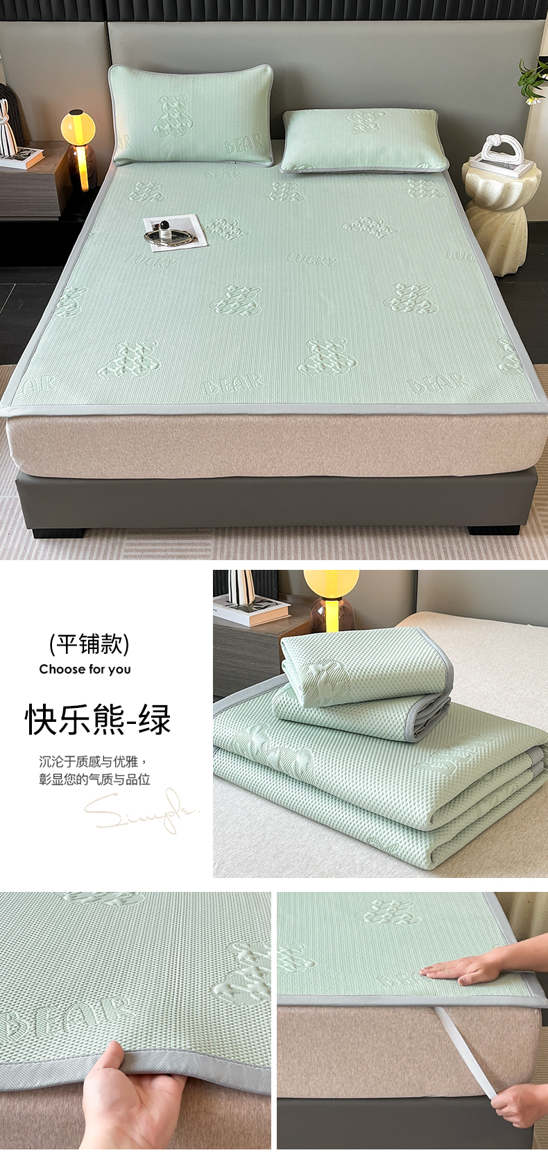 (总)子曰 2025春夏新款A类中分子430gPE聚乙烯乙纶凉豆豆凉席-床笠款,小豹纹-灰,快乐熊-蓝,快乐熊-绿,小豹纹-粉,小鲸鱼,椰子树,英伦-灰