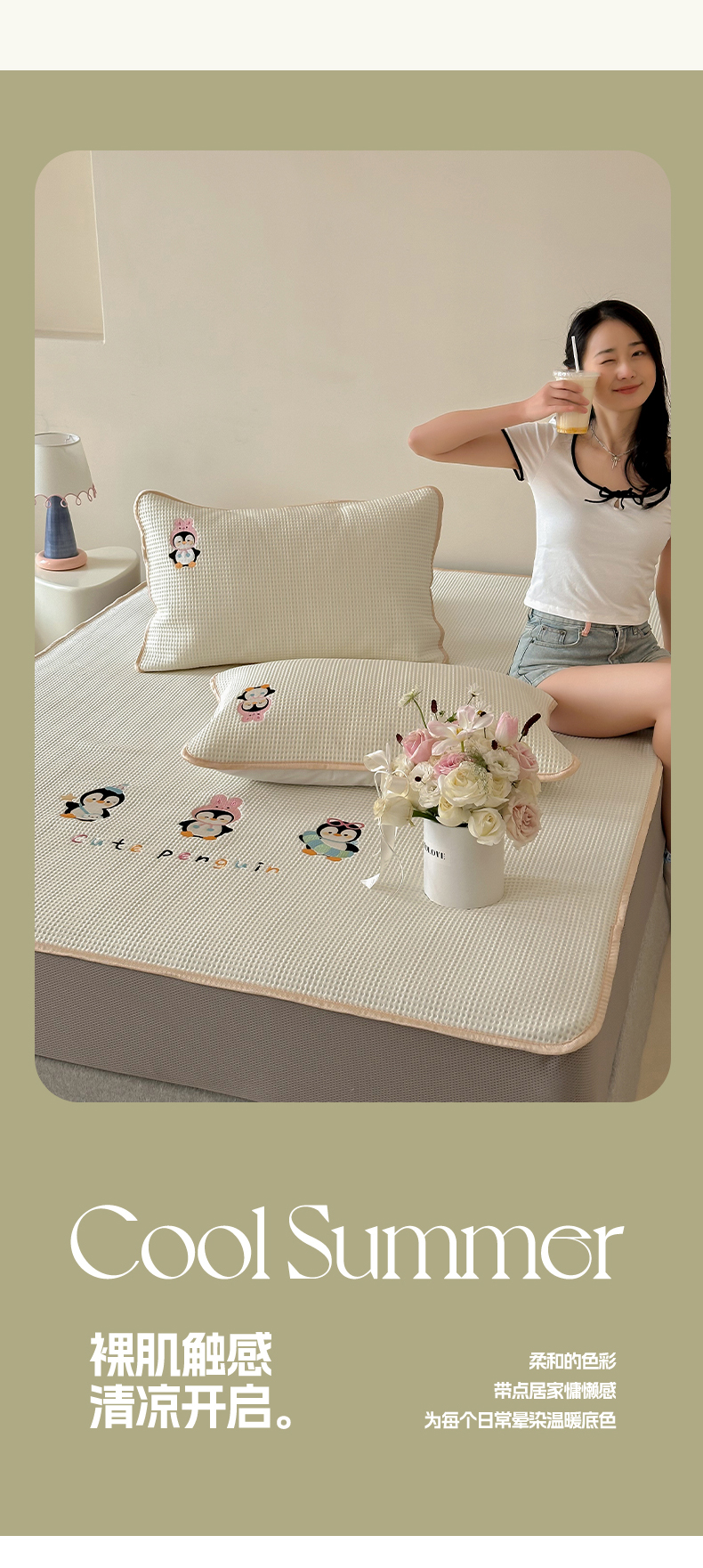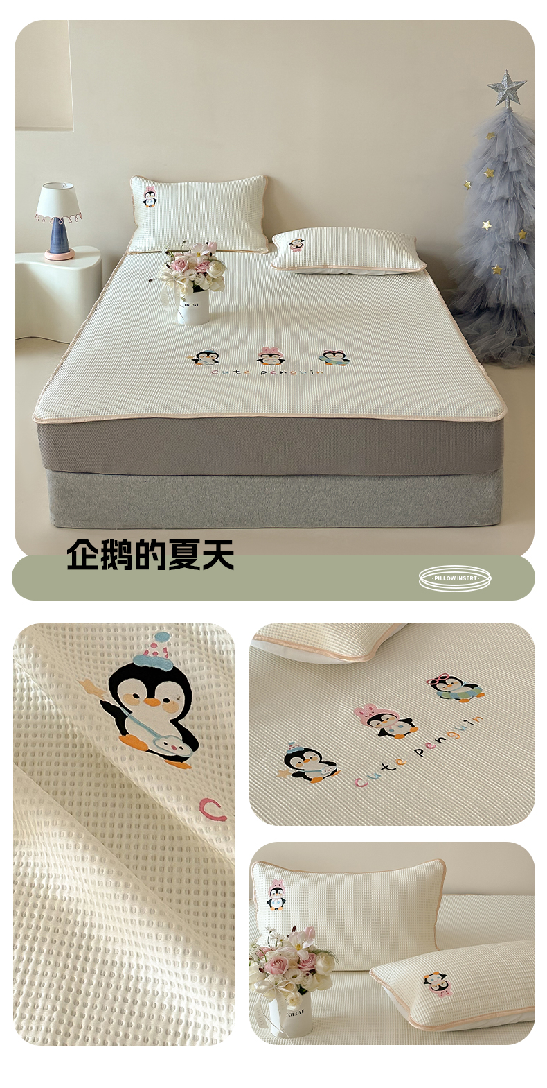 圆岛家纺 2025夏季高分子PE华夫格刺绣软凉席床笠款三件套 企鹅的夏天