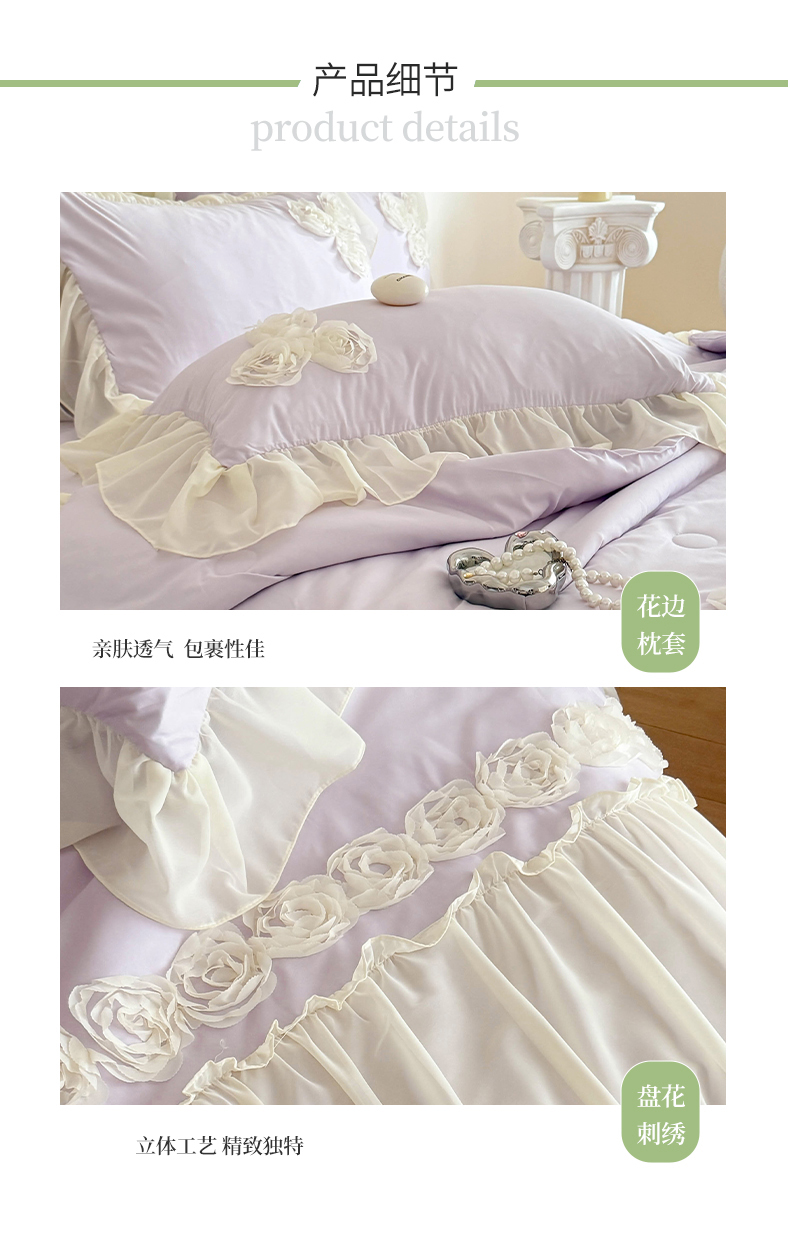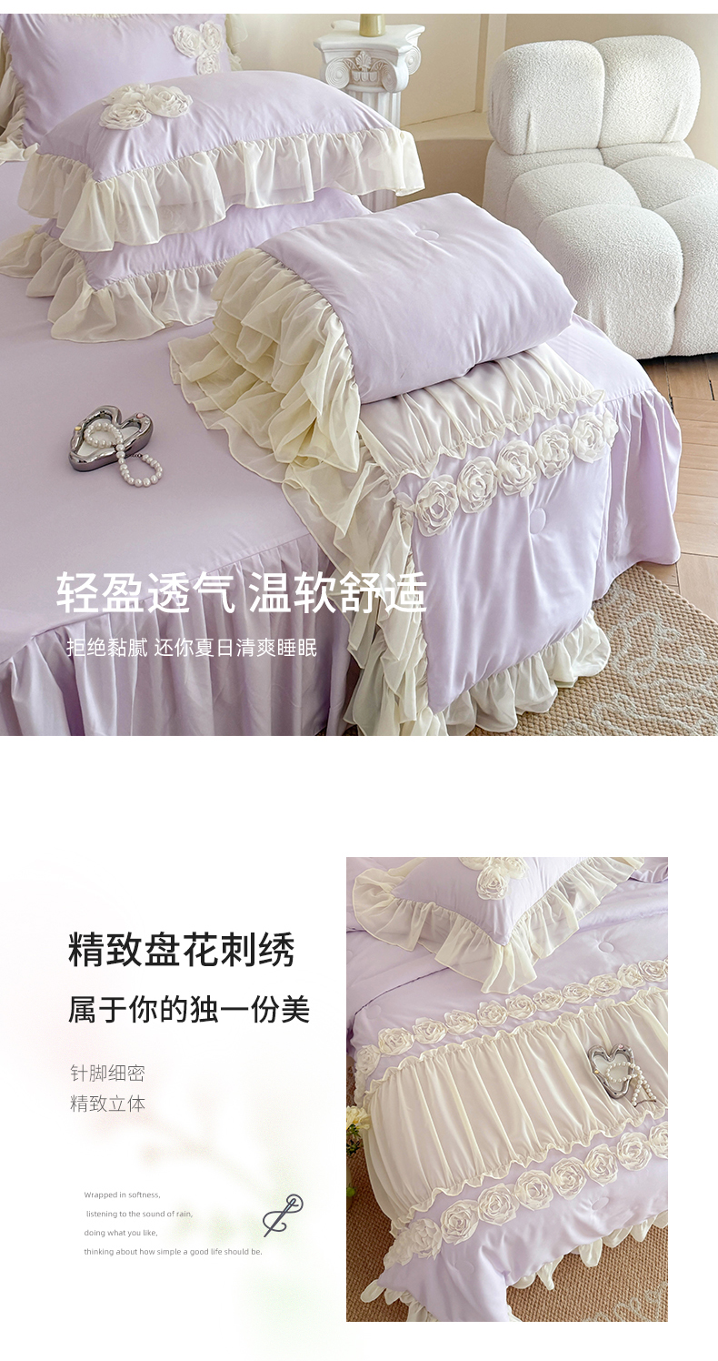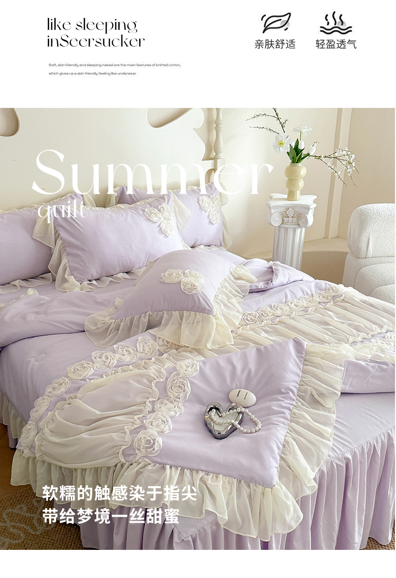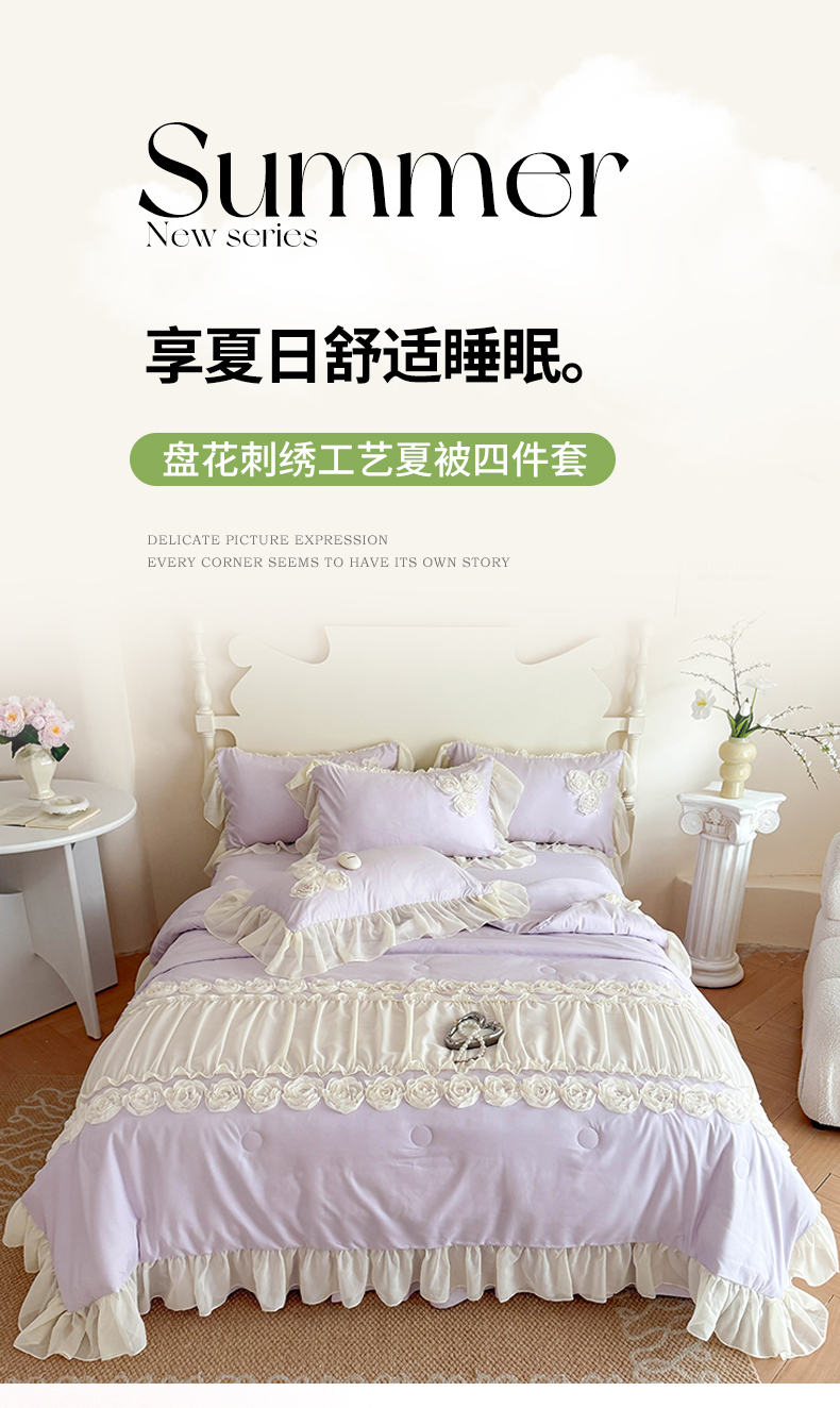 当前位置: 91家纺网 > 商品网购 > 床品套件 > 四件套 > 夏被四件套 > 富盛家纺 2025新款水洗亲肤棉盘花特种刺绣夏被夏凉被空调被床裙款四件套 甜蜜蜜-紫