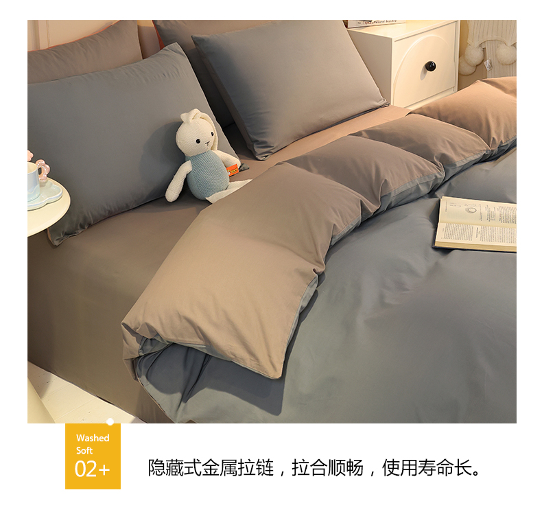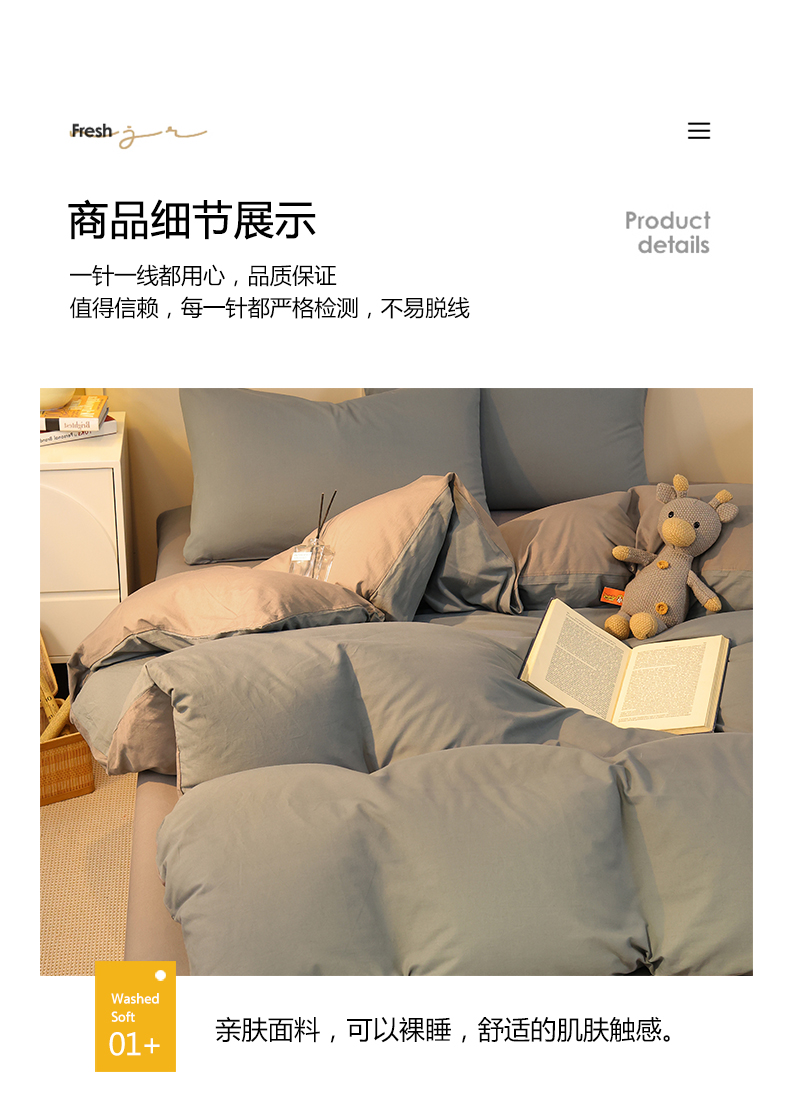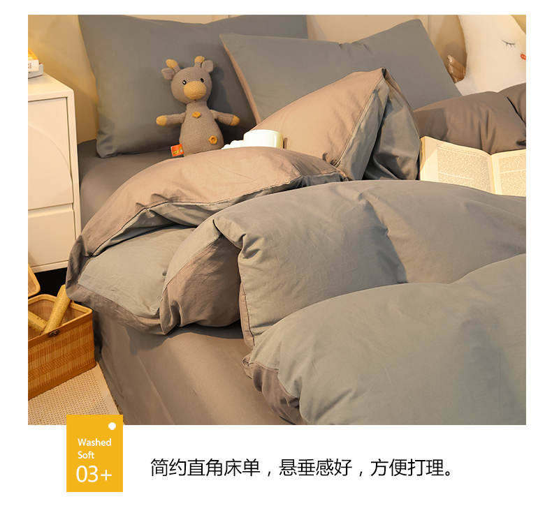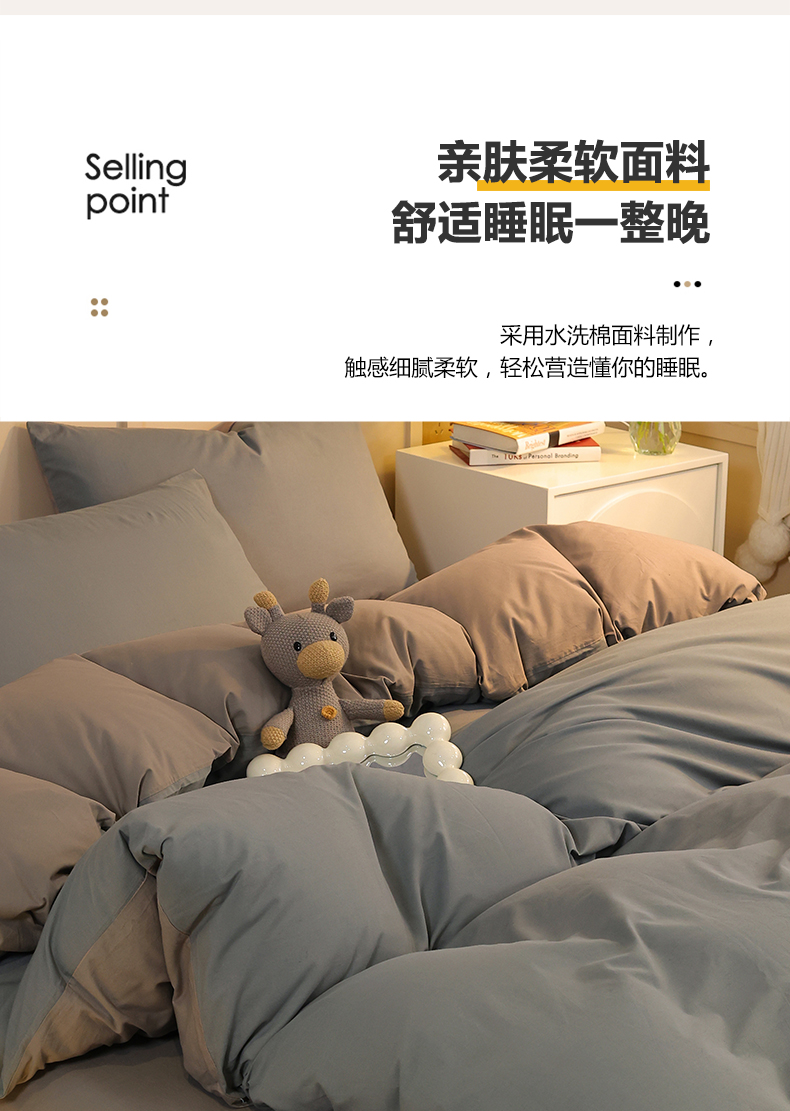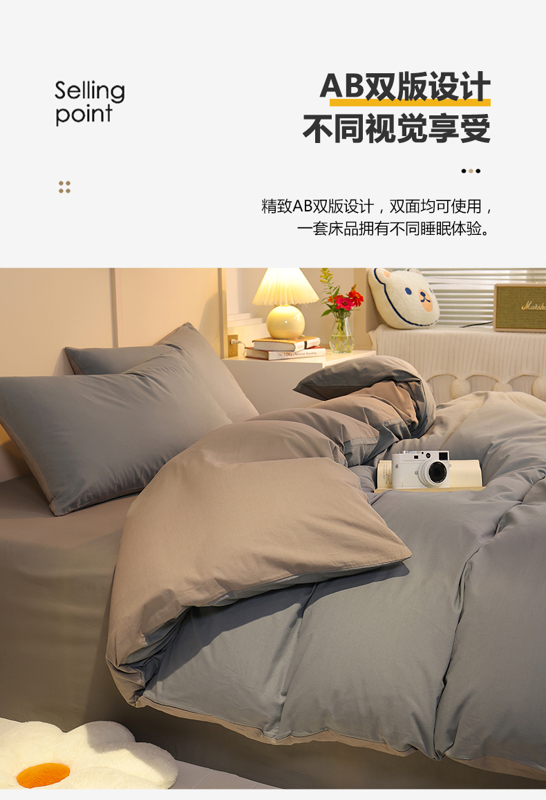 商品名称:缦绣阁家纺 2025新款亲肤水洗棉纯色双拼四件套简约风床单款床笠款四件套宿舍三件套 双拼中灰+浅灰