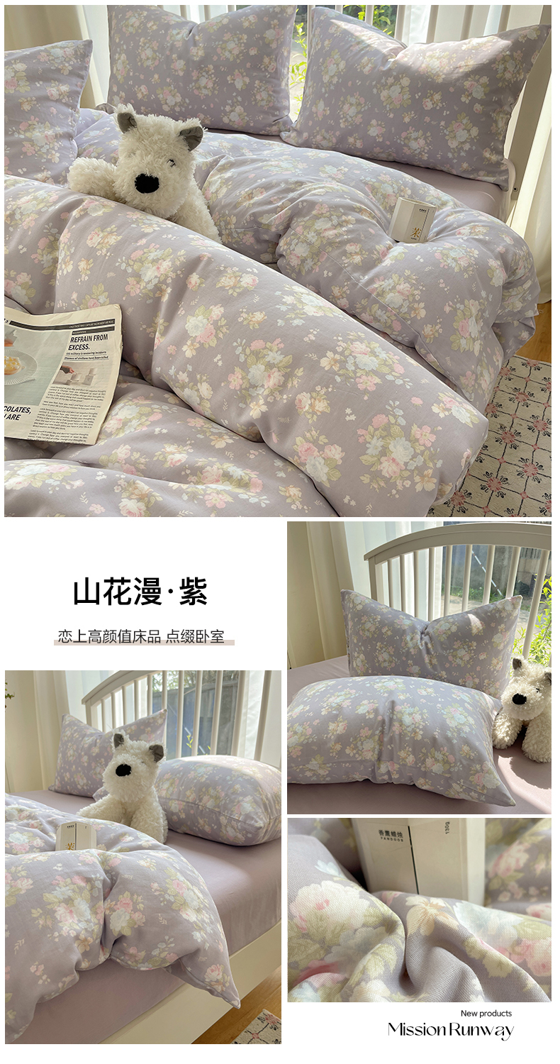 当前位置: 91家纺网 > 商品网购 > 床品套件 > 四件套 > 双层纱四件套 > XIWEN-希文家纺 2025新款A类全棉纯棉有氧双层纱四件套 山花漫 -紫