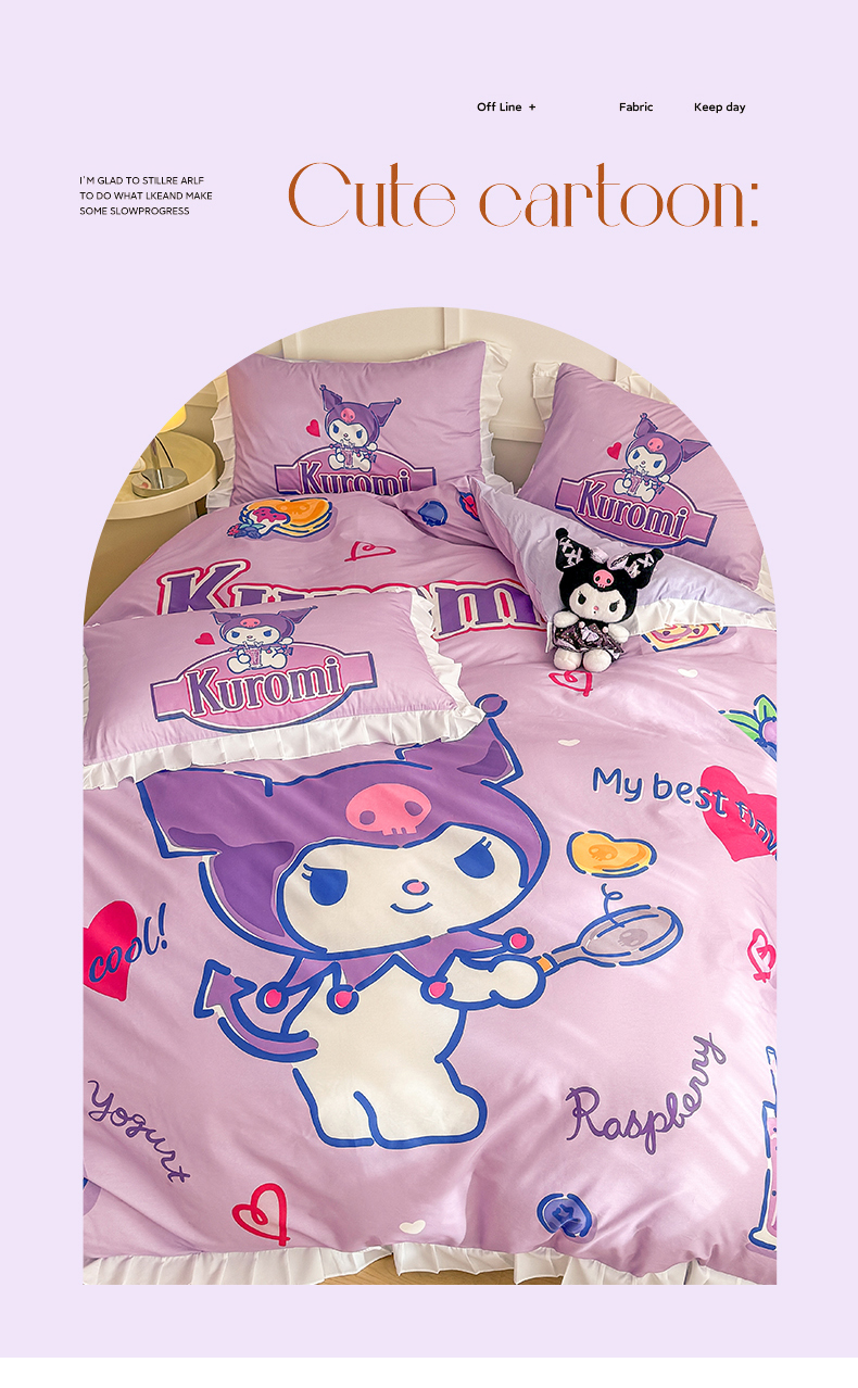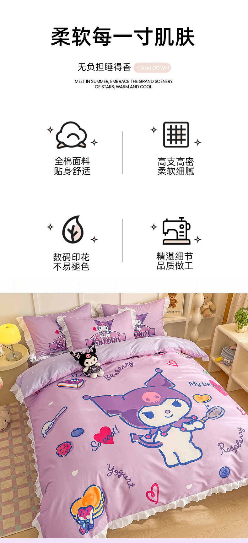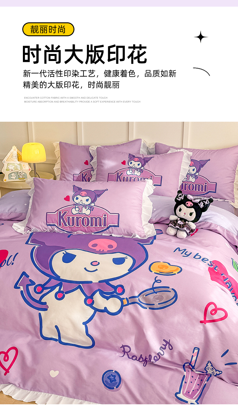 当前位置: 91家纺网 > 商品网购 > 床品套件 > 四件套 > 全棉普通四件套 > 玉元坊 2025新款三丽鸥白花边被套数码印花大版全棉纯棉卡通三四件套 大版花边-蓝莓库洛米