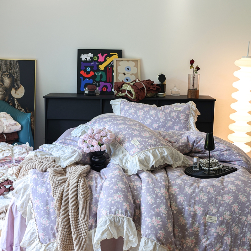 紫碧螺家纺 2025新款A类全棉纯棉仙女双层纱大韩边四件套 雾漫玫瑰夜