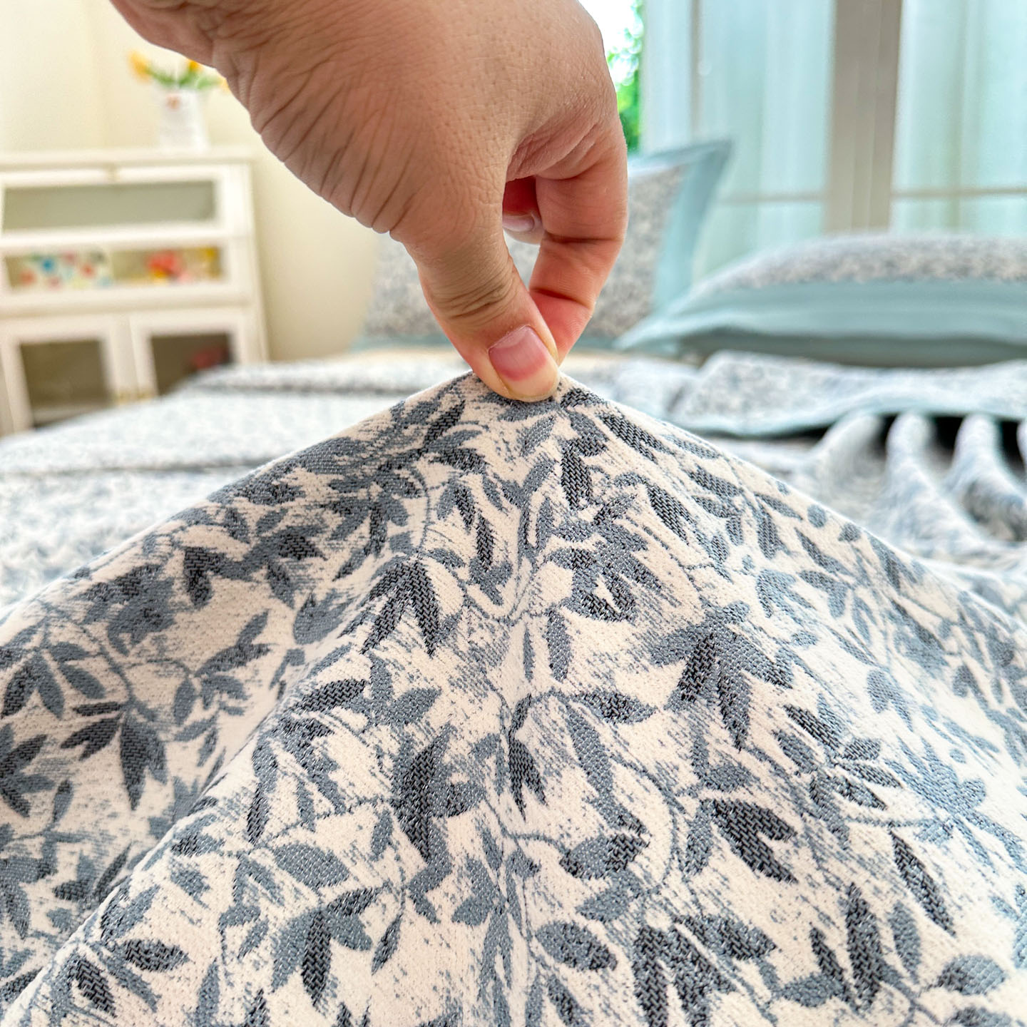 商品名称:紫碧螺家纺 2025新款雪尼尔欧式拼色床盖三件套 小枫叶拼湖蓝