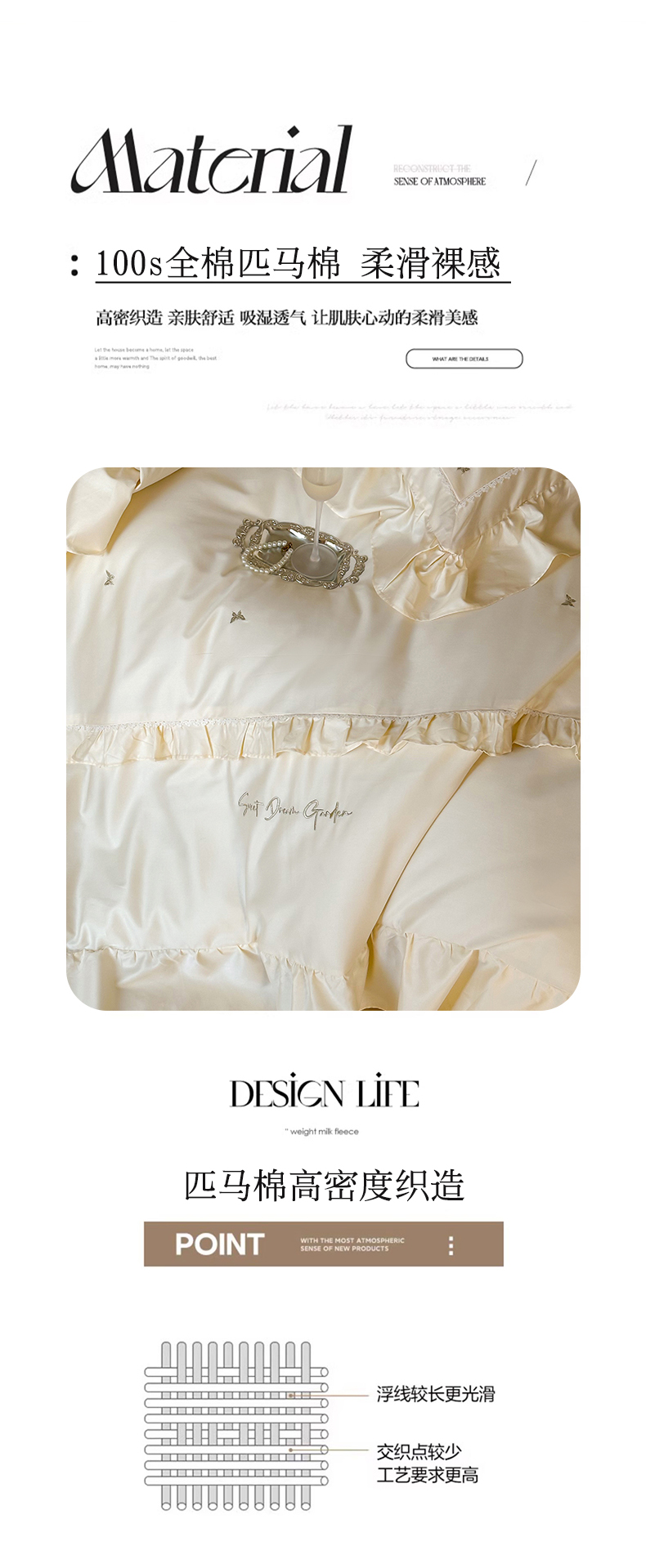 商品名称:宏羽纺家纺 2025新款100s全棉纯棉贡缎司马棉法式刺绣花边四件套 蝶梦-奶油芝芝