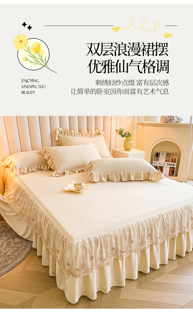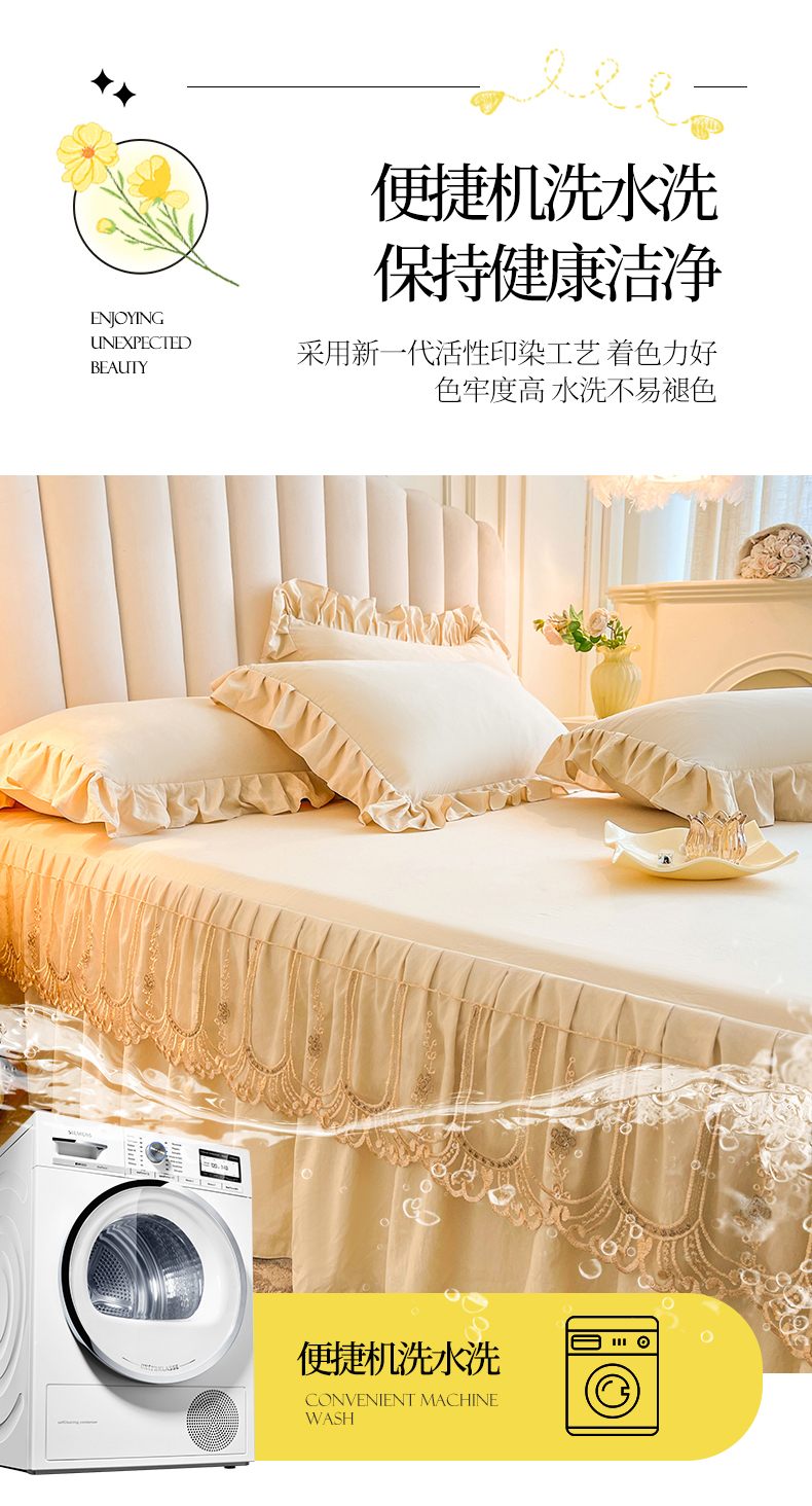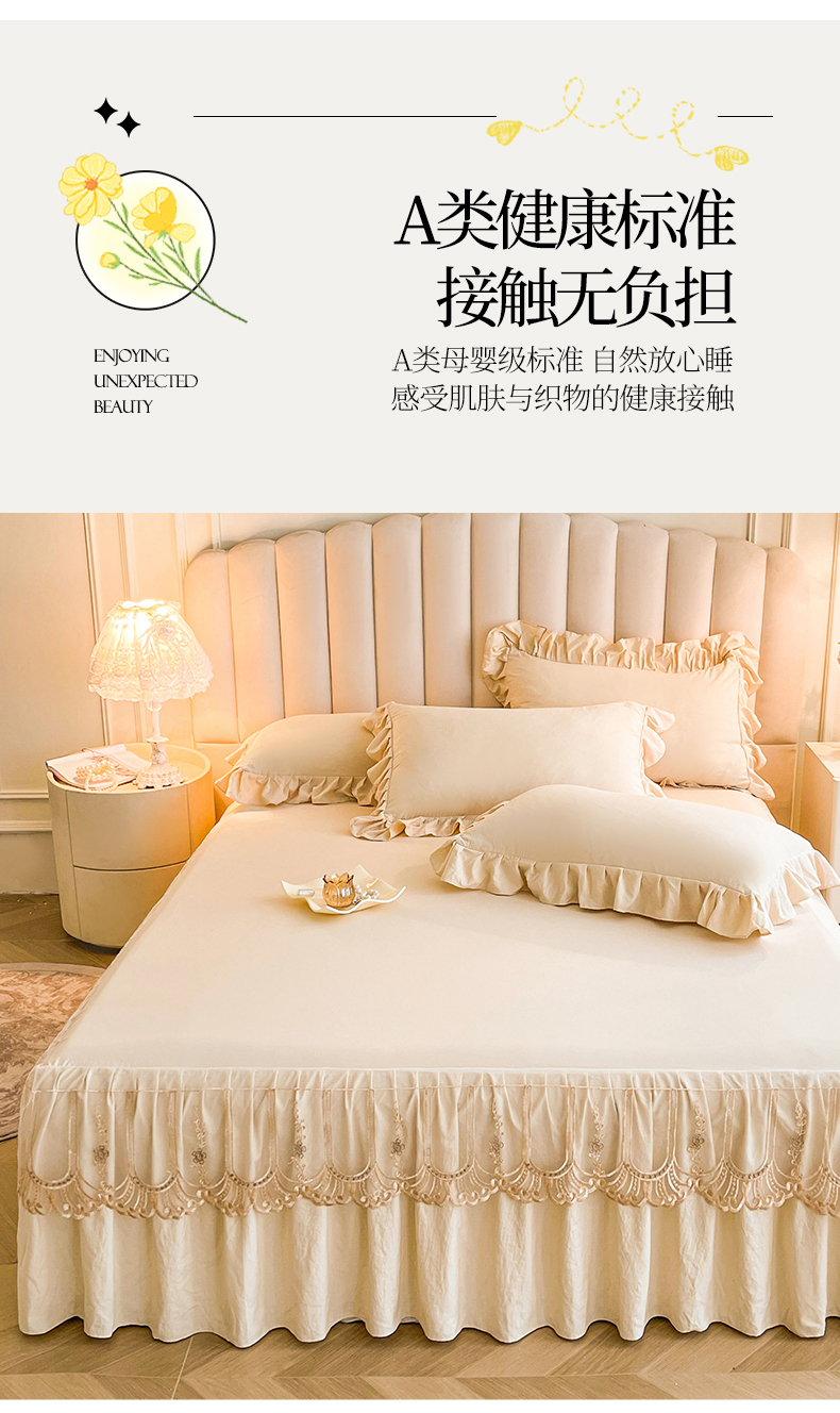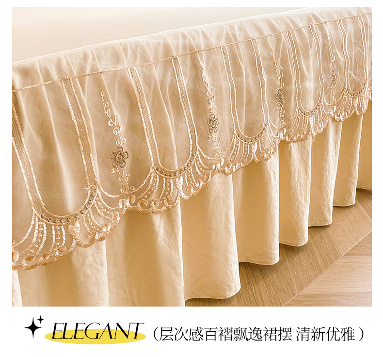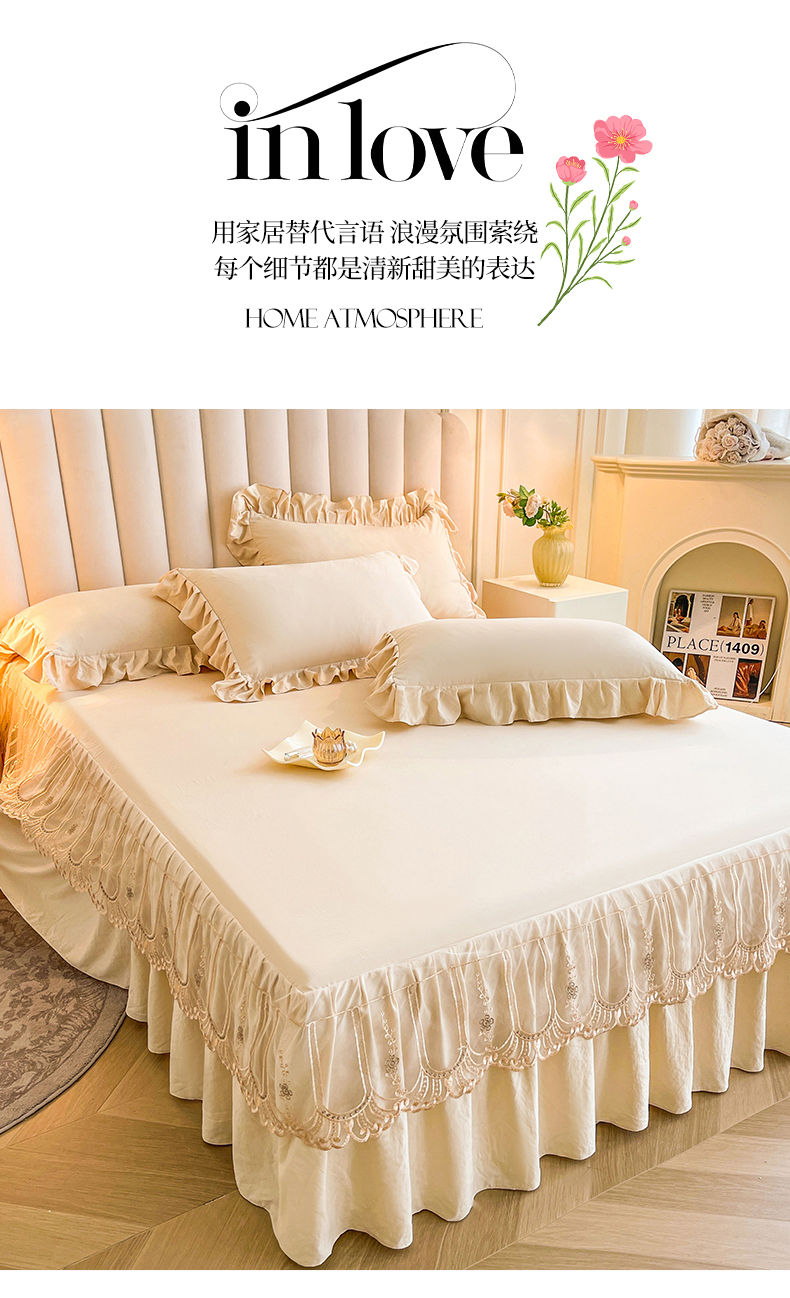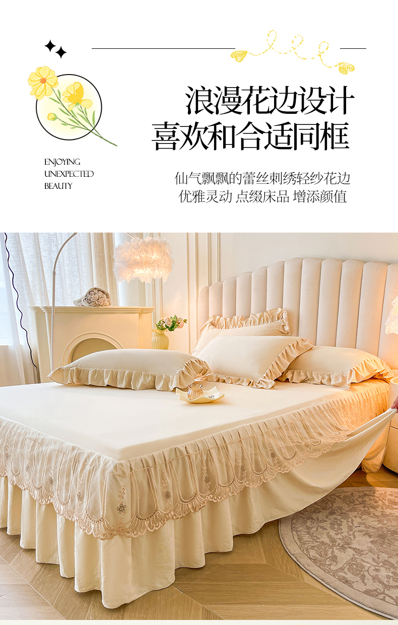 当前位置: 91家纺网 > 商品网购 > 床品套件 > 三件套 > 好儿喜家纺 2025新款A类水洗棉花边床裙蕾丝床罩三件套-如漫 如漫-香槟