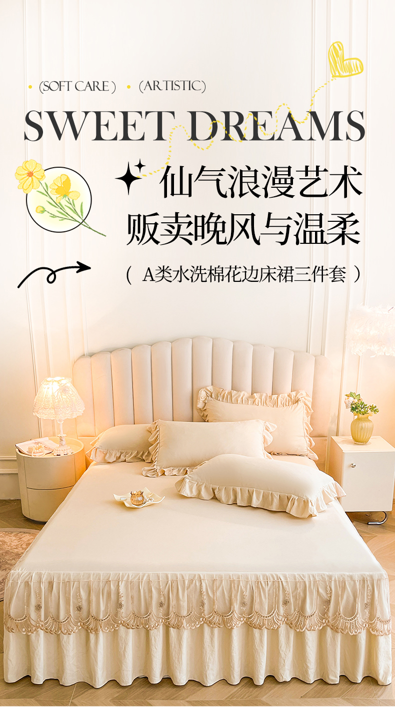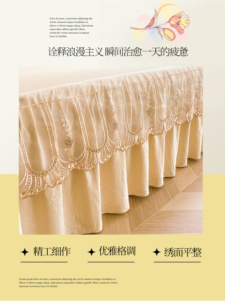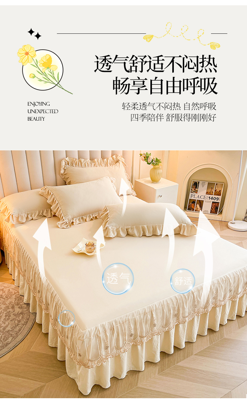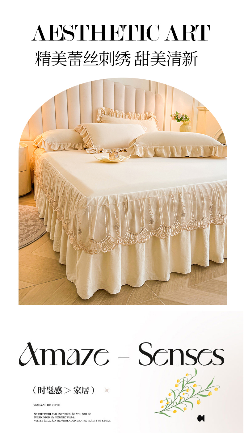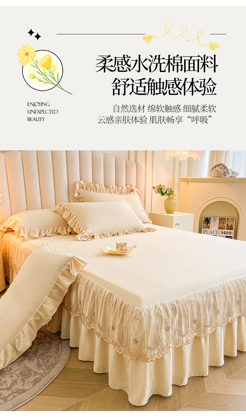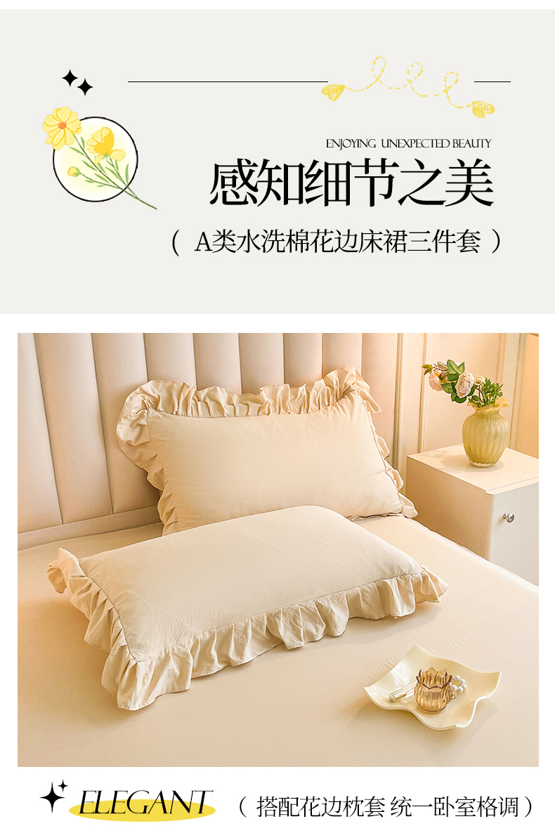 当前位置: 91家纺网 > 商品网购 > 床品套件 > 三件套 > 好儿喜家纺 2025新款A类水洗棉花边床裙蕾丝床罩三件套-如漫 如漫-香槟