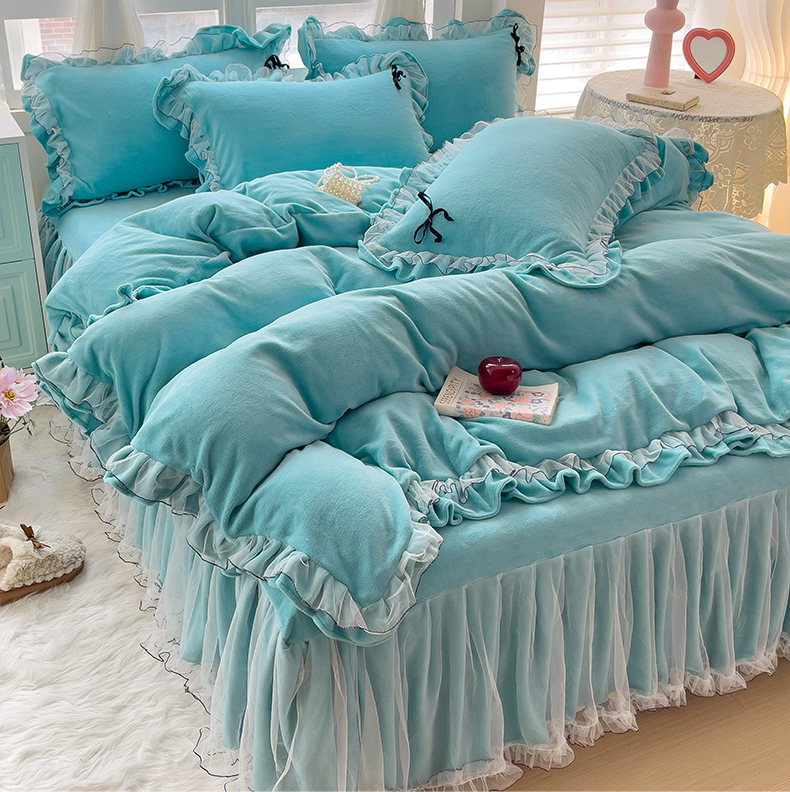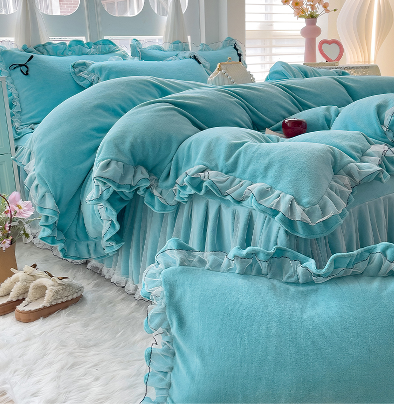 言熙居家纺 2025新款仙气网纱蕾丝花边蝴蝶结牛奶绒四件套 仙女蓝