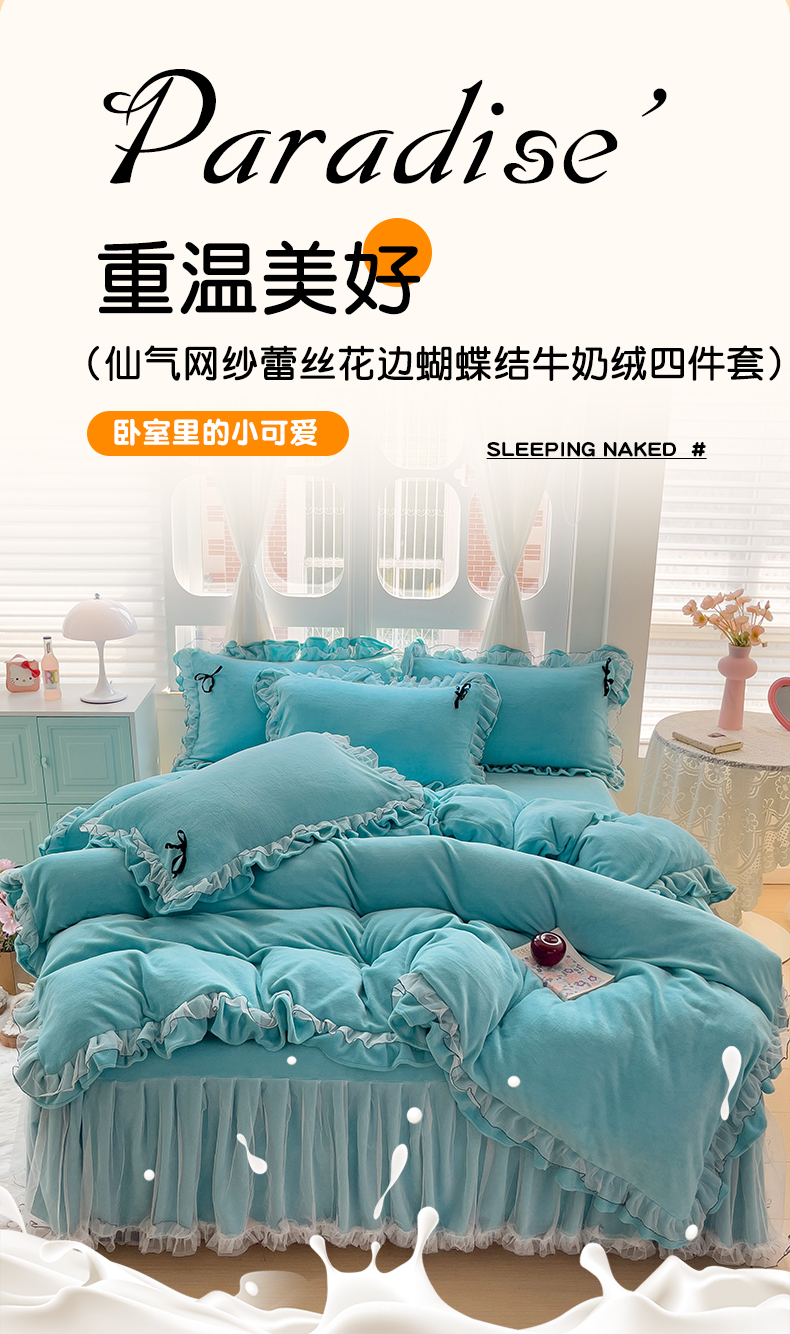商品名称:言熙居家纺 2025新款仙气网纱蕾丝花边蝴蝶结牛奶绒四件套 仙女蓝
