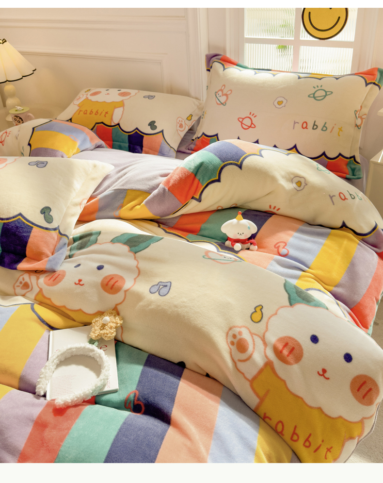 当前位置: 91家纺网 > 商品网购 > 床品套件 > 四件套 > 牛奶绒四件套 > 丝羽坊 2025新款200克加厚小清新牛奶绒床单款 床笠款四件套 被套 彩虹兔