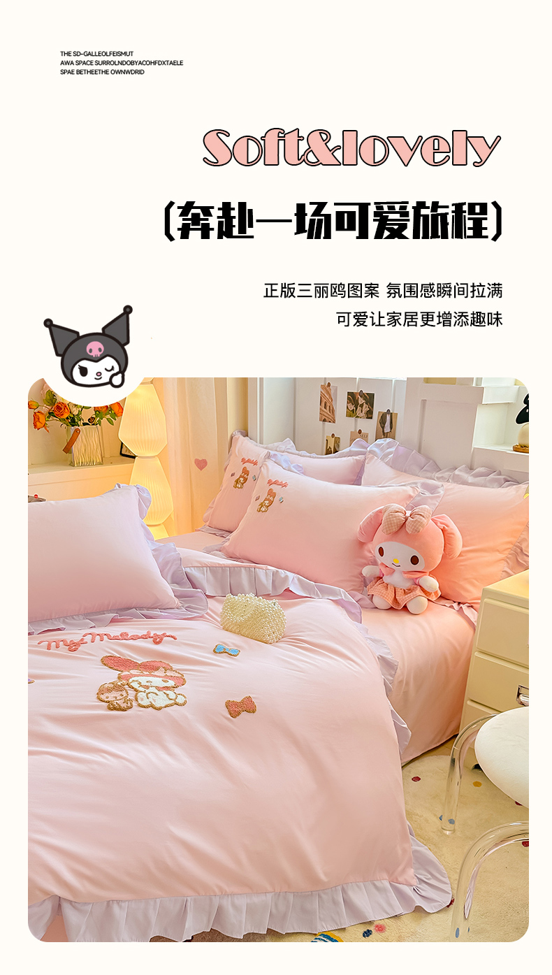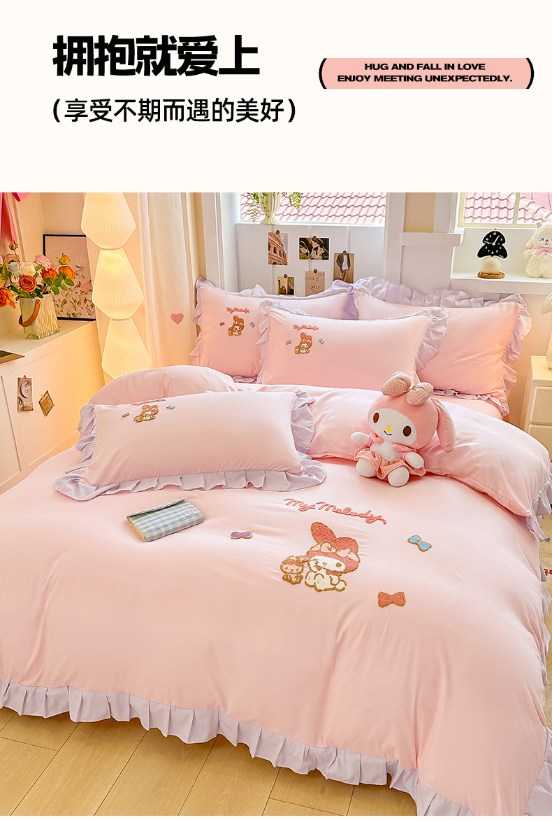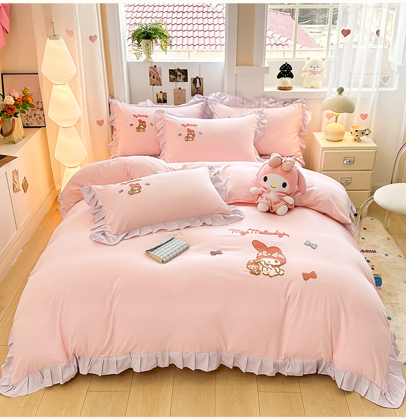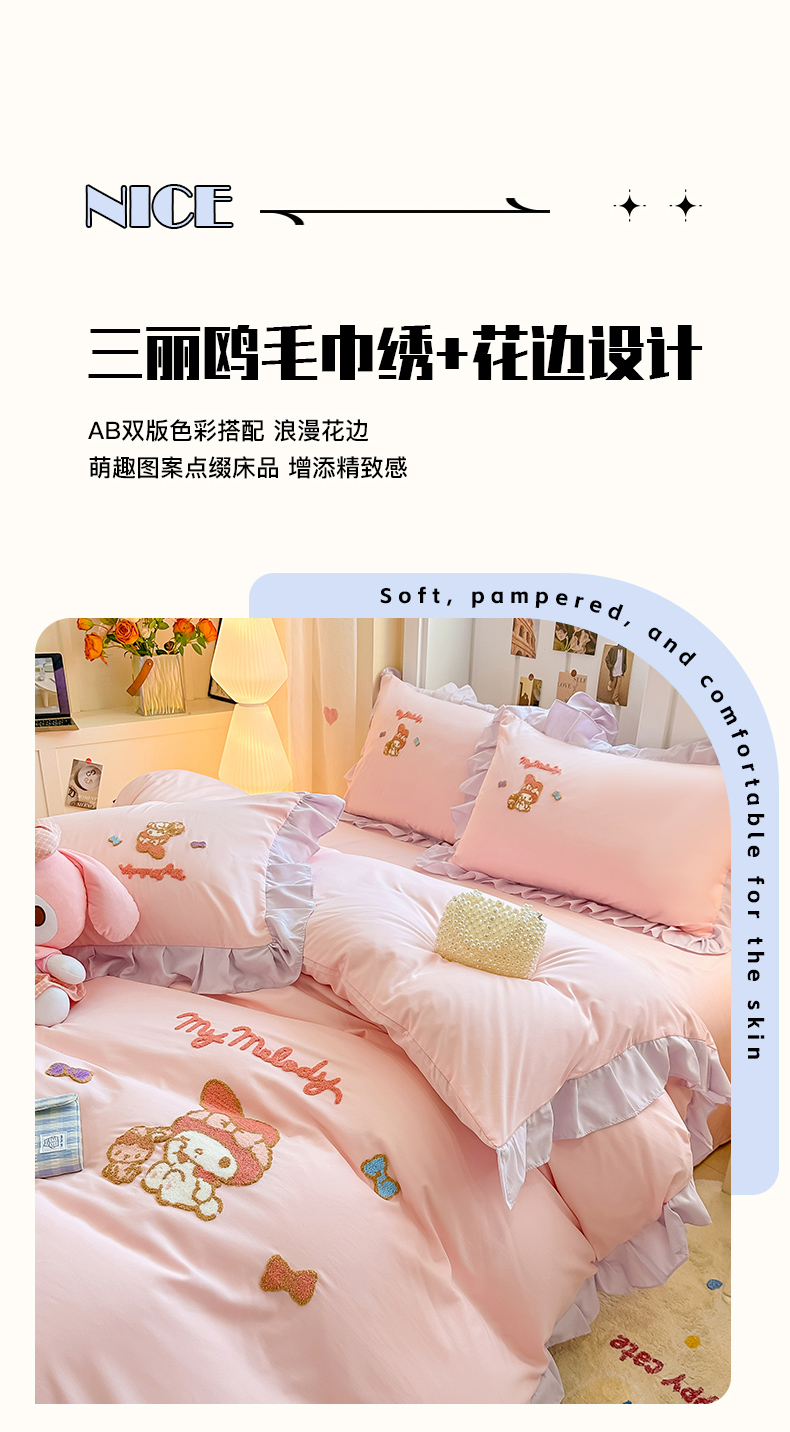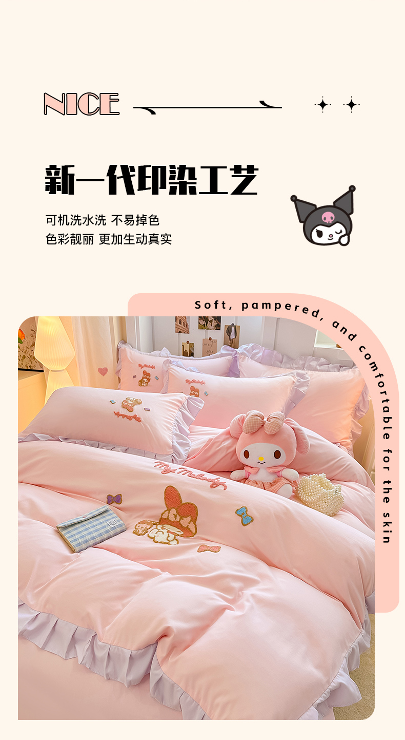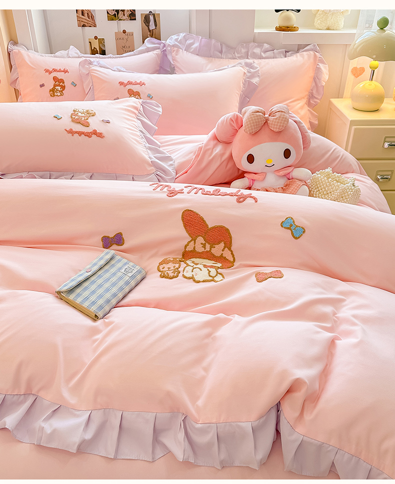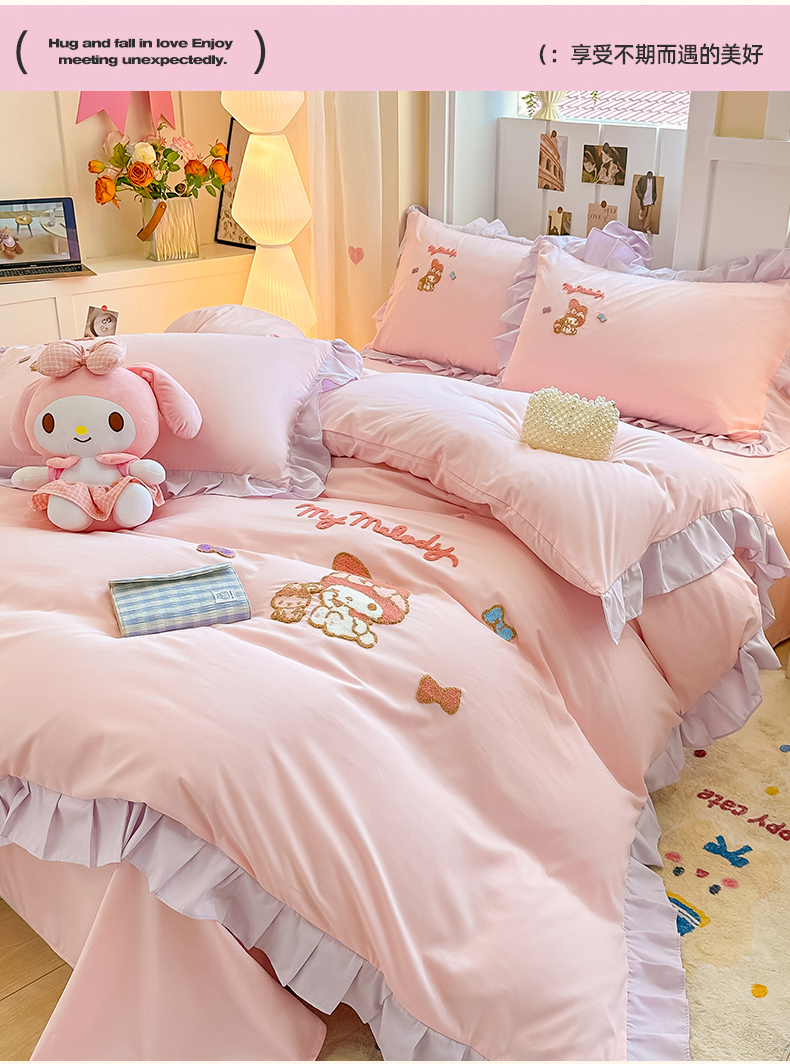当前位置: 91家纺网 > 商品网购 > 床品套件 > 四件套 > 水洗棉四件套 > 博雅 2025春夏新款毛巾绣三丽鸥水洗棉花边四件套正版授权 毛巾绣-小兔美乐蒂