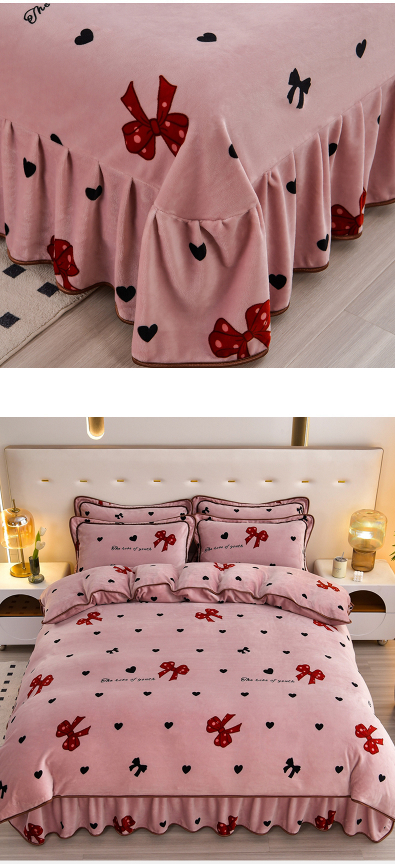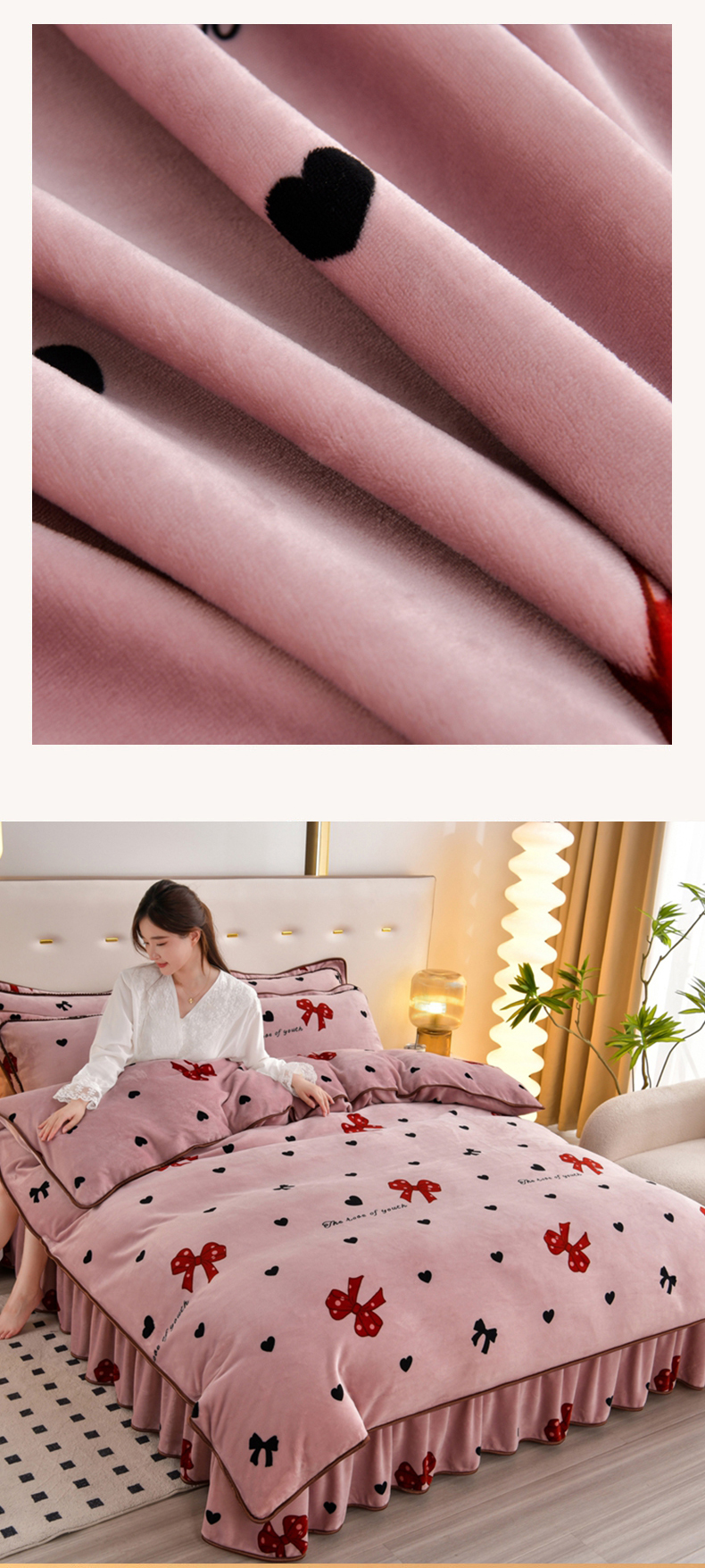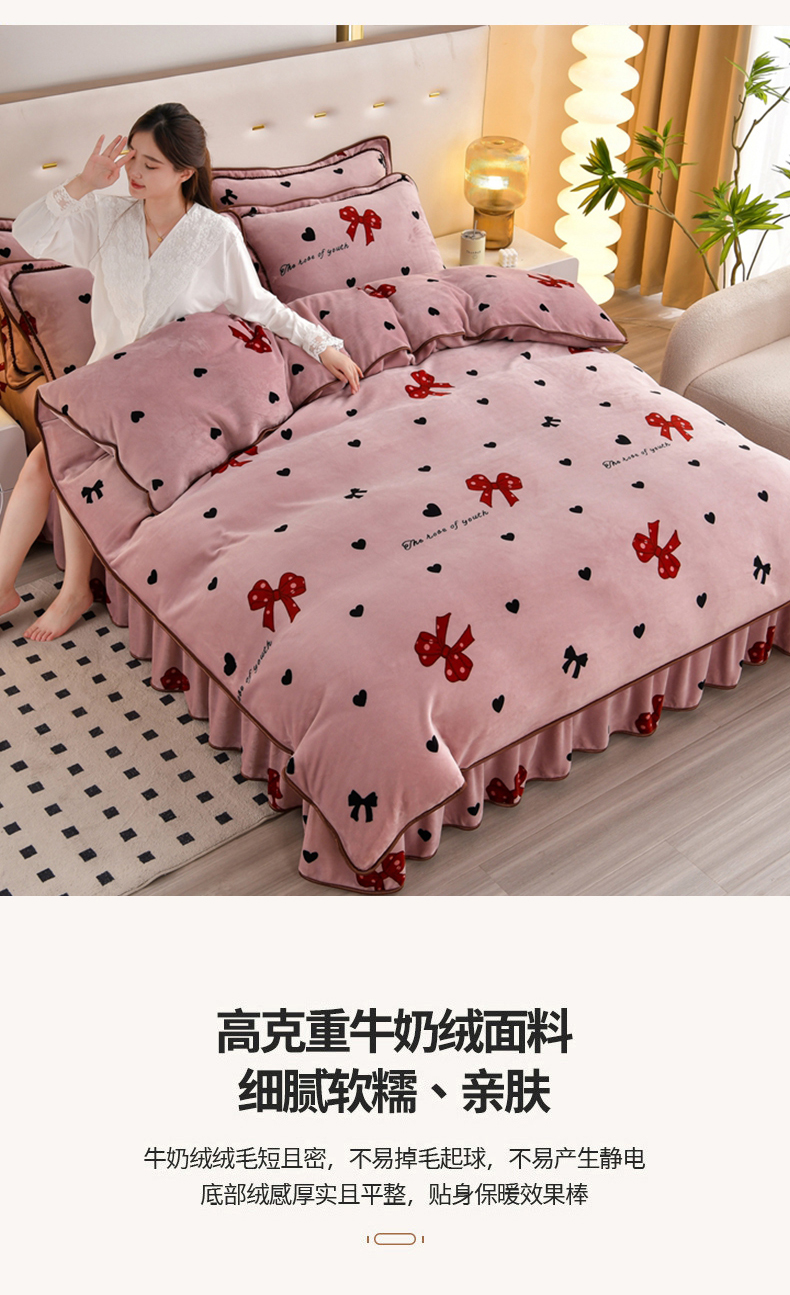 商品名称:芯诗曼 2025直播高克重牛奶绒四件套法莱绒金貂貂狐保暖单被套 蝴蝶结