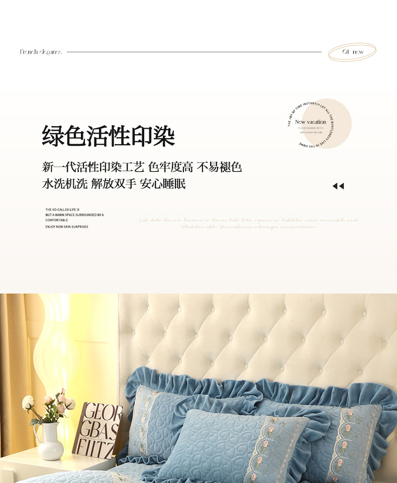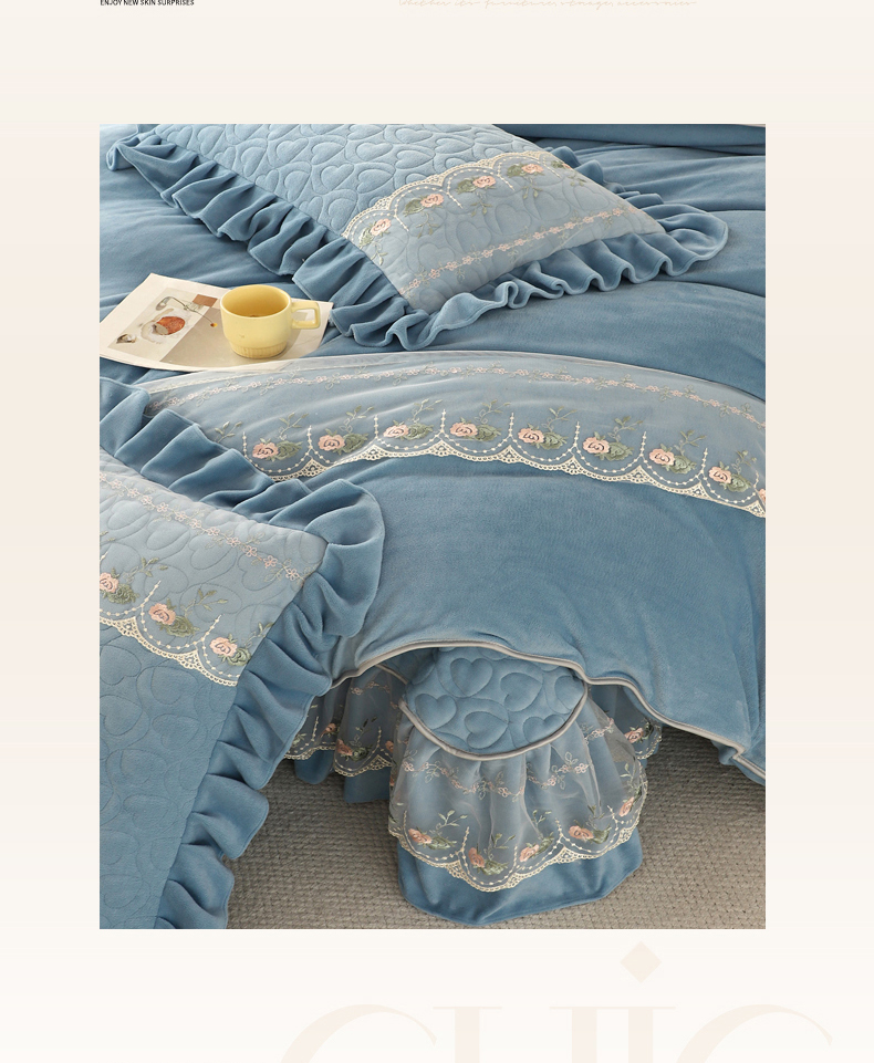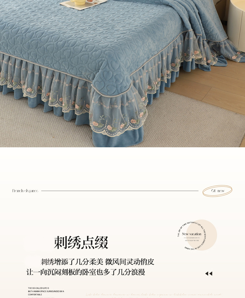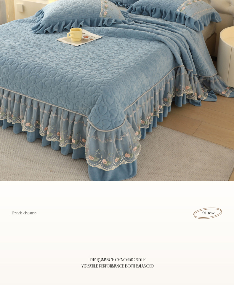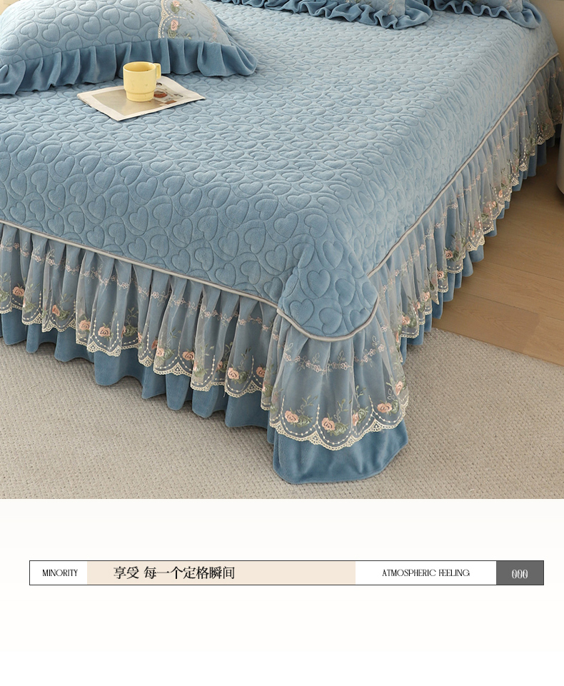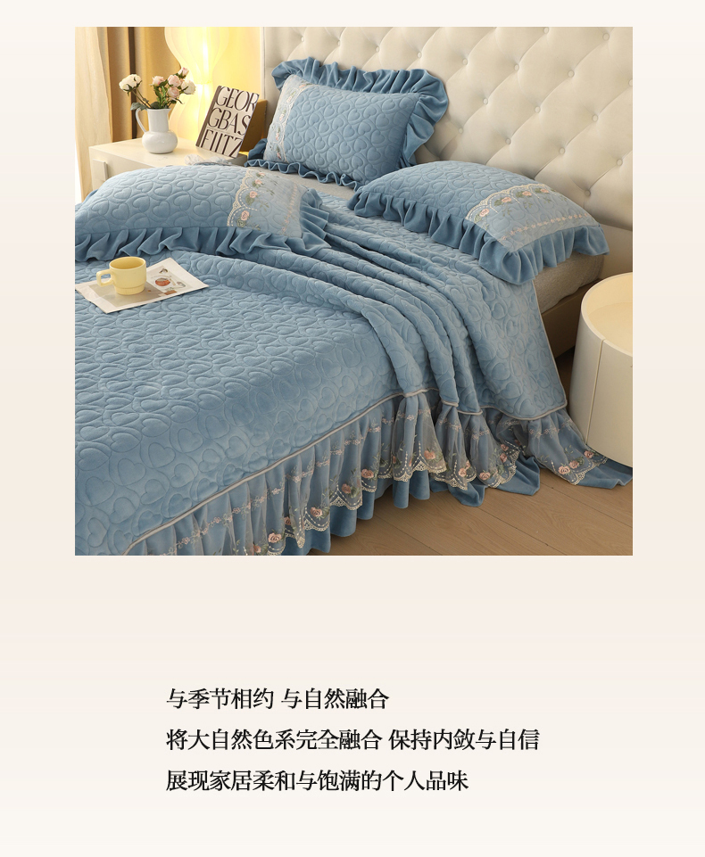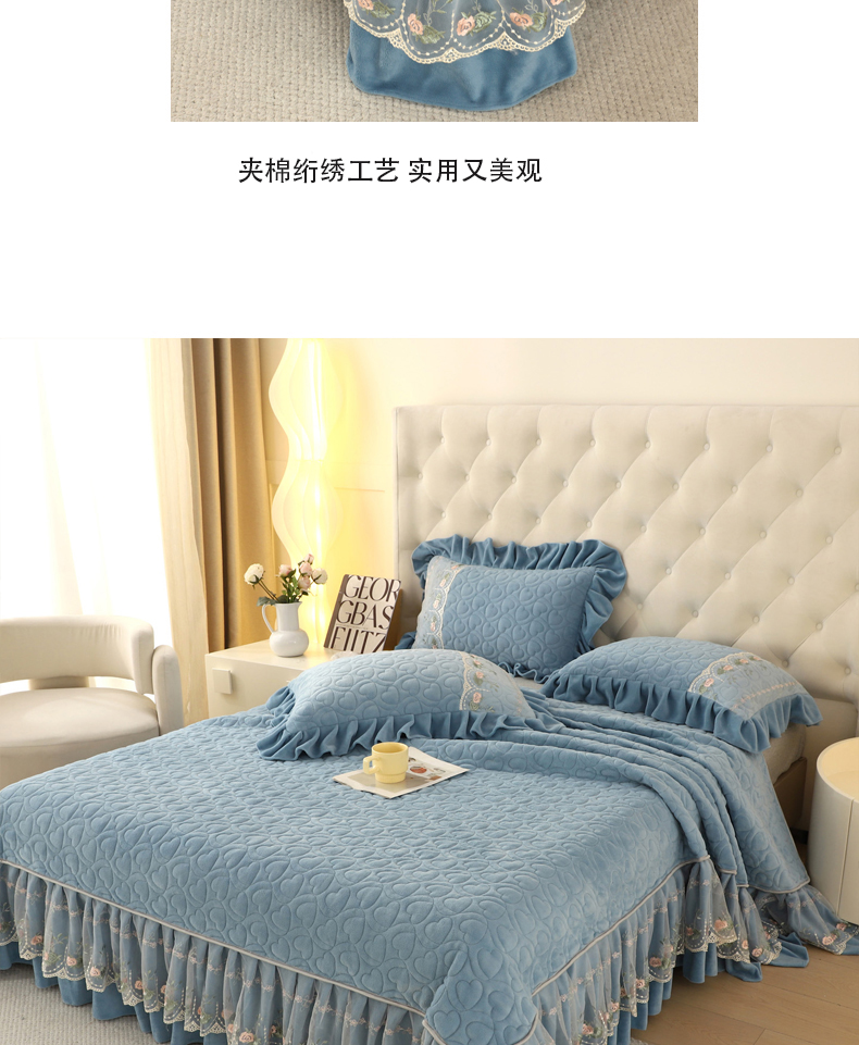 (总)能好家纺 2025新款蕾丝工艺水晶绒夹棉床裙,宝石兰,藏青,豆沙,粉玉,灰,酒红,墨绿,月光蓝