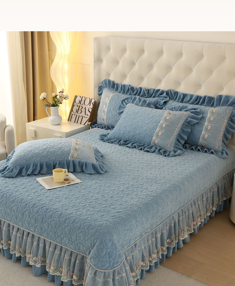 • 91家纺网 家纺一手货源 找家纺 (总)能好家纺 2025新款蕾丝工艺水晶绒夹棉床裙,宝石兰,藏青,豆沙,粉玉,灰,酒红,墨绿,月光蓝