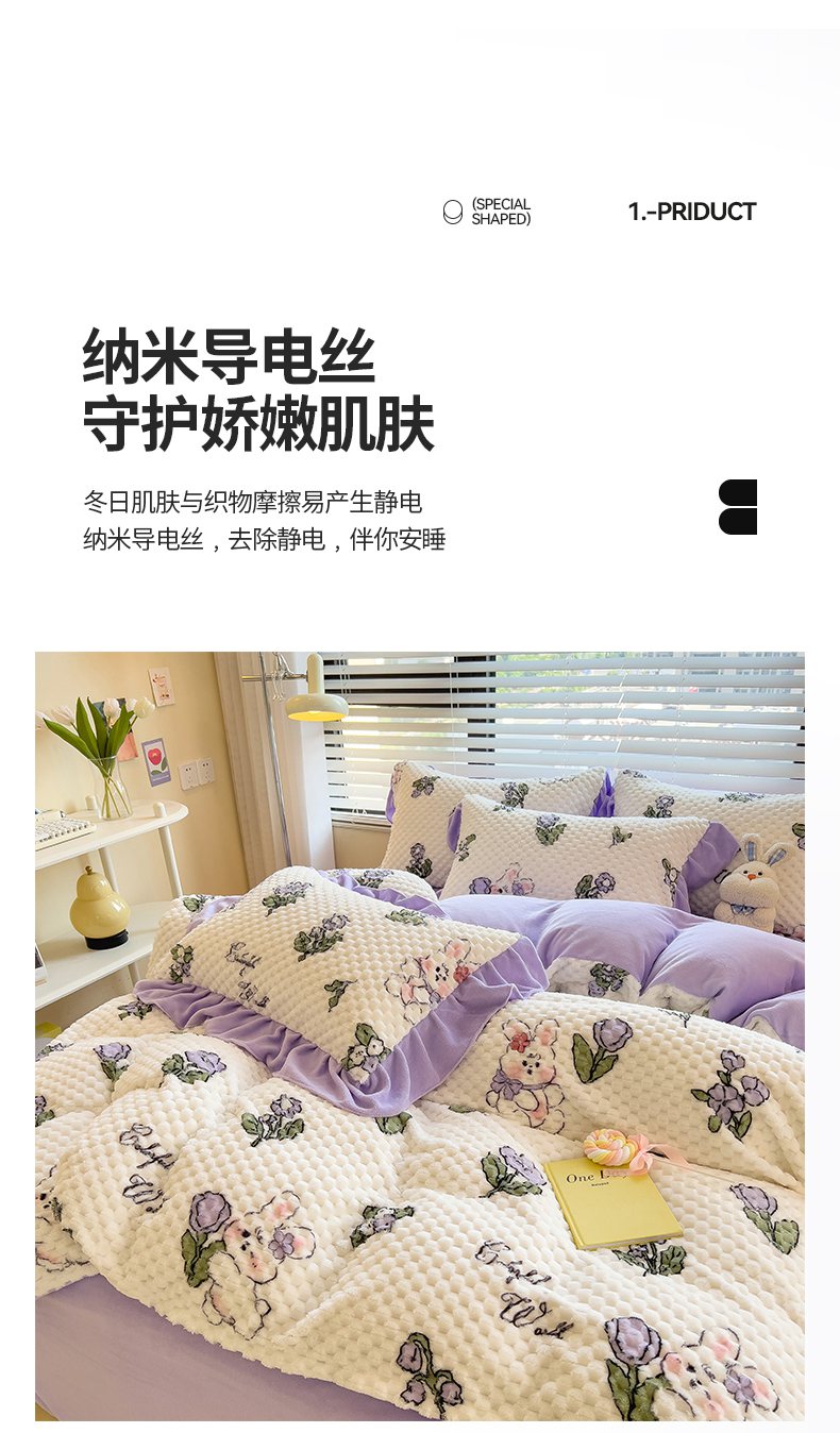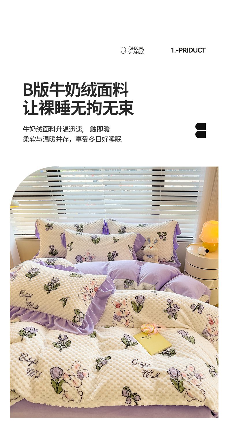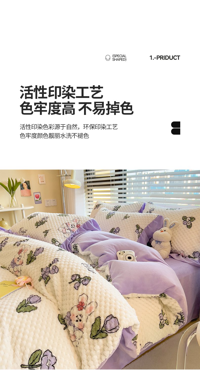 商品名称:摩妮卡 2025新款提花豆豆绒卡通印花牛奶绒四件套 梦幻小兔
