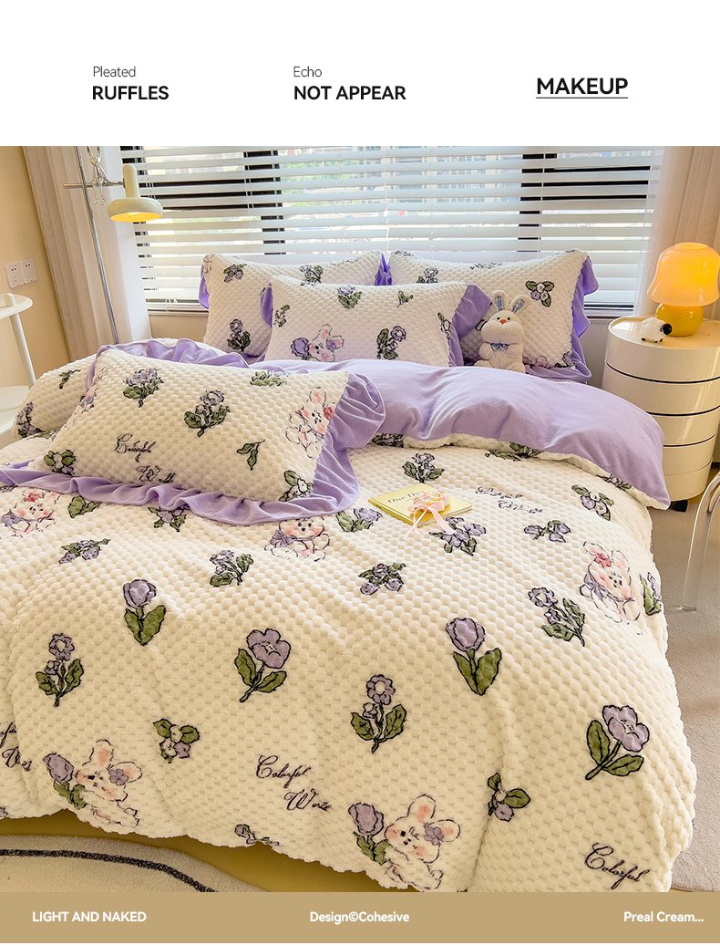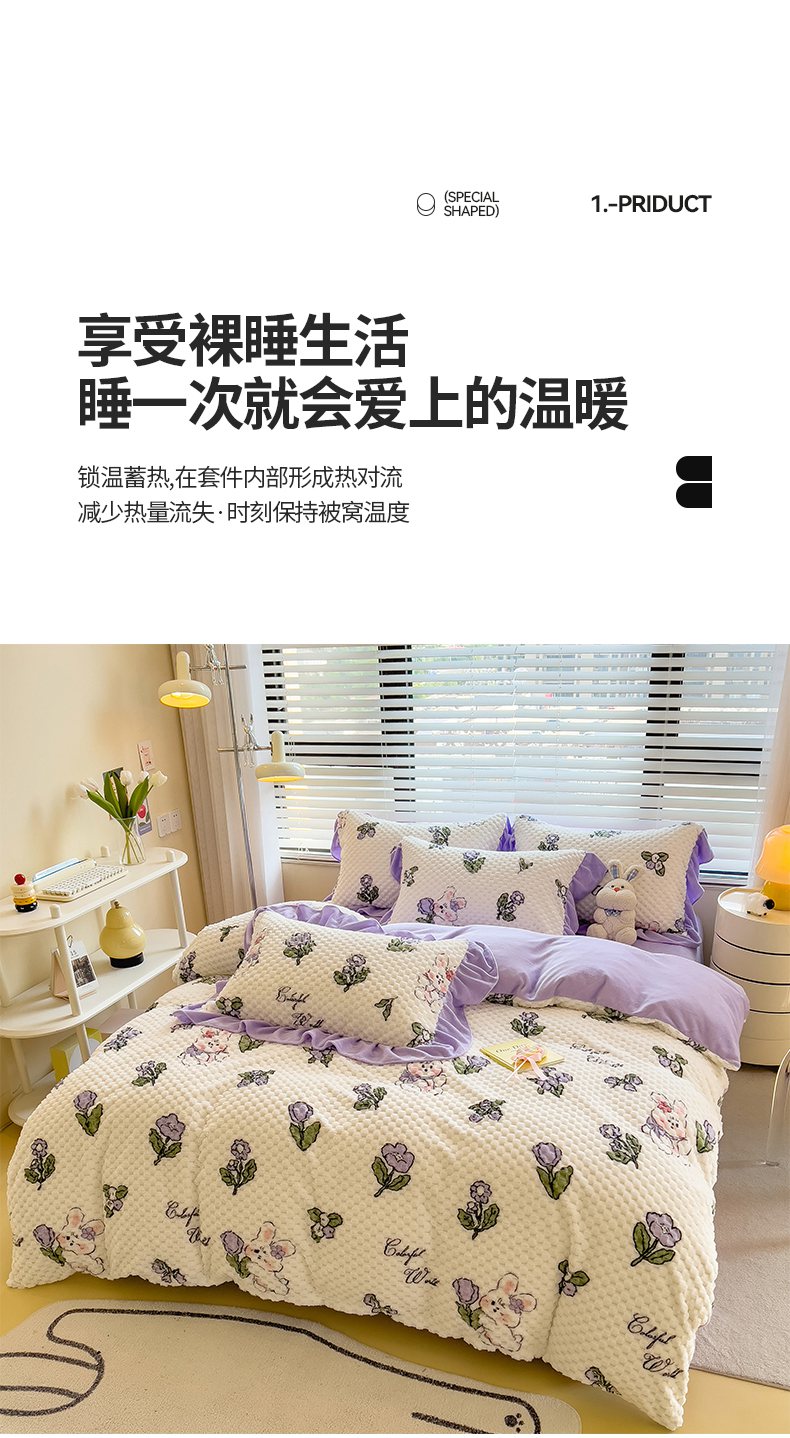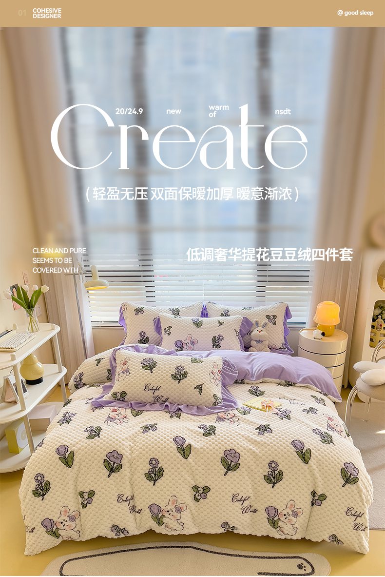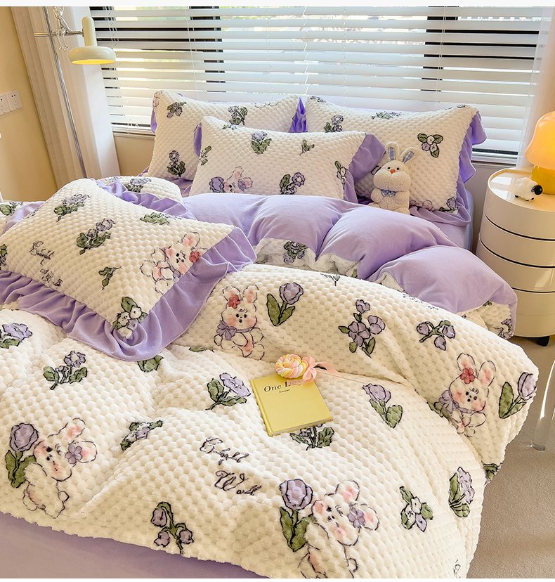 商品名称:摩妮卡 2025新款提花豆豆绒卡通印花牛奶绒四件套 梦幻小兔