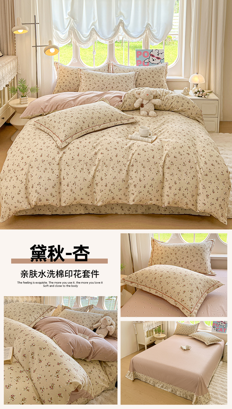 当前位置: 91家纺网 > 商品网购 > 床品套件 > 四件套 > 水洗棉四件套 > 韩后家纺 2025新款水洗棉印花系列四件套 黛秋-杏
