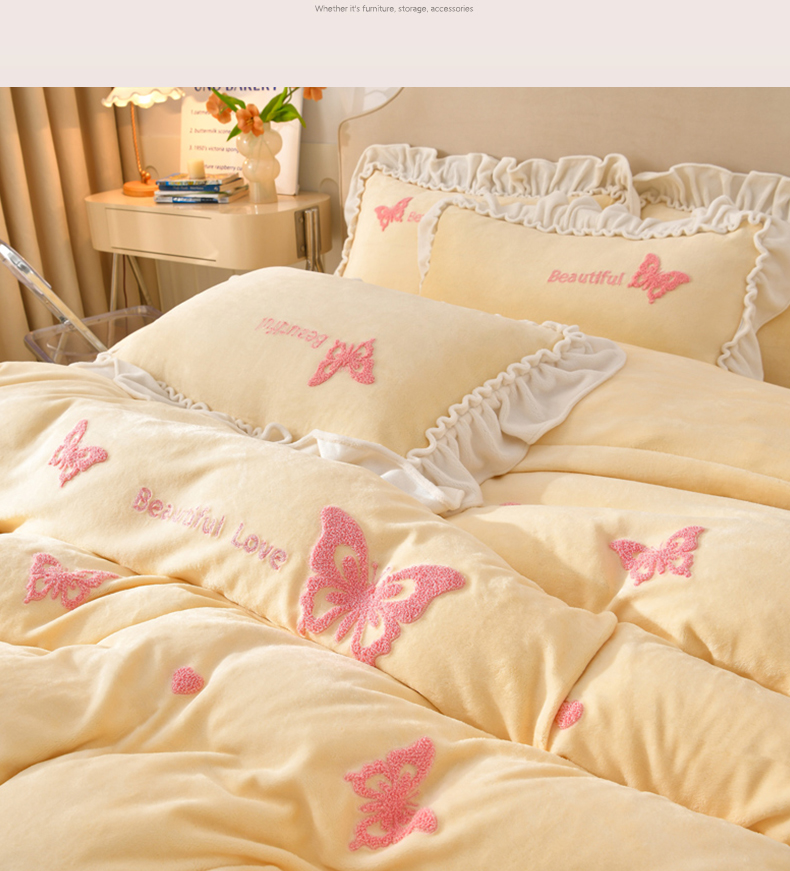 梦之星 2025新款9斤毛巾绣韩式花边牛奶绒四件套 蝴蝶-淡黄