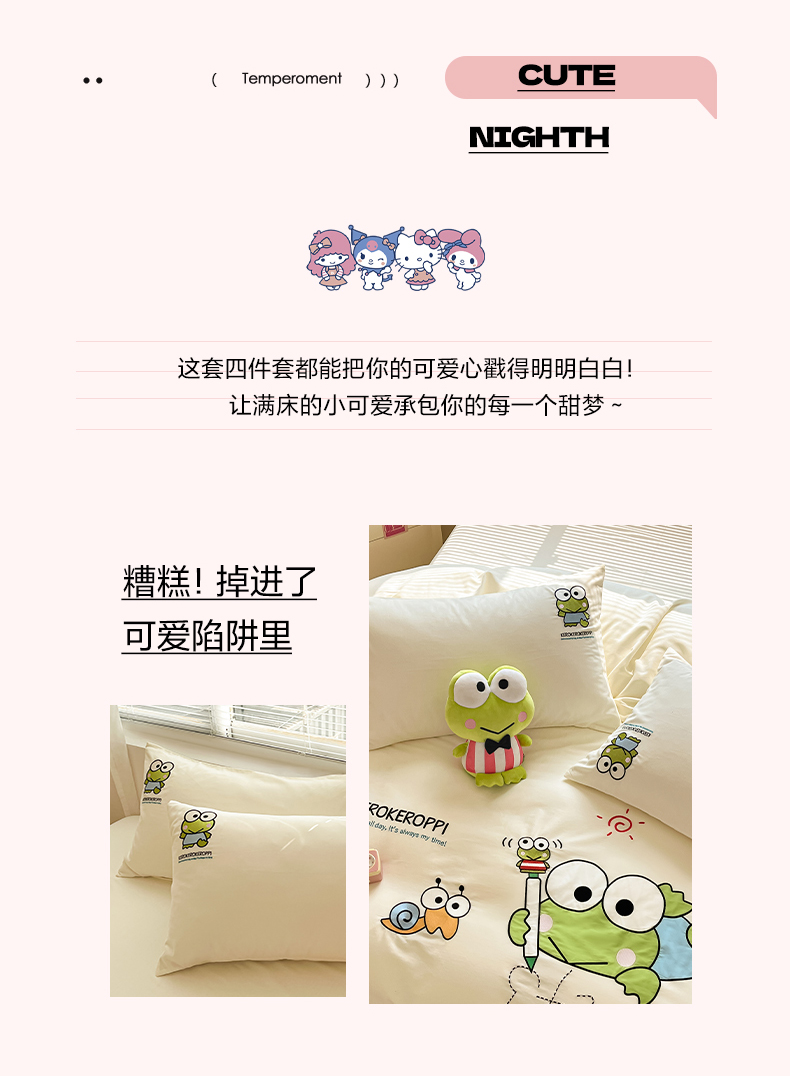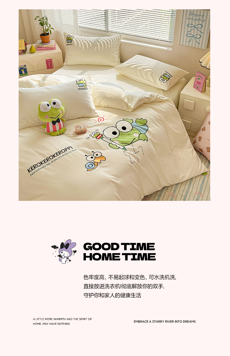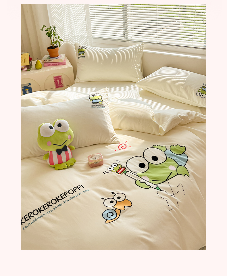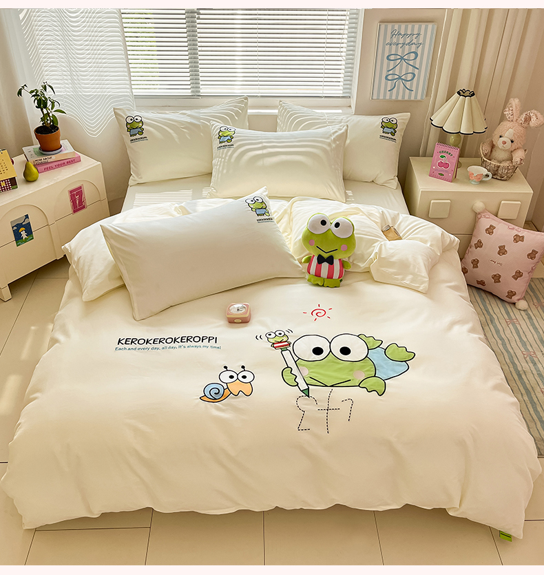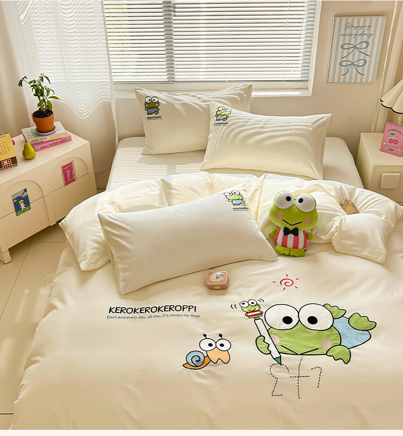 当前位置: 91家纺网 > 商品网购 > 床品套件 > 四件套 > 全棉普通四件套 > 蓝邻家纺 2025年新款全棉纯棉云柔棉三丽鸥刺绣四件套系列 元气大眼蛙