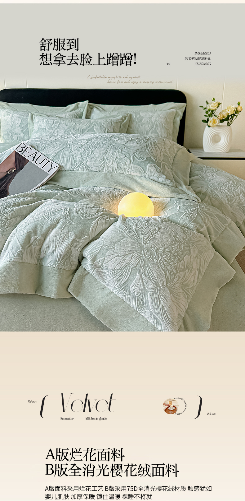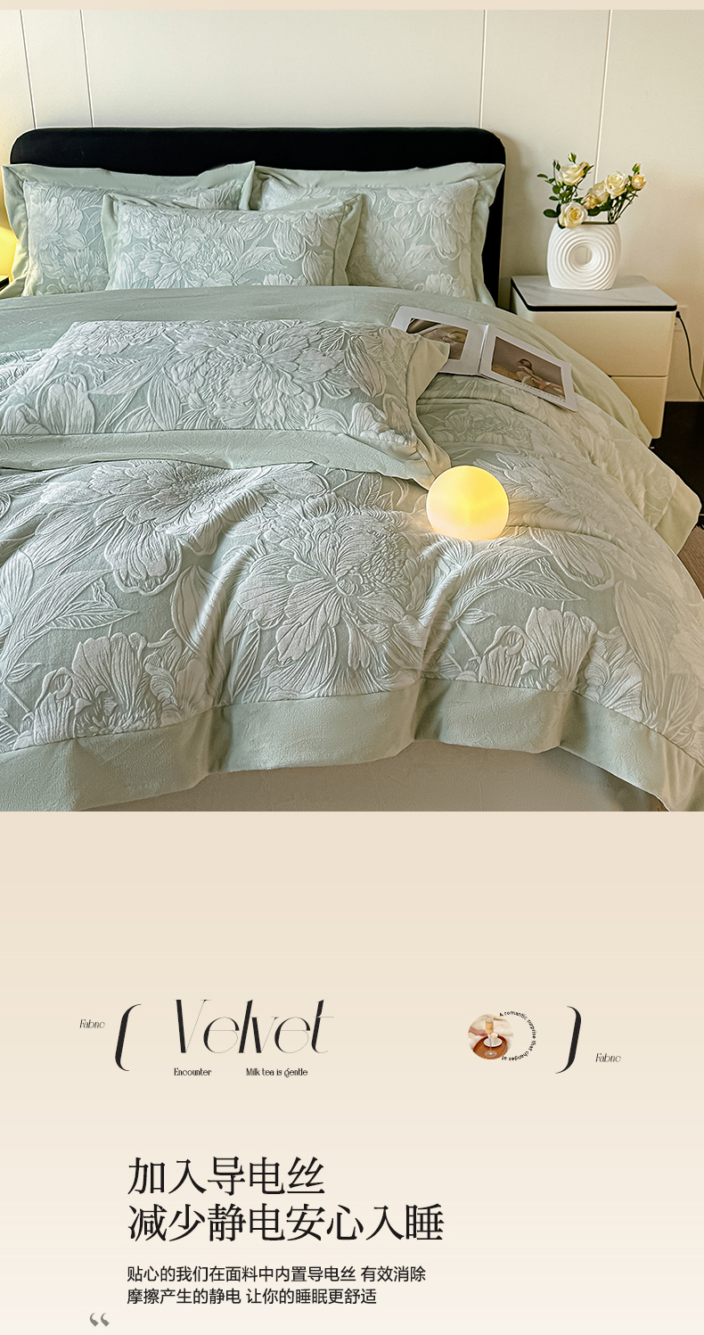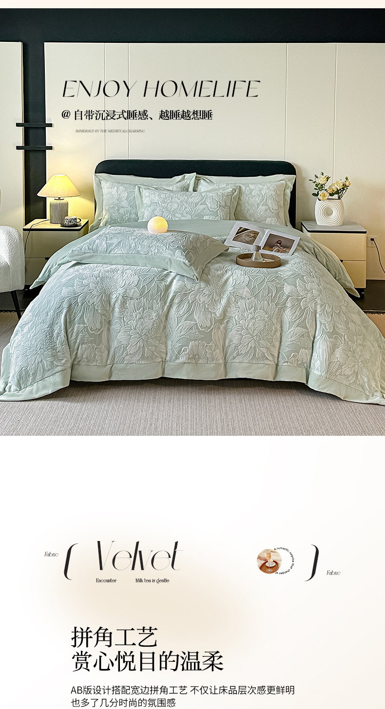 商品名称:锦铭源家纺 2025新款烂花75D全消光超柔樱花绒牛奶绒四件套拼角四件套【有买家秀】 繁花织梦-浅绿