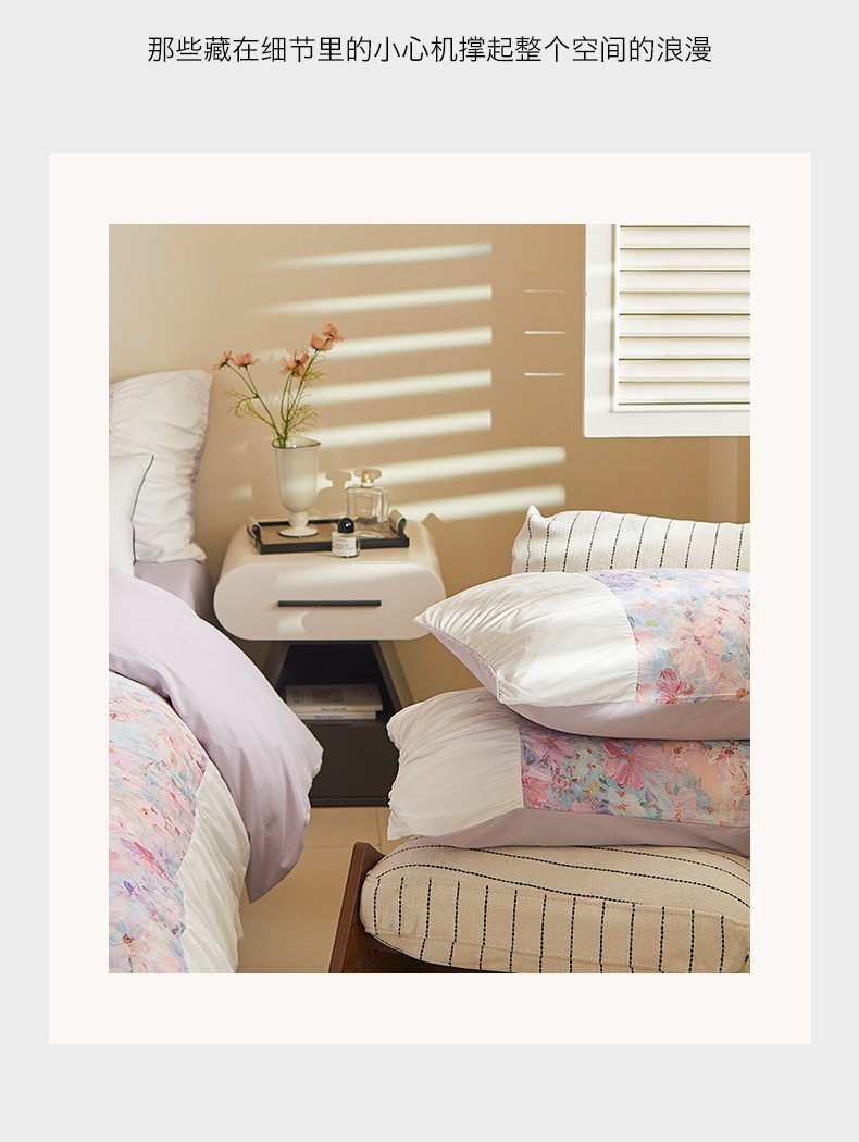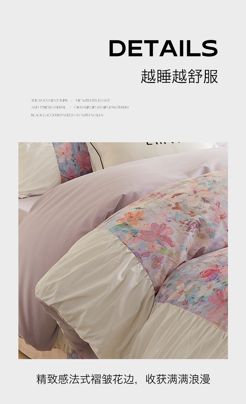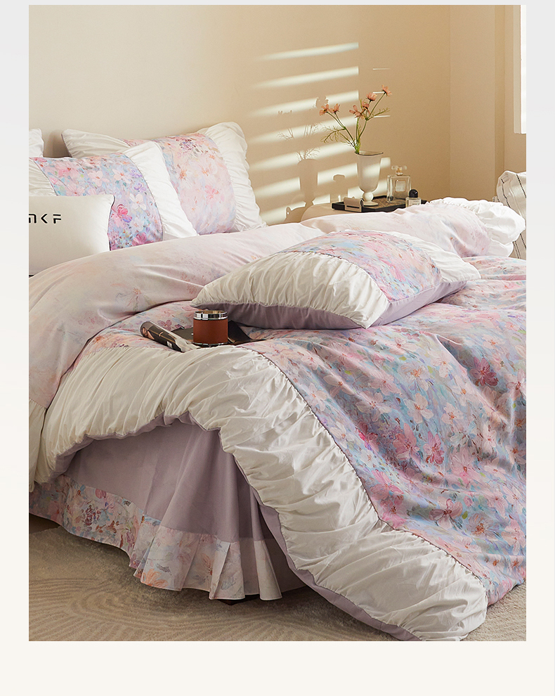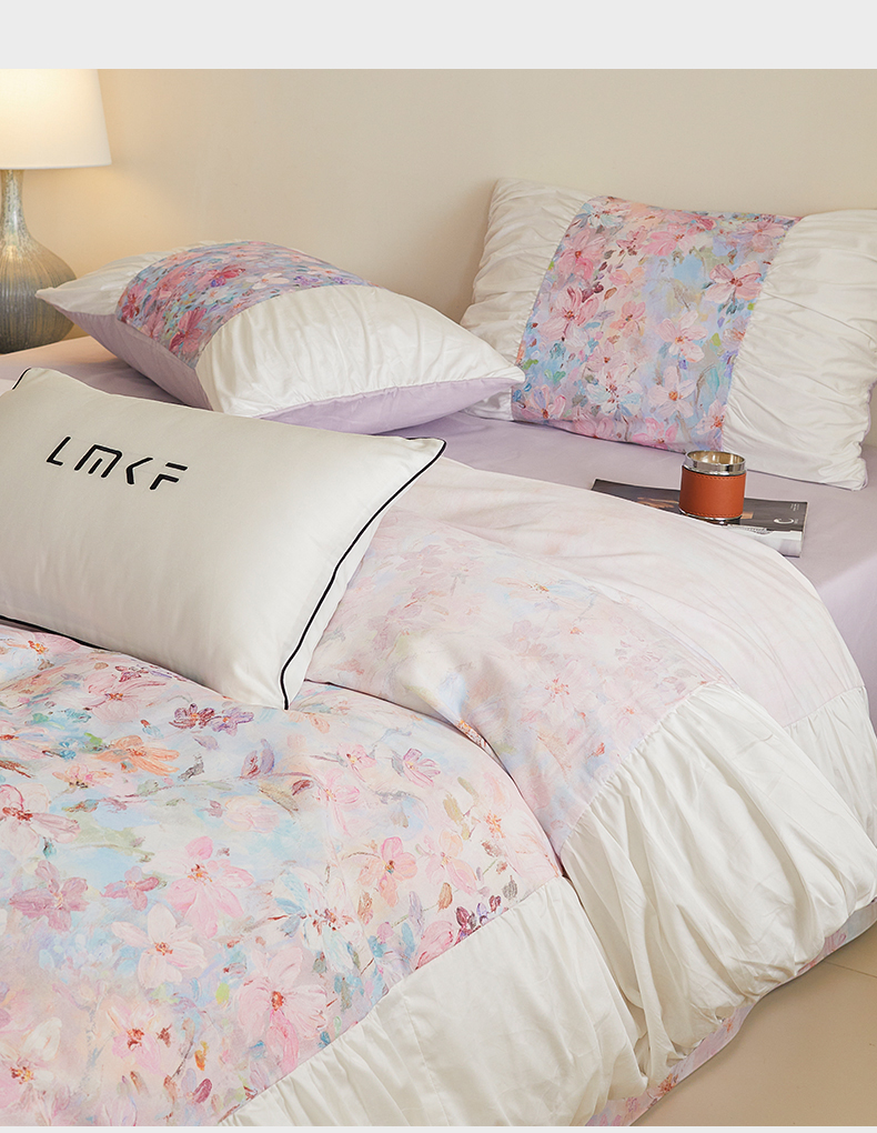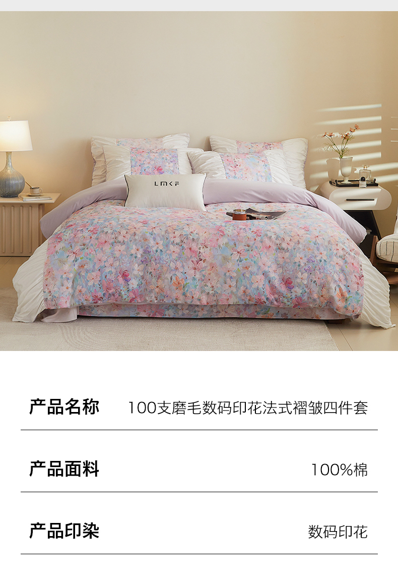 商品名称:蓝米卡夫 2025秋冬-A类全棉50S*50S双股磨毛数码印花法式褶皱花边款(礼盒包装)-拍摄风格1 笔触与诗-粉