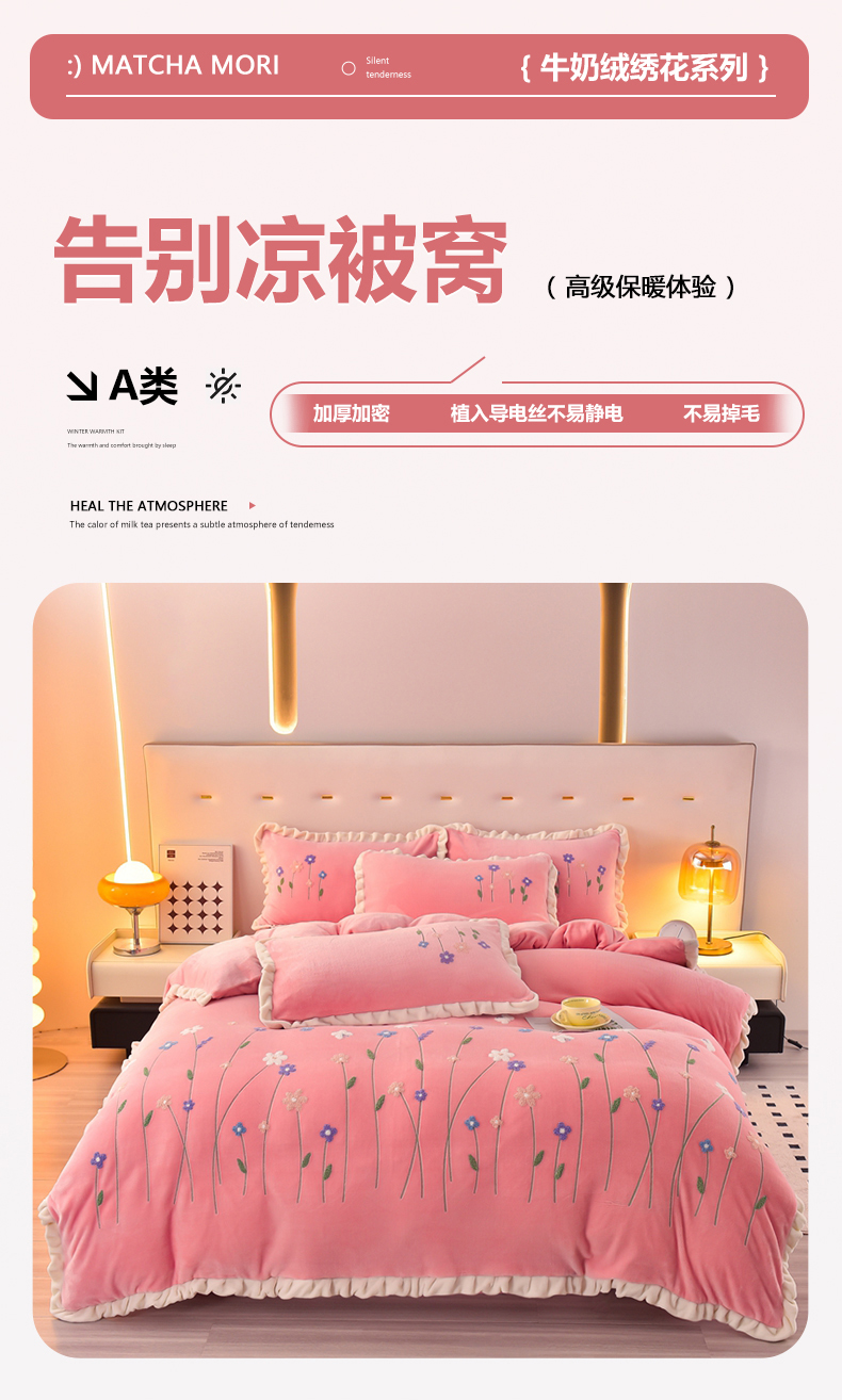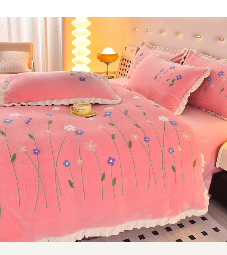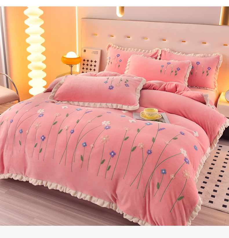 畅畅家纺 2025新款A类亲肤舒适高克重牛奶绒绣花系列冬季四件套-繁花似锦 繁花似锦-樱桃粉
