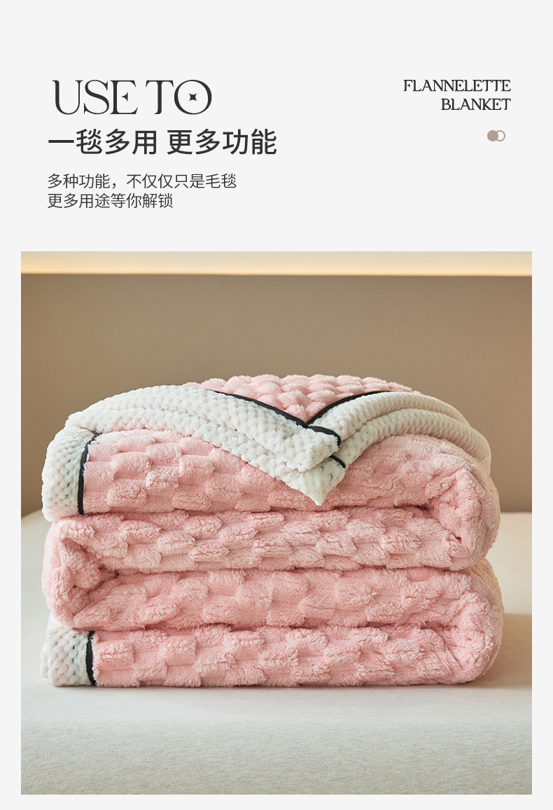商品名称:莱家富 2026新款跨境外贸金龟绒多功能毛毯高克重法莱绒牛奶绒保暖毛毯(支持抽空压缩,卷包) 嫩粉