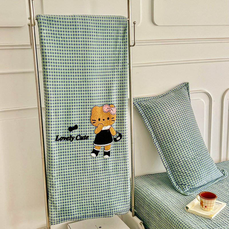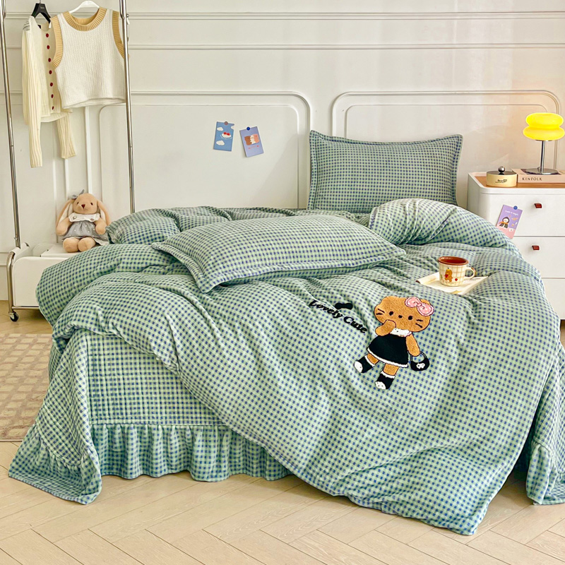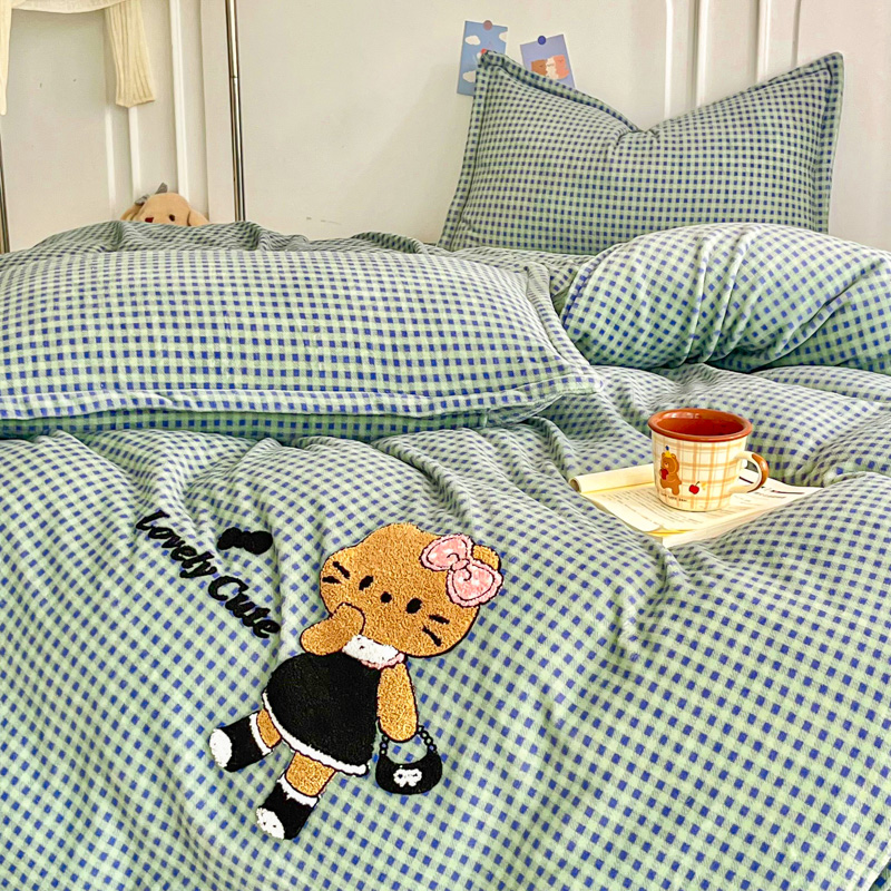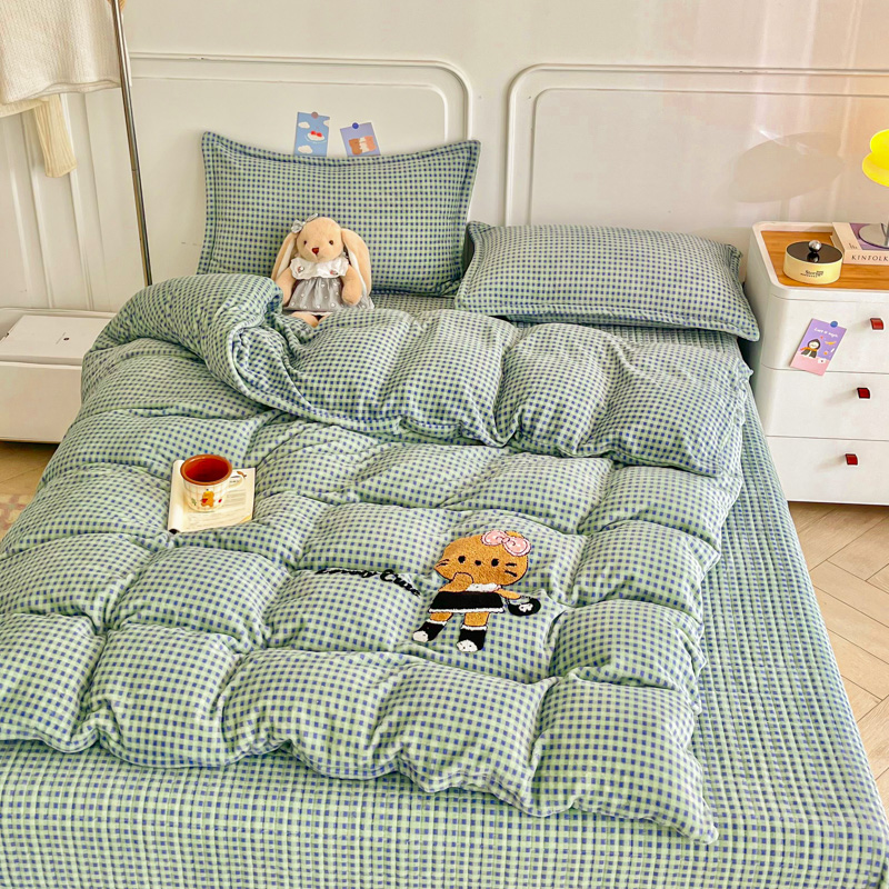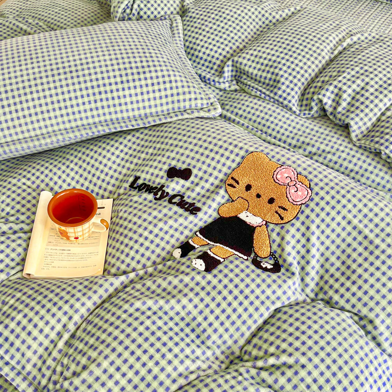 尚美 2025爆款格子系列印加绣牛奶绒床盖四件套 兰格猫咪