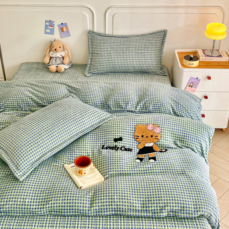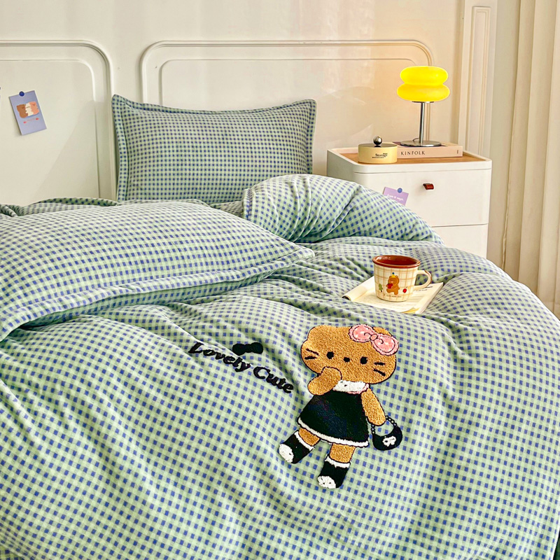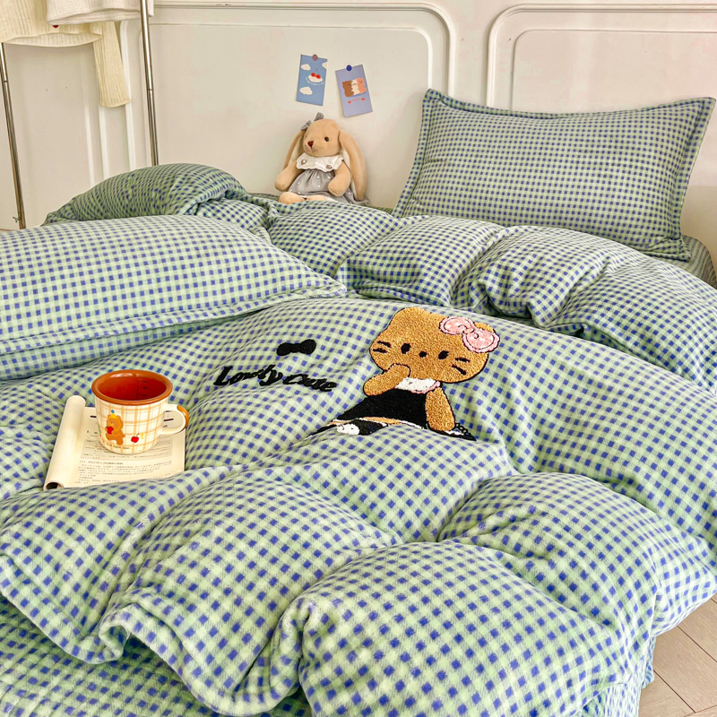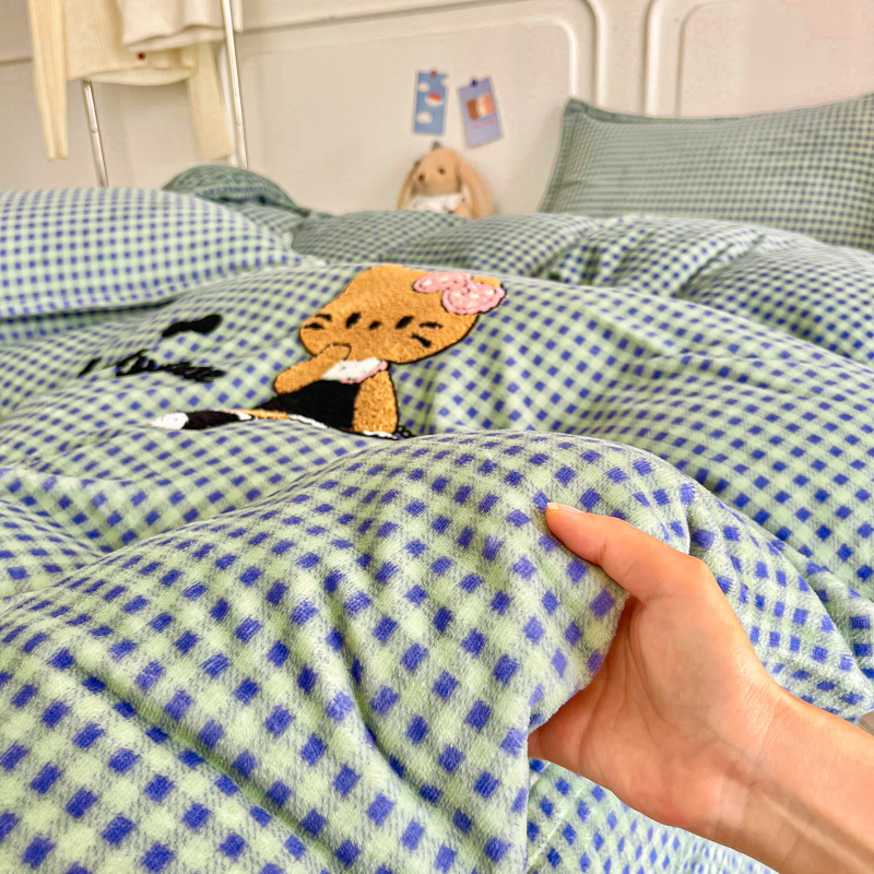 商品名称:尚美 2025爆款格子系列印加绣牛奶绒床盖四件套 兰格猫咪