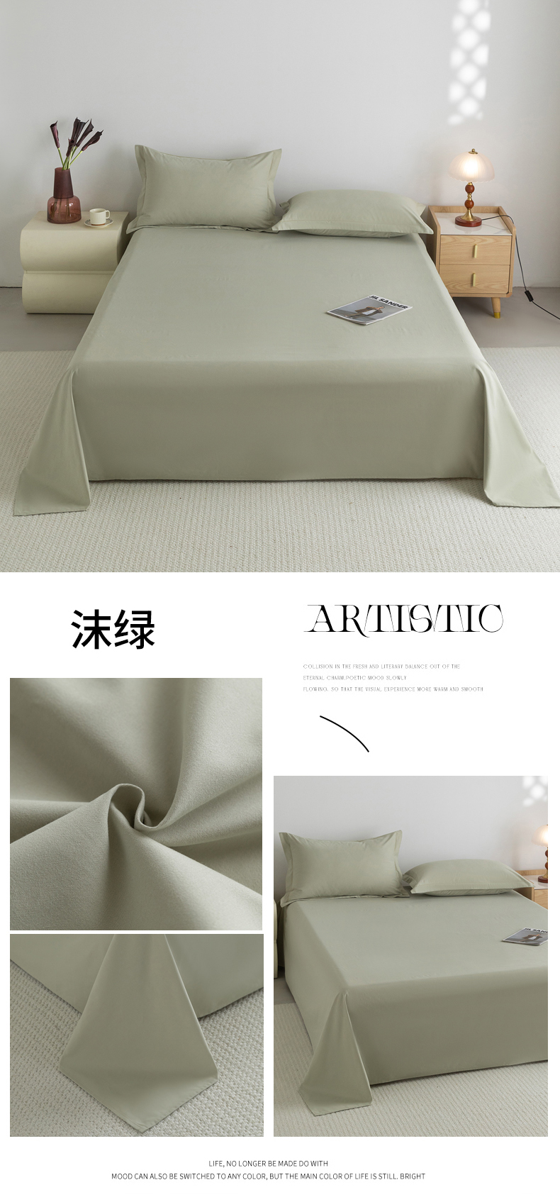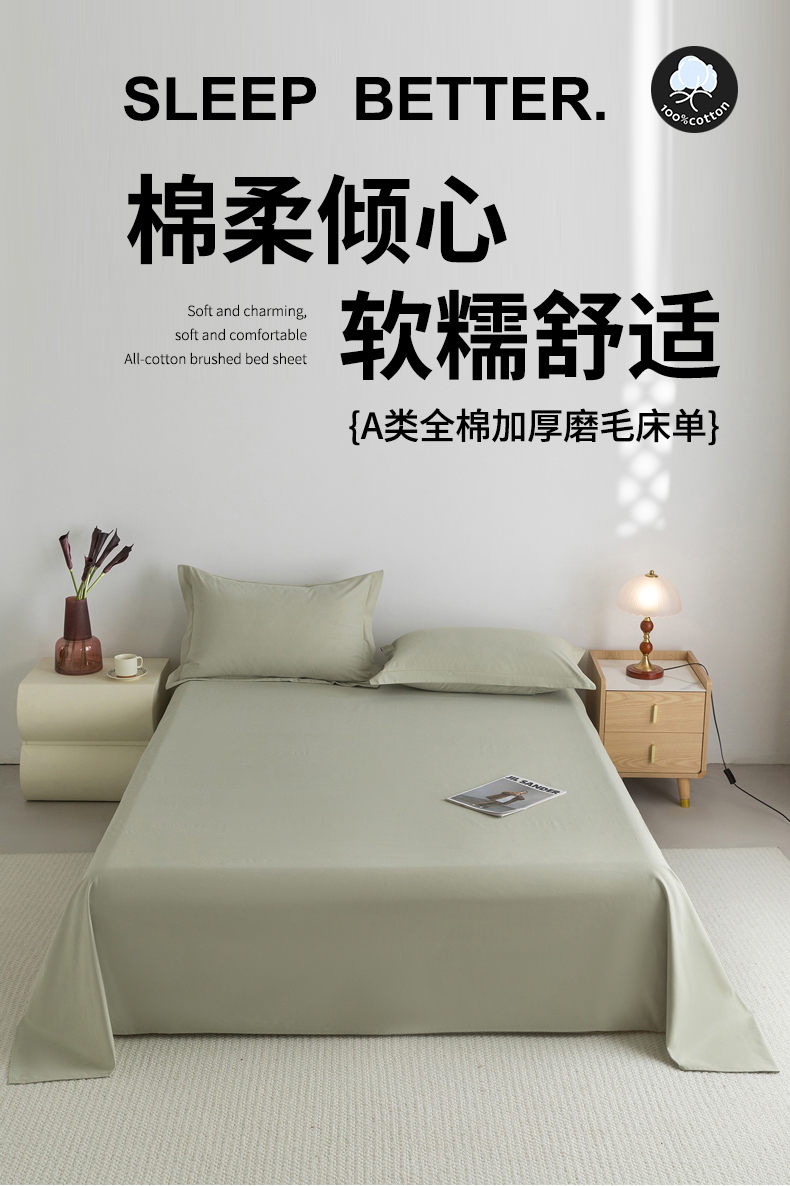 宝时兰 2025新款加厚100%全棉高支高密长绒棉纯色磨毛床单纯棉单件床单-系列二【提供买家秀/可定制其他尺寸】 沫绿