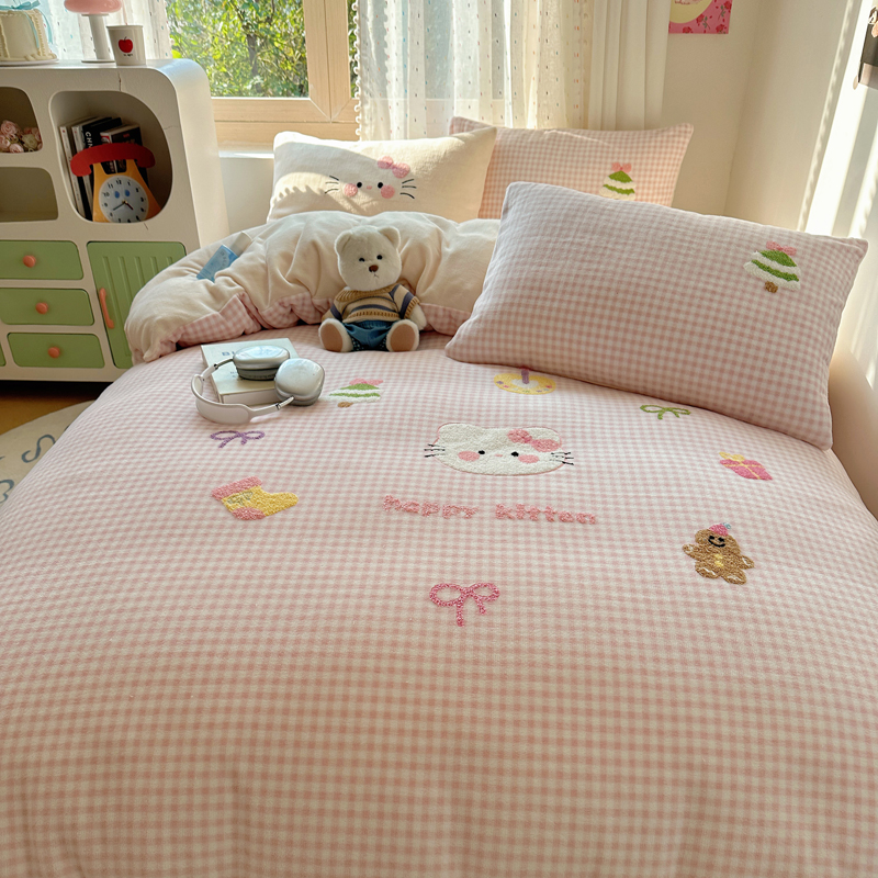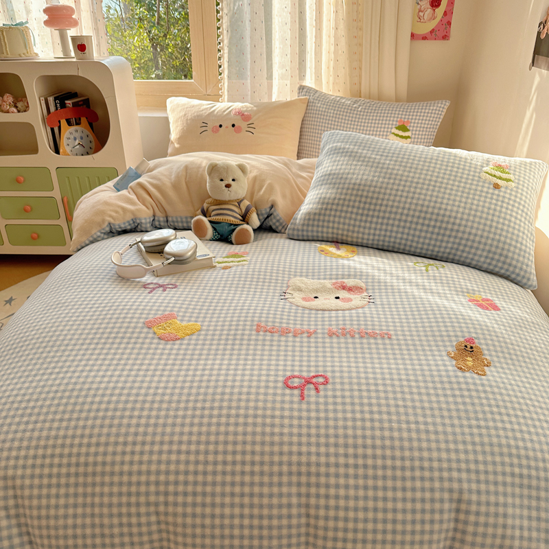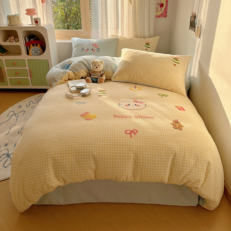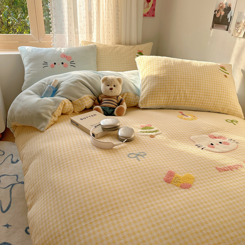 (总)顾里家纺 2024秋冬新款格子猫咪毛巾绣牛奶绒四件套,粉格猫咪,黄格猫咪,咖格猫咪,蓝格猫咪,绿格猫咪