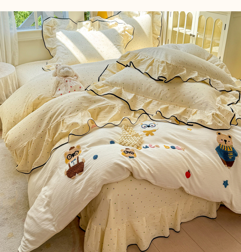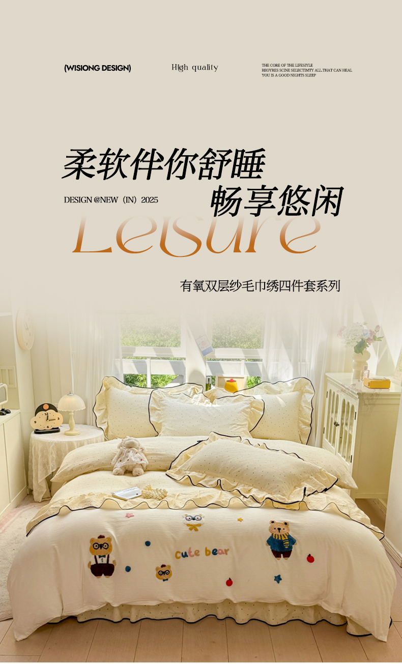 麋兔 2025新款双层纱毛巾绣花边四件套 熊熊小队