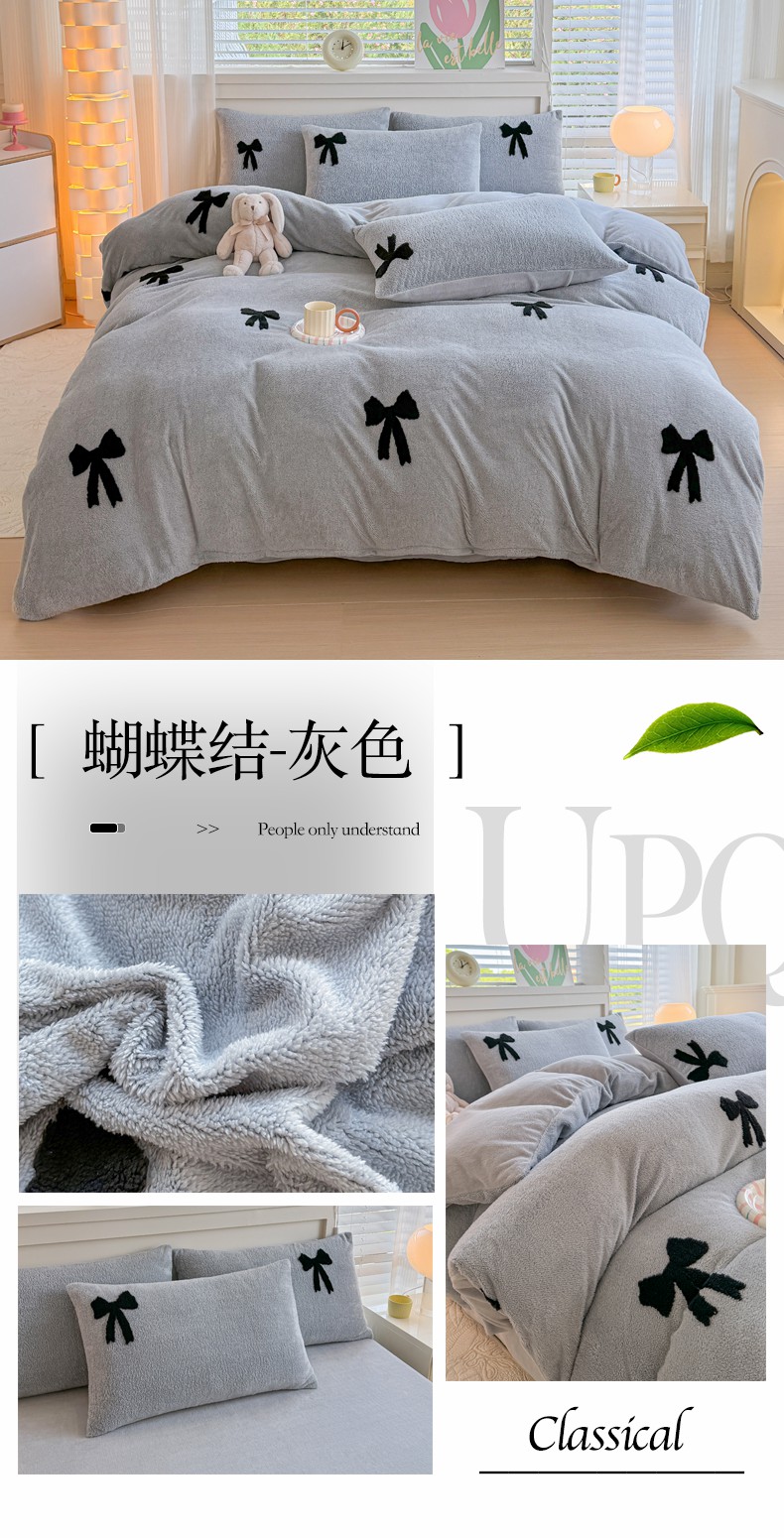 当前位置: 91家纺网 > 商品网购 > 床品套件 > 四件套 > 其它四件套 > 小叮当家纺仓储工厂店 2025新款舒棉绒提花绣花四件套 舒棉绒提花-蝴蝶结灰色