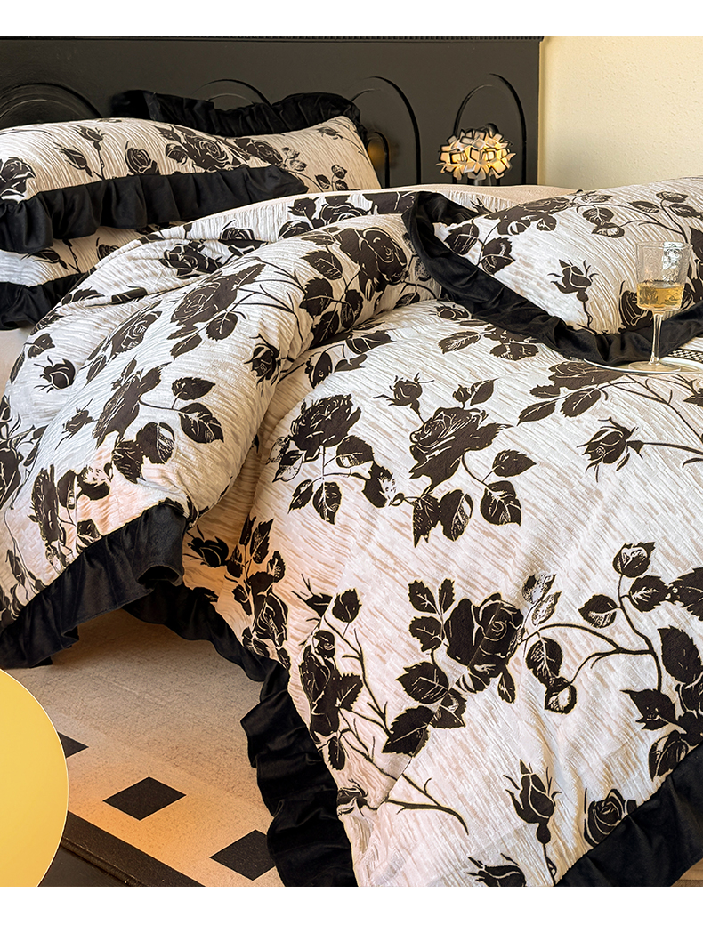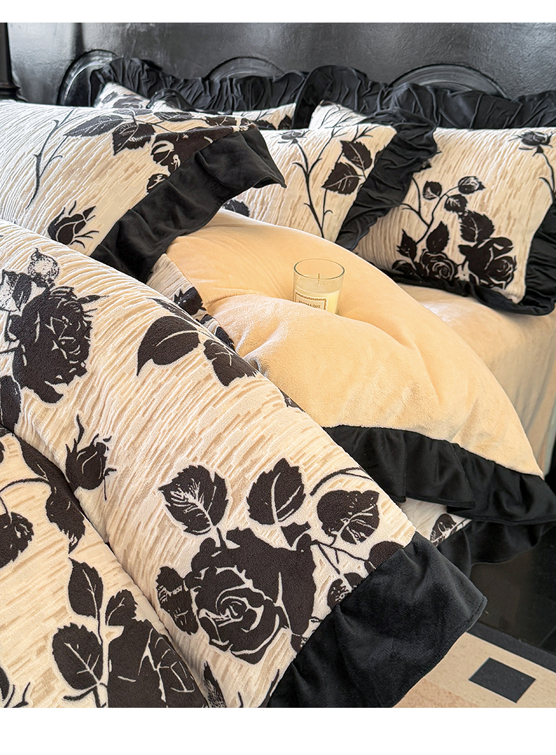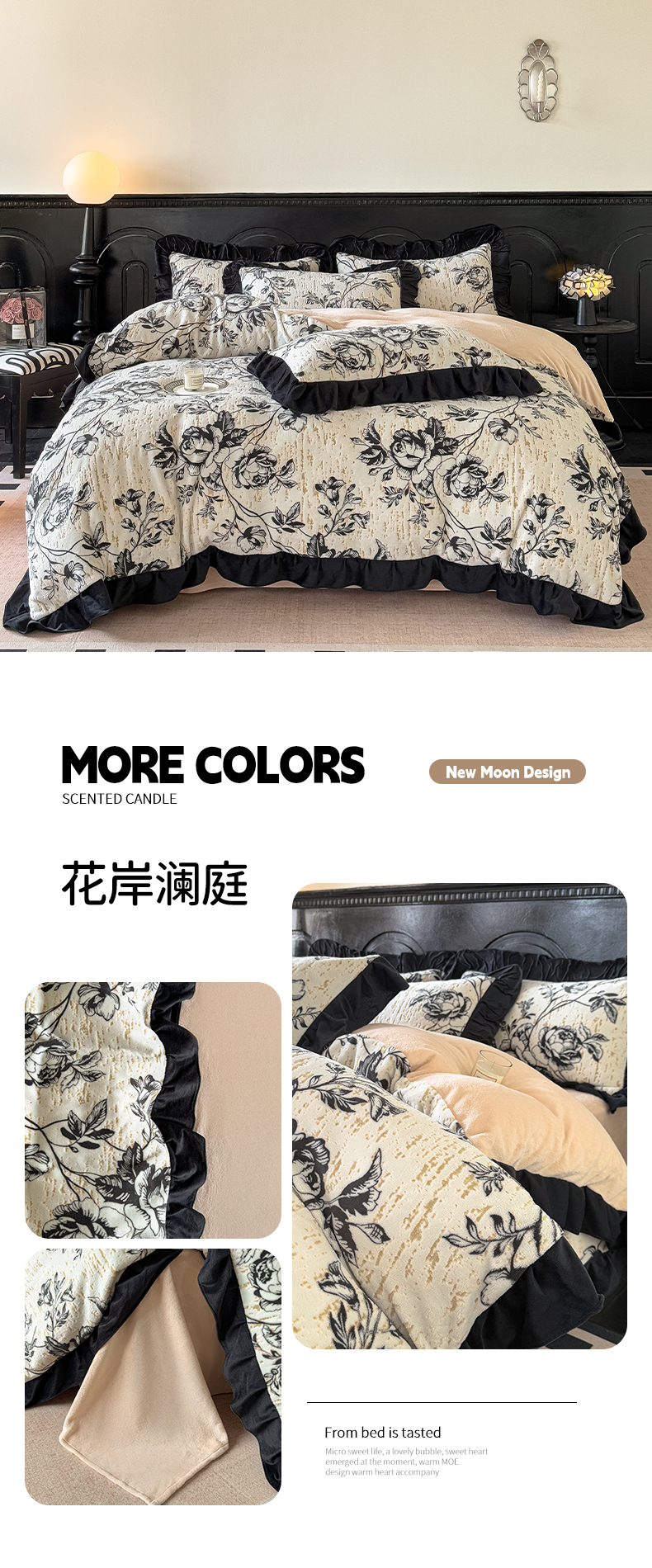 宅家居 2025新款热卖热款轻法式复古赫本风绒高克重浮雕花牛奶绒四件套烂花韩版黑色花边三件套 夜半花香