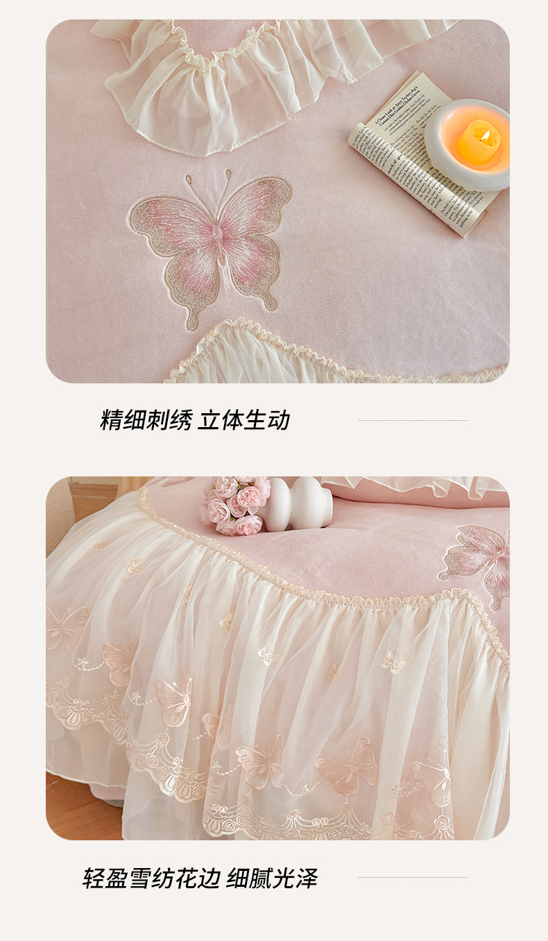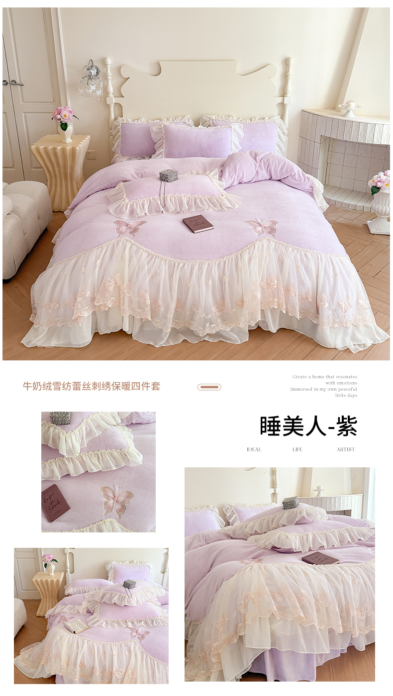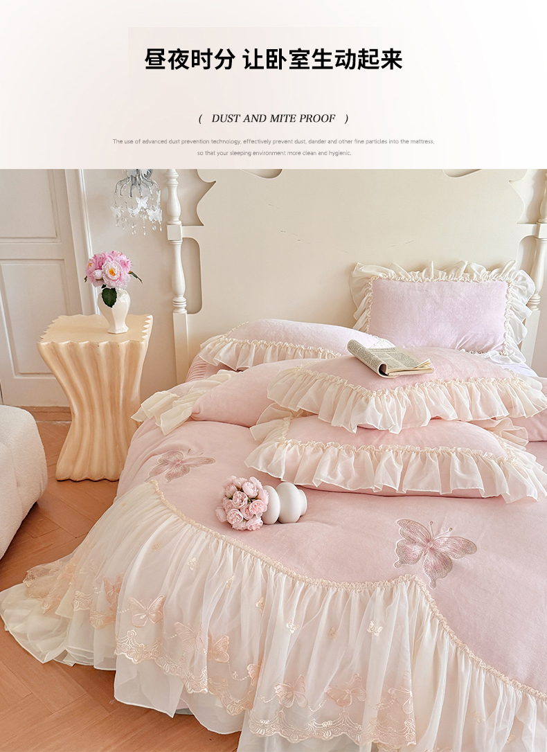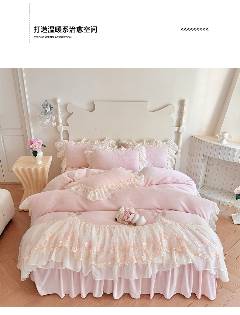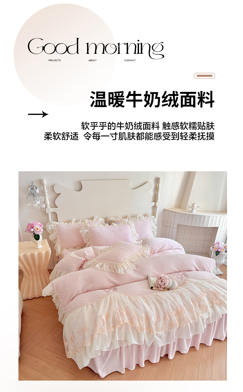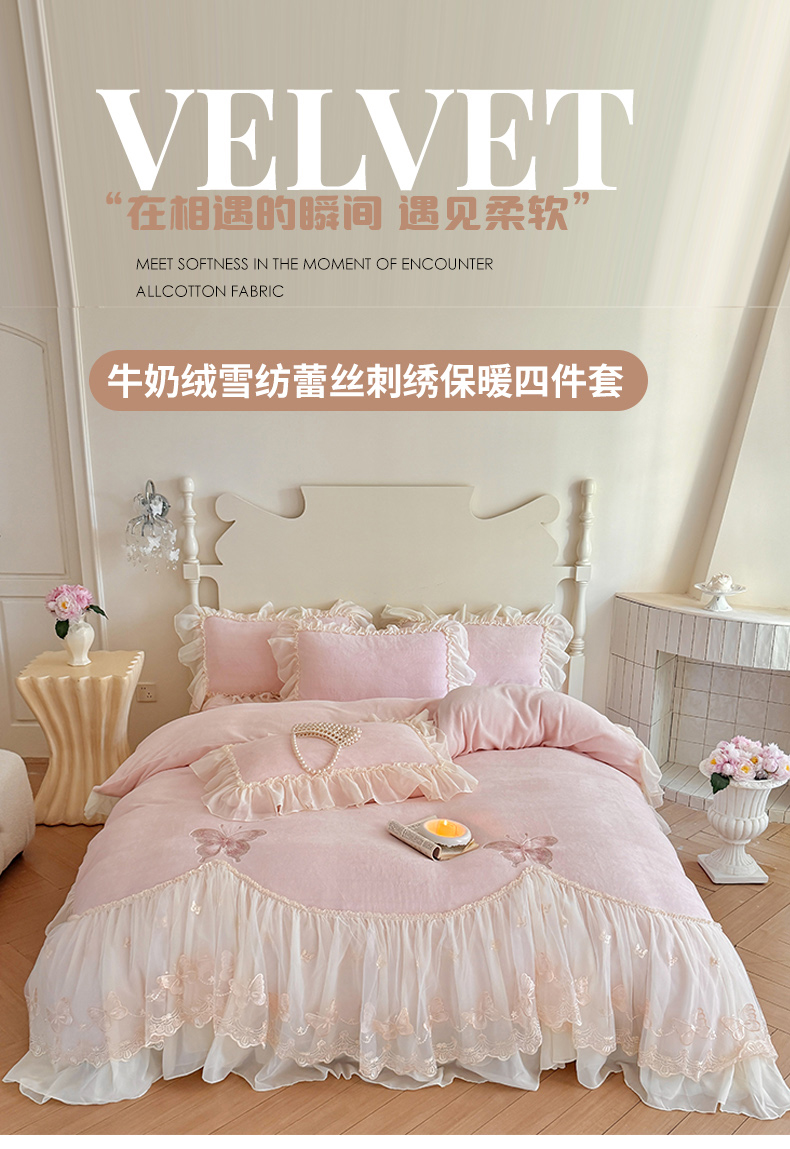 当前位置: 91家纺网 > 商品网购 > 床品套件 > 四件套 > 牛奶绒四件套 > 富盛家纺 2025新款牛奶绒床裙款蕾丝刺绣四件套韩版法式公主风--睡美人系列 睡美人-粉