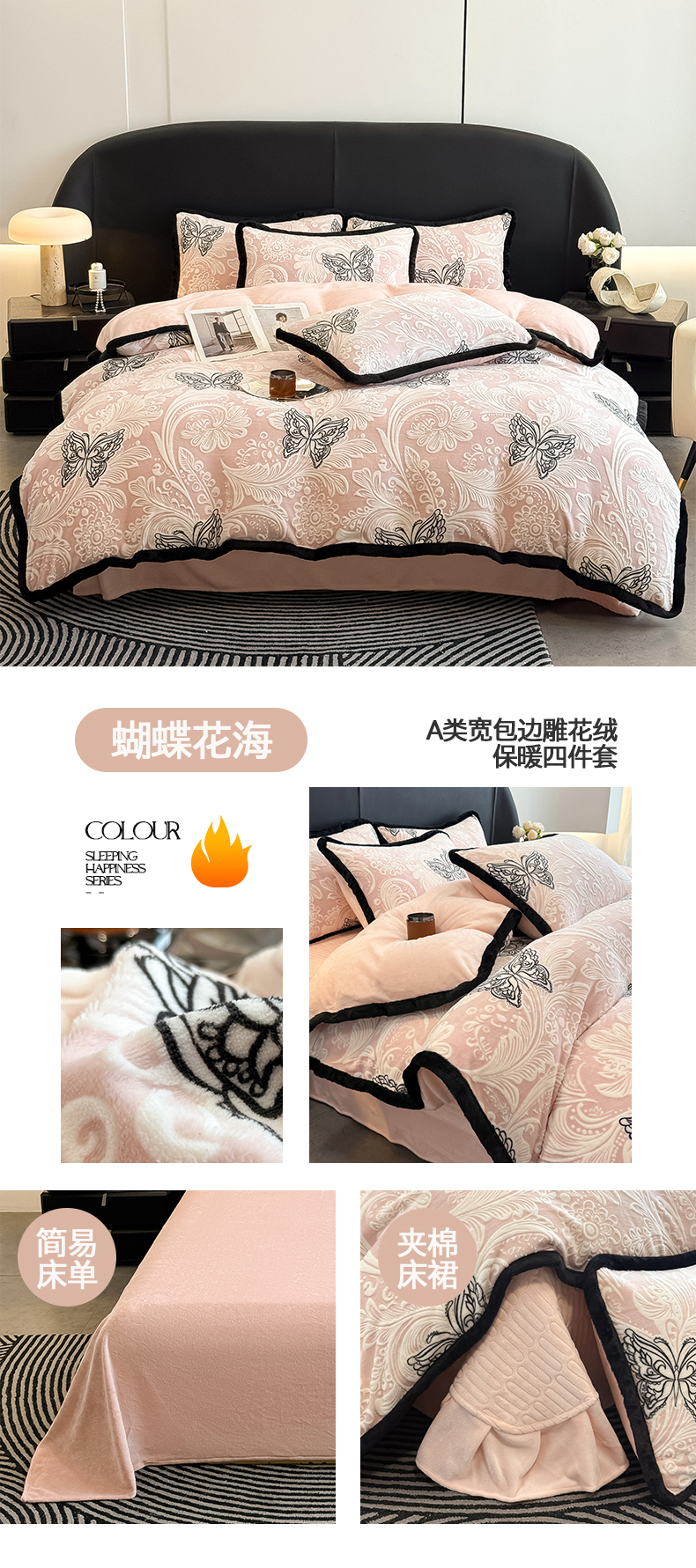 当前位置: 91家纺网 > 商品网购 > 床品套件 > 四件套 > 其它四件套 > 懒猫家纺 2025新款宽包边雕花绒四件套 蝴蝶花海