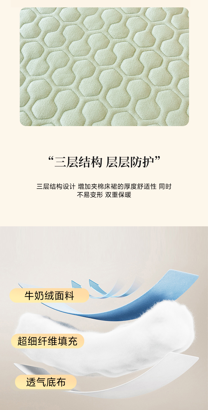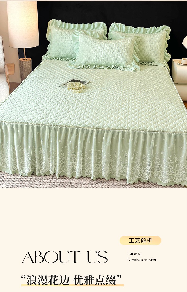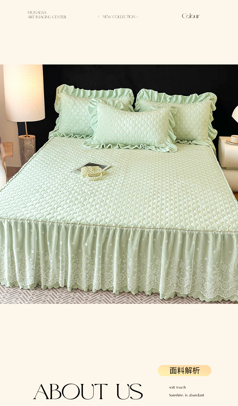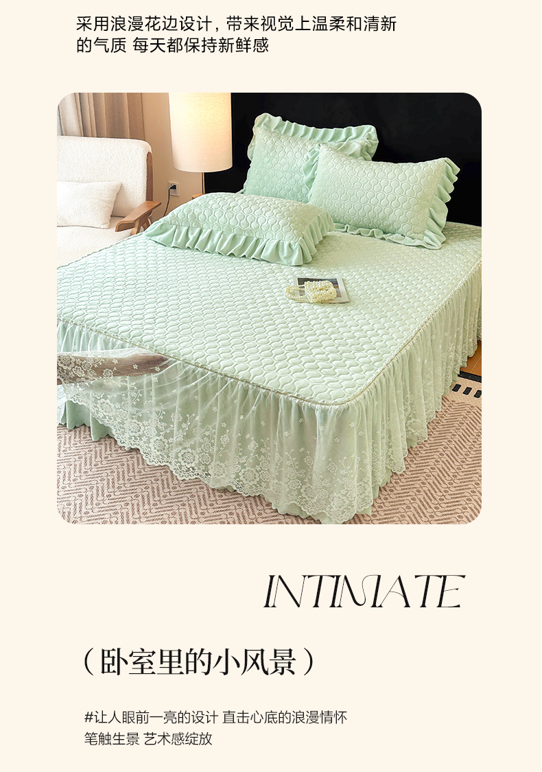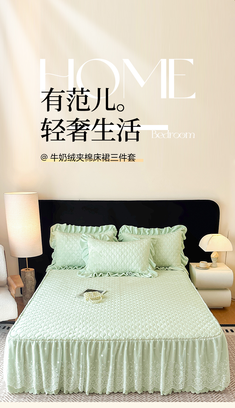 当前位置: 91家纺网 > 商品网购 > 床品套件 > 三件套 > 民新家纺 2025新款牛奶绒夹棉床裙三件套 浪漫时光-浅绿