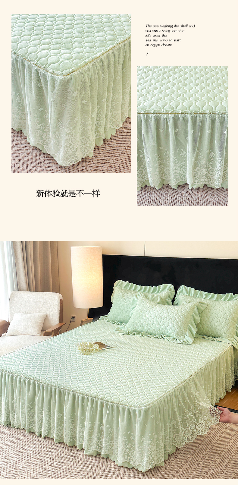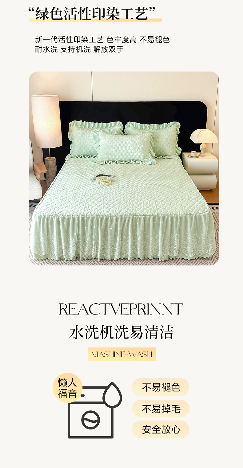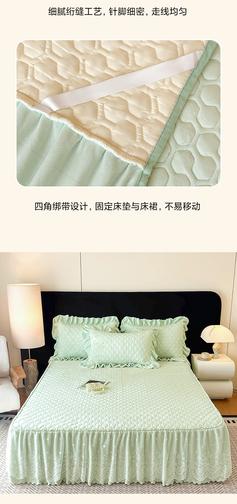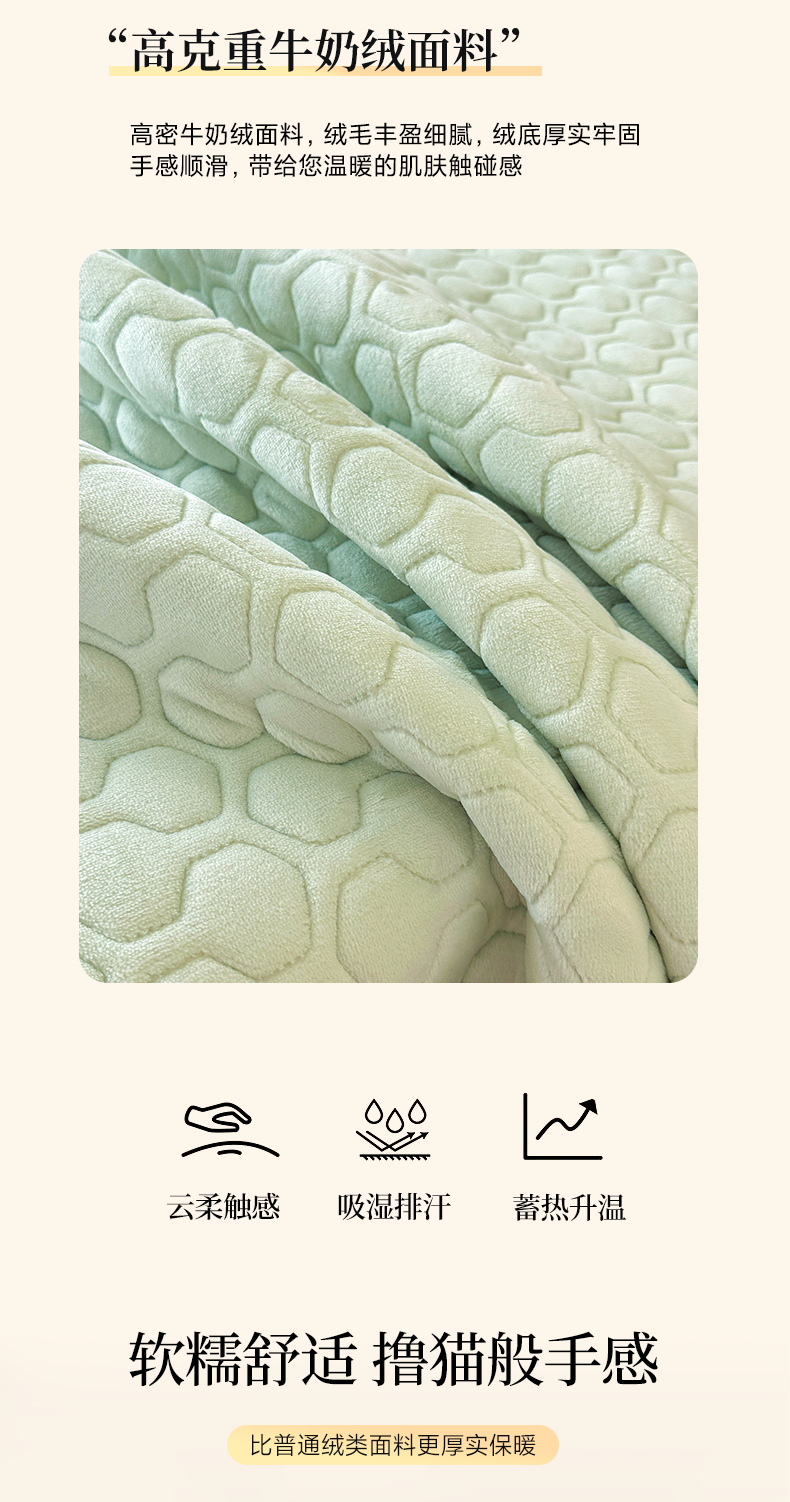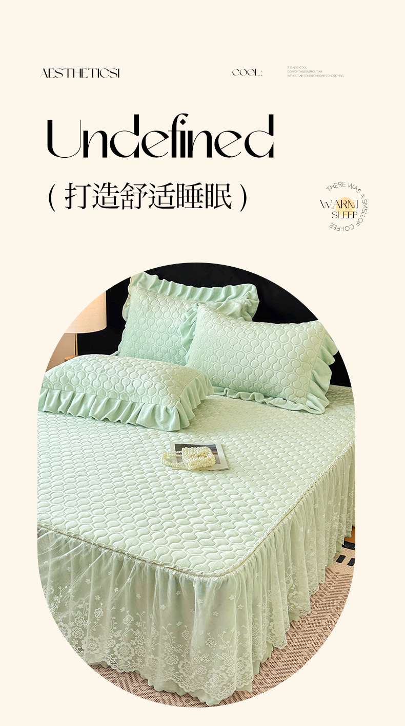 当前位置: 91家纺网 > 商品网购 > 床品套件 > 三件套 > 民新家纺 2025新款牛奶绒夹棉床裙三件套 浪漫时光-浅绿